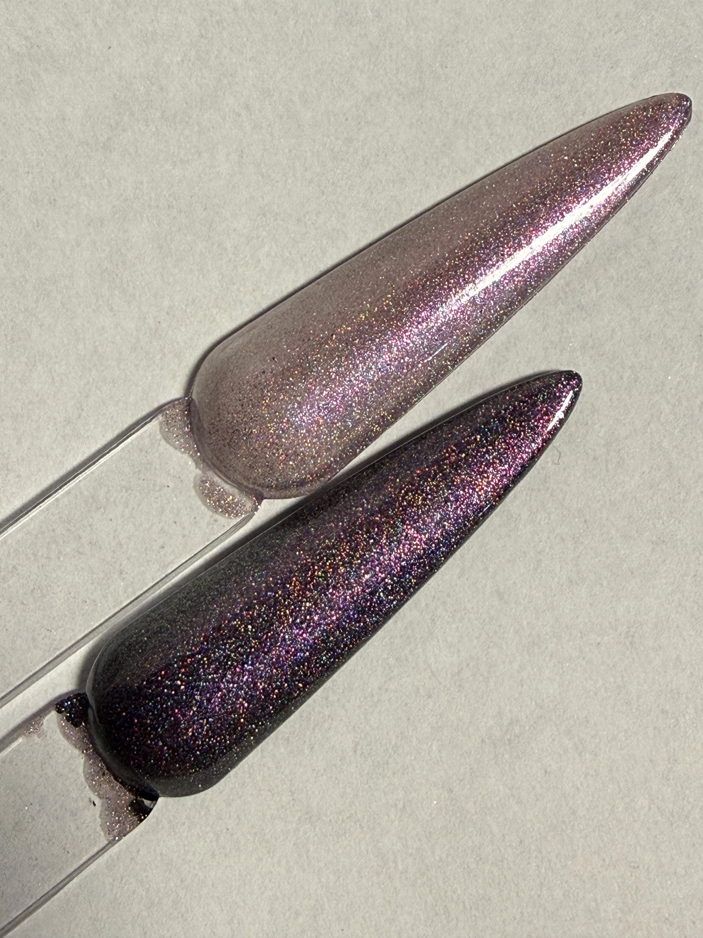 This nail polish comes in either 5 or 15ml bottles and is a magnetic light plum with silver holo mixed in. You will need a magnet to take advantage of the magnetic properties within. It does not come with a magnet but if you'd like me to include one for $1, please check my other listings.