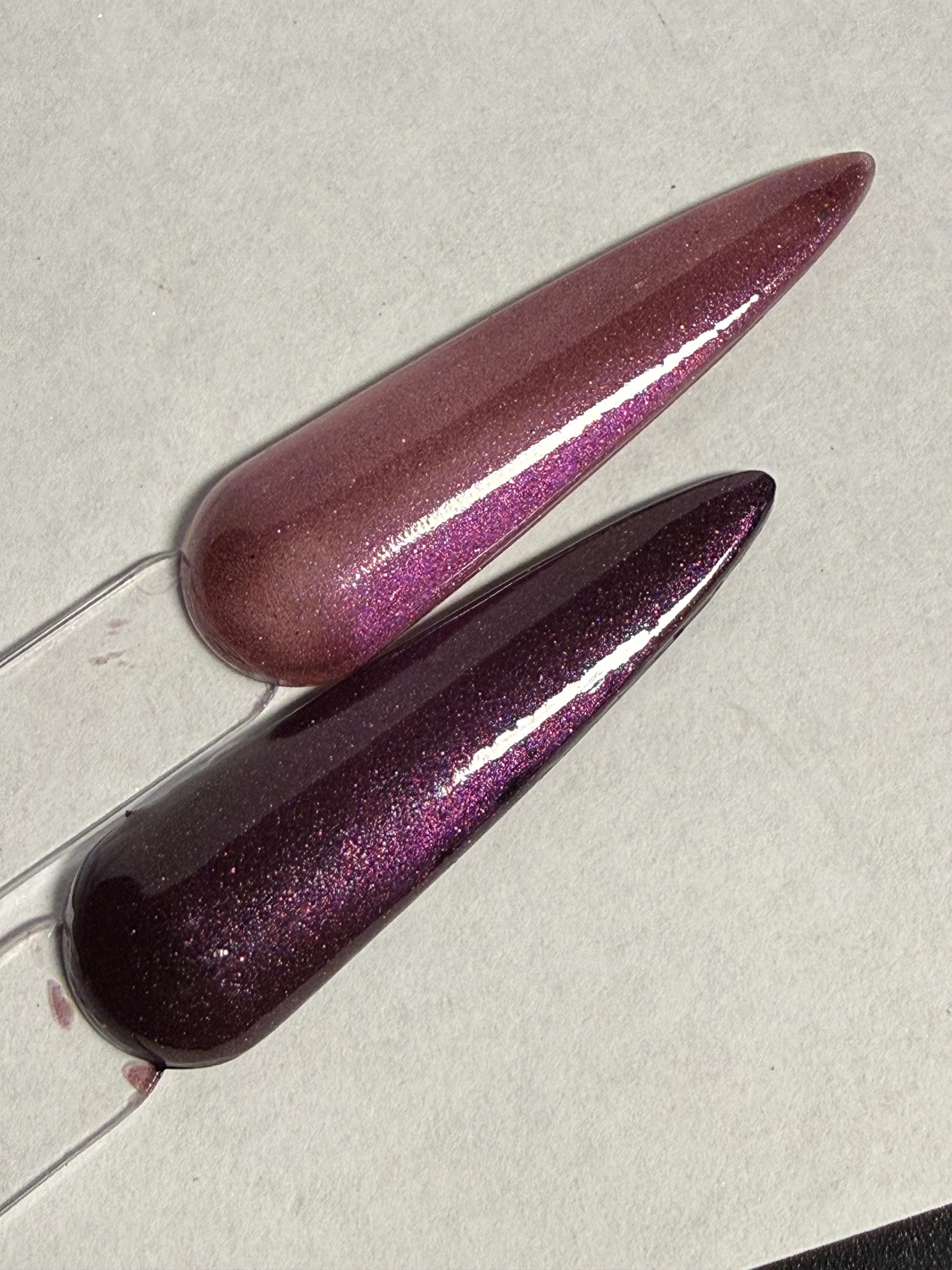 This nail polish comes in either 5 or 15ml bottles and is a magnetic burgundy/pink with a touch of silver holo mixed in. You will need a magnet to take advantage of the magnetic properties within. It does not come with a magnet but if you'd like me to include one for $1, please check my other listings.