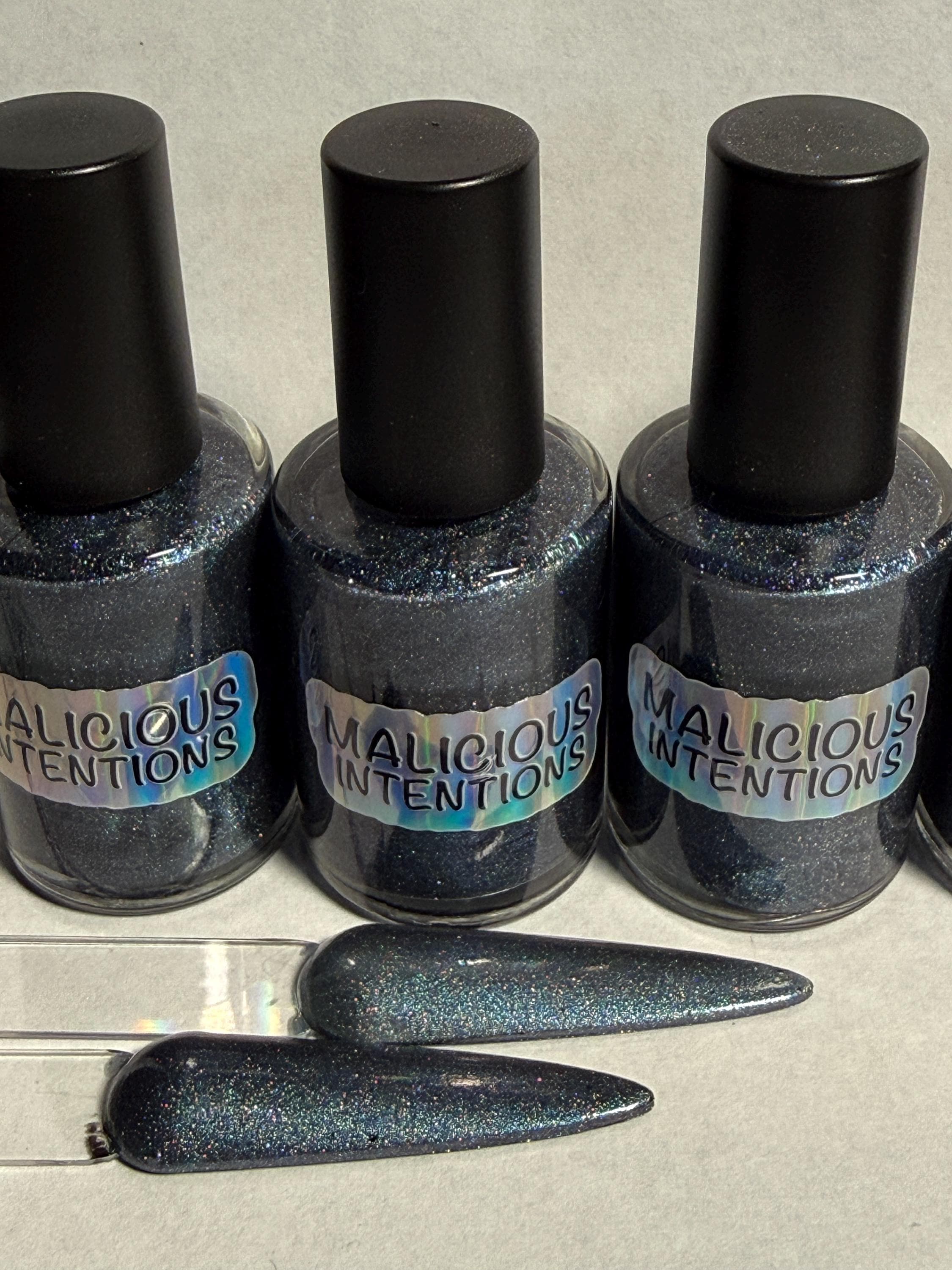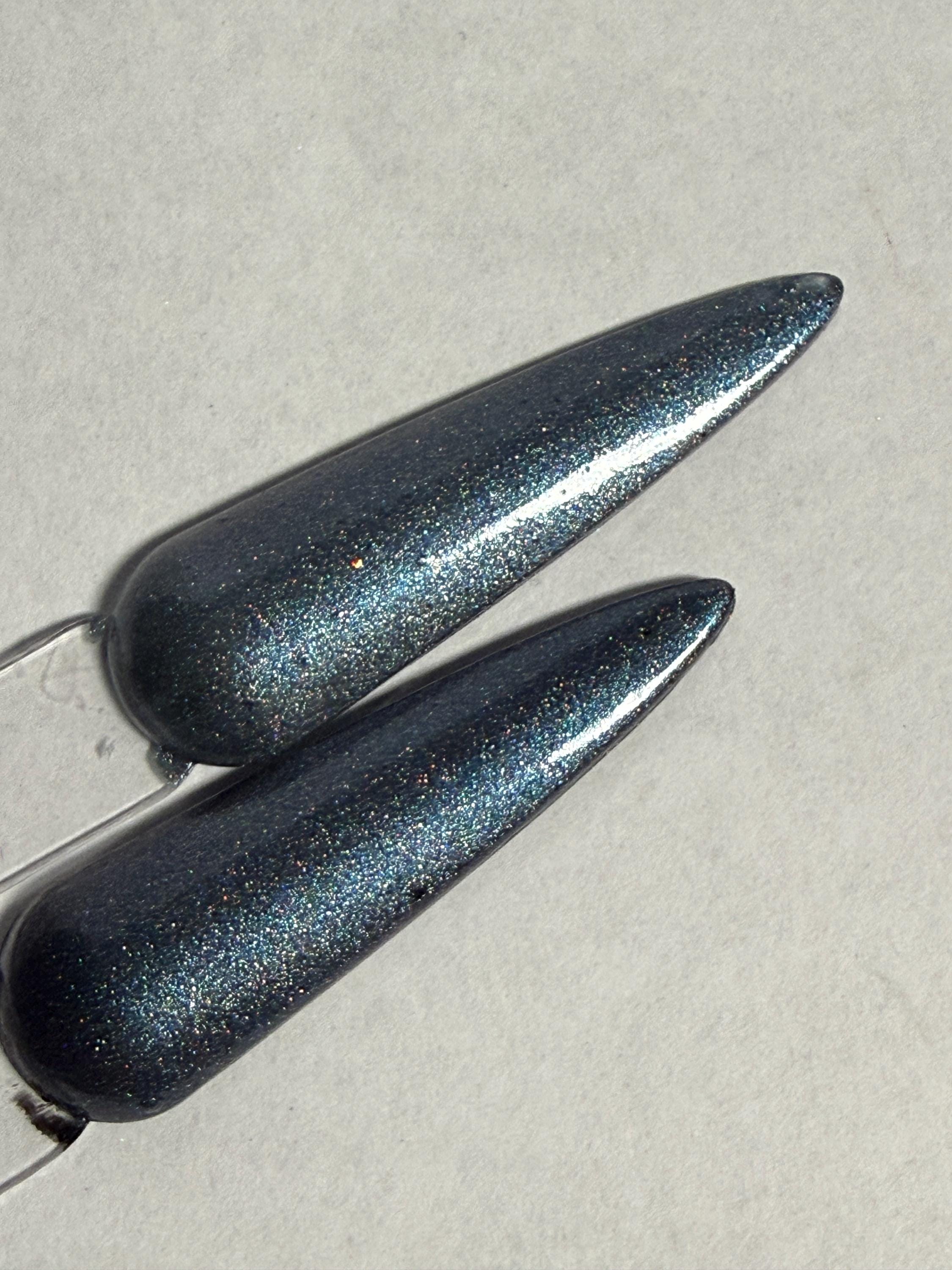 This nail polish comes in either 5 or 15ml bottles and is a magnetic navy blue holo. You will need a magnet to take advantage of the magnetic properties within. It does not come with a magnet but if you'd like me to include one for $1, please check my other listings.