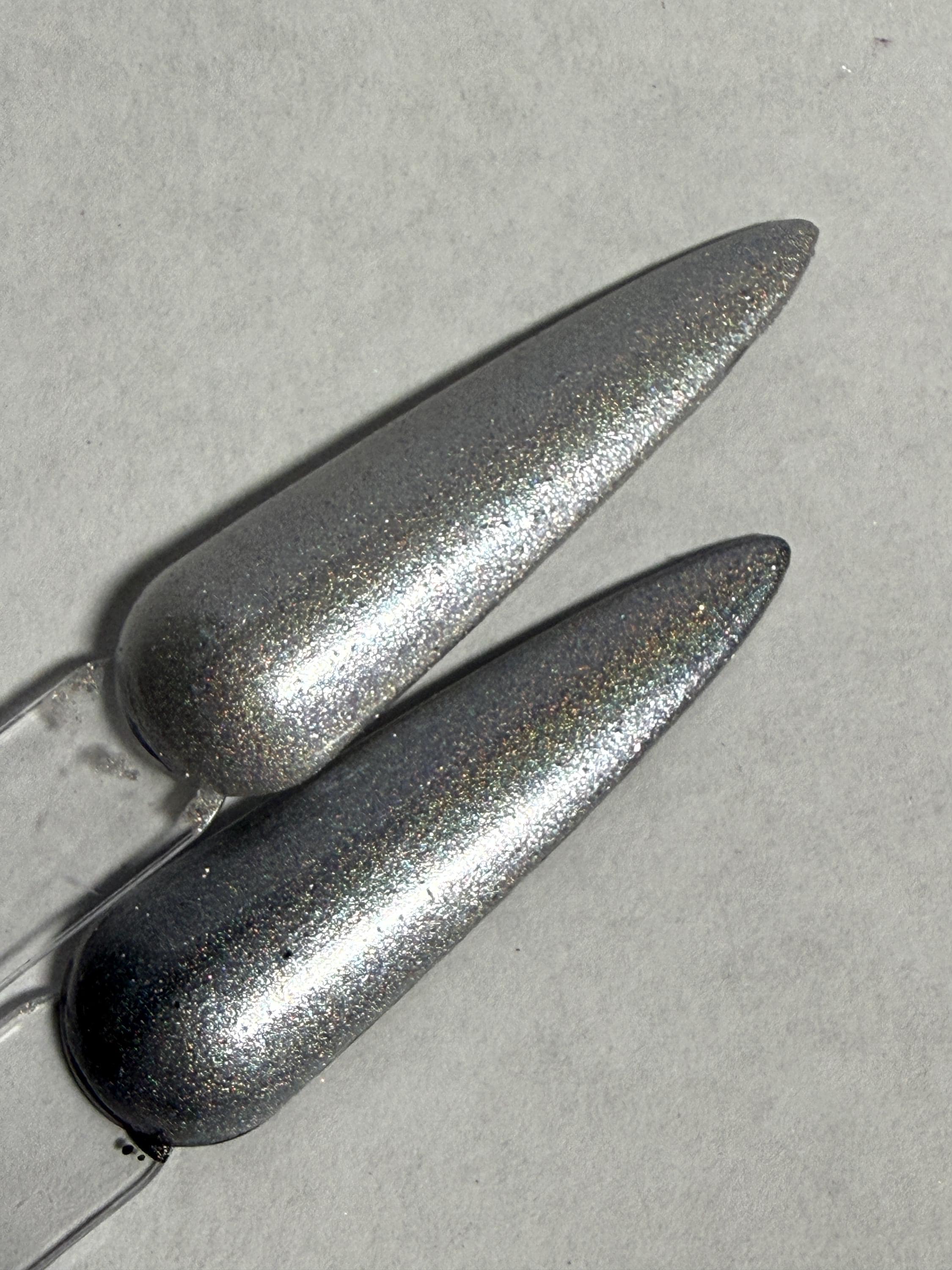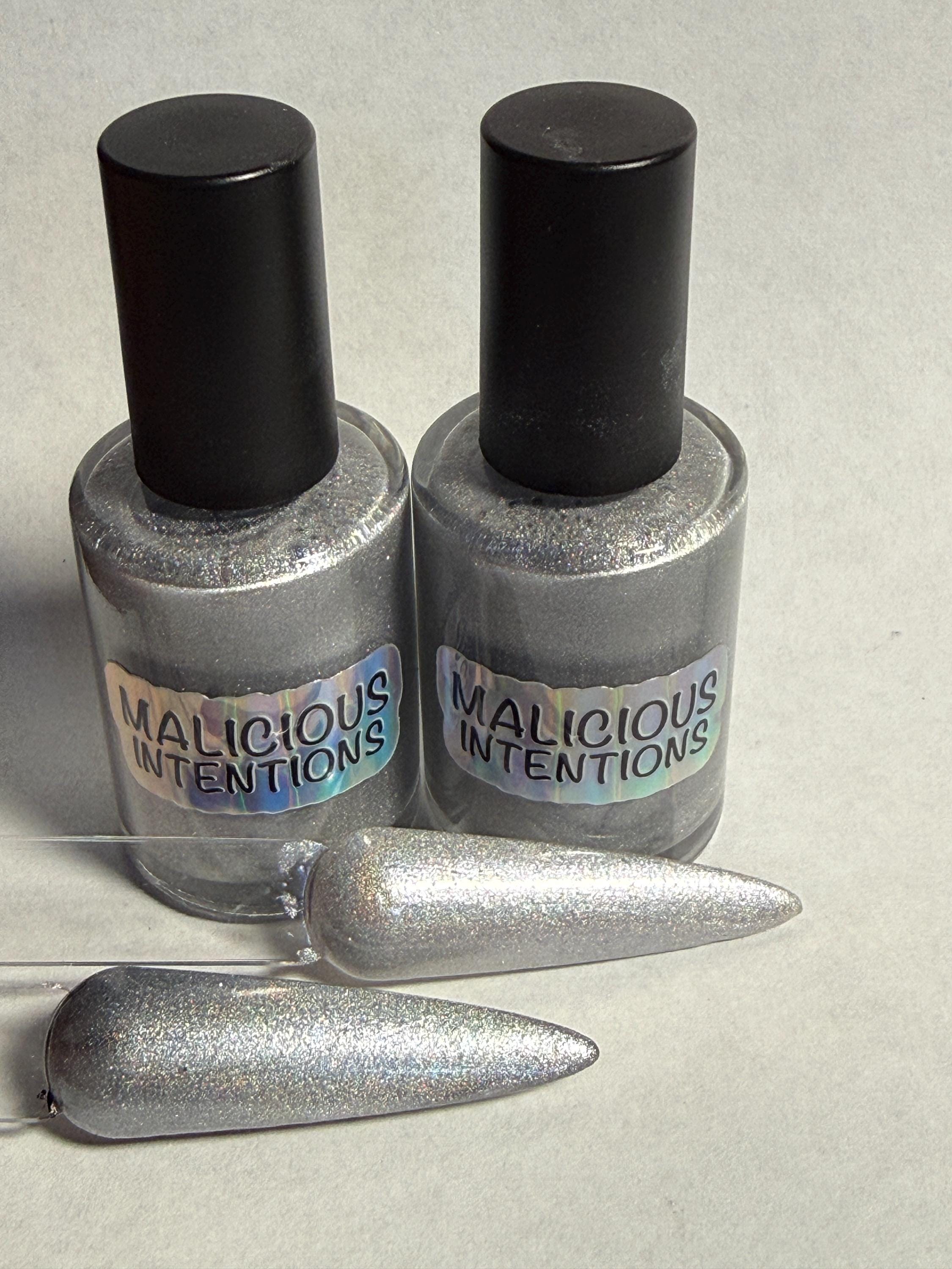 This nail polish comes in either 5 or 15ml bottles and is a magnetic white holo. You will need a magnet to take advantage of the magnetic properties within. It does not come with a magnet but if you'd like me to include one for $1, please check my other listings.