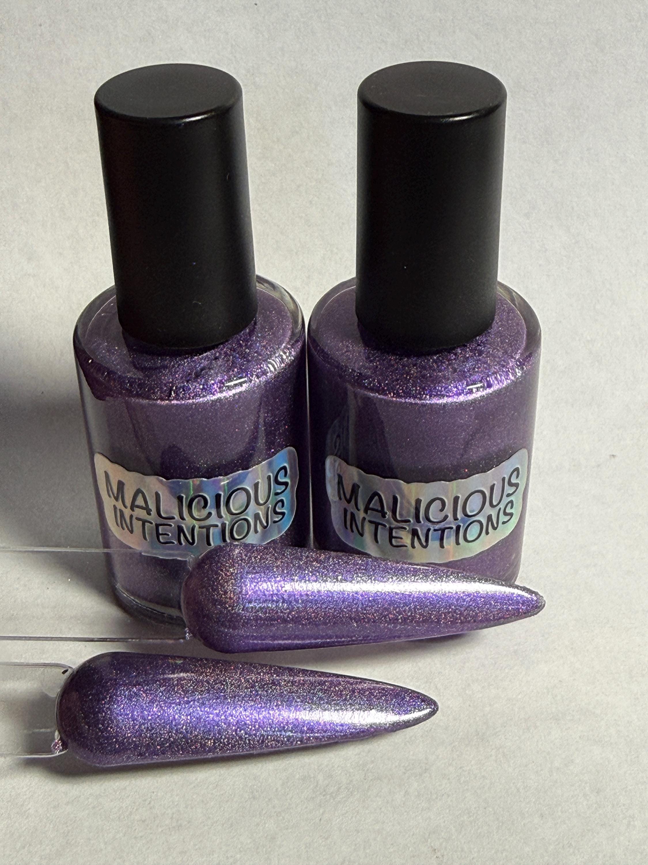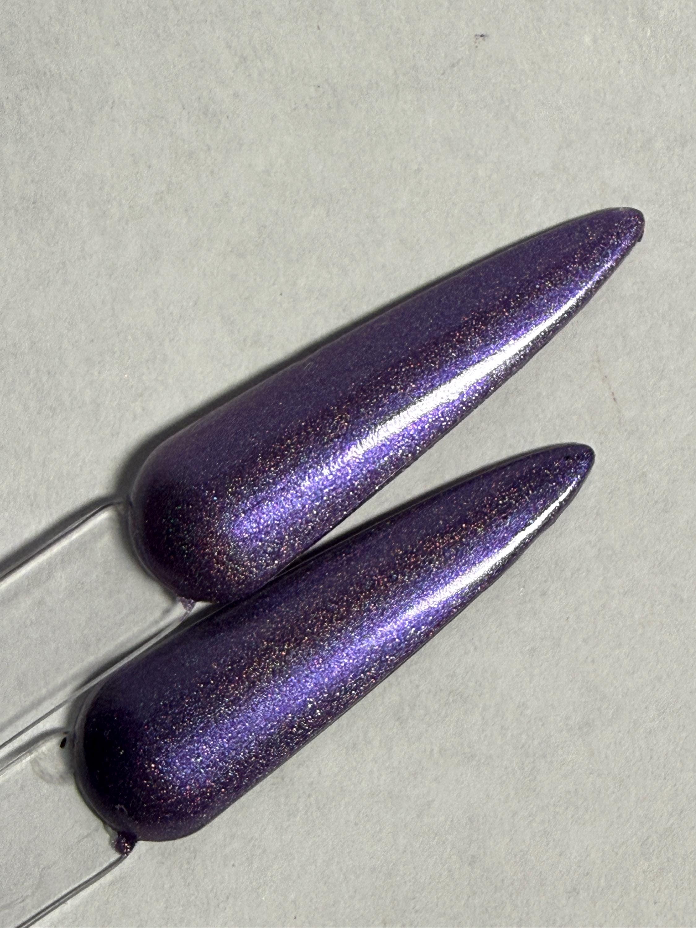 This nail polish comes in either 5 or 15ml bottles and is a magnetic grape purple holo. You will need a magnet to take advantage of the magnetic properties within. It does not come with a magnet but if you'd like me to include one for $1, please check my other listings.