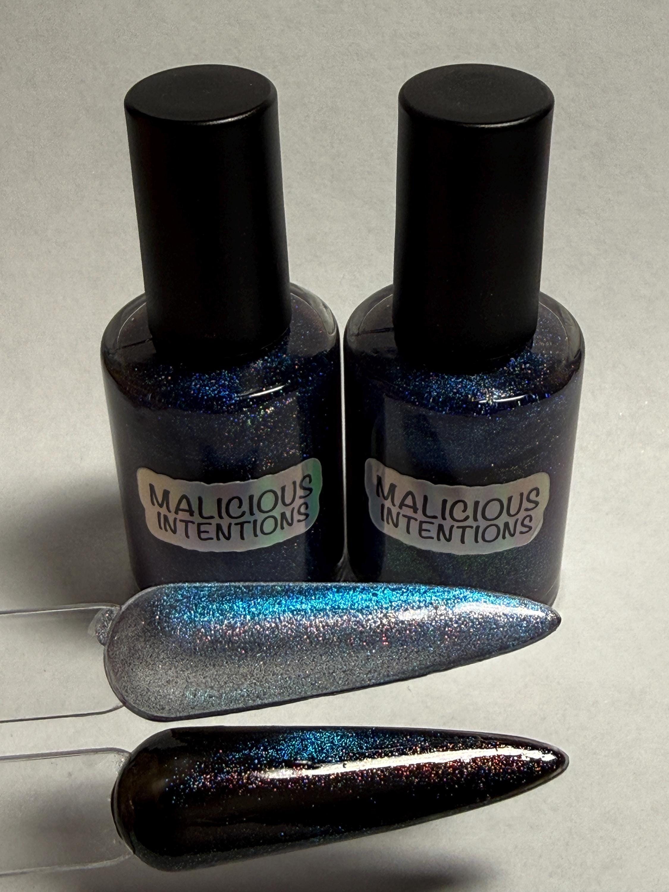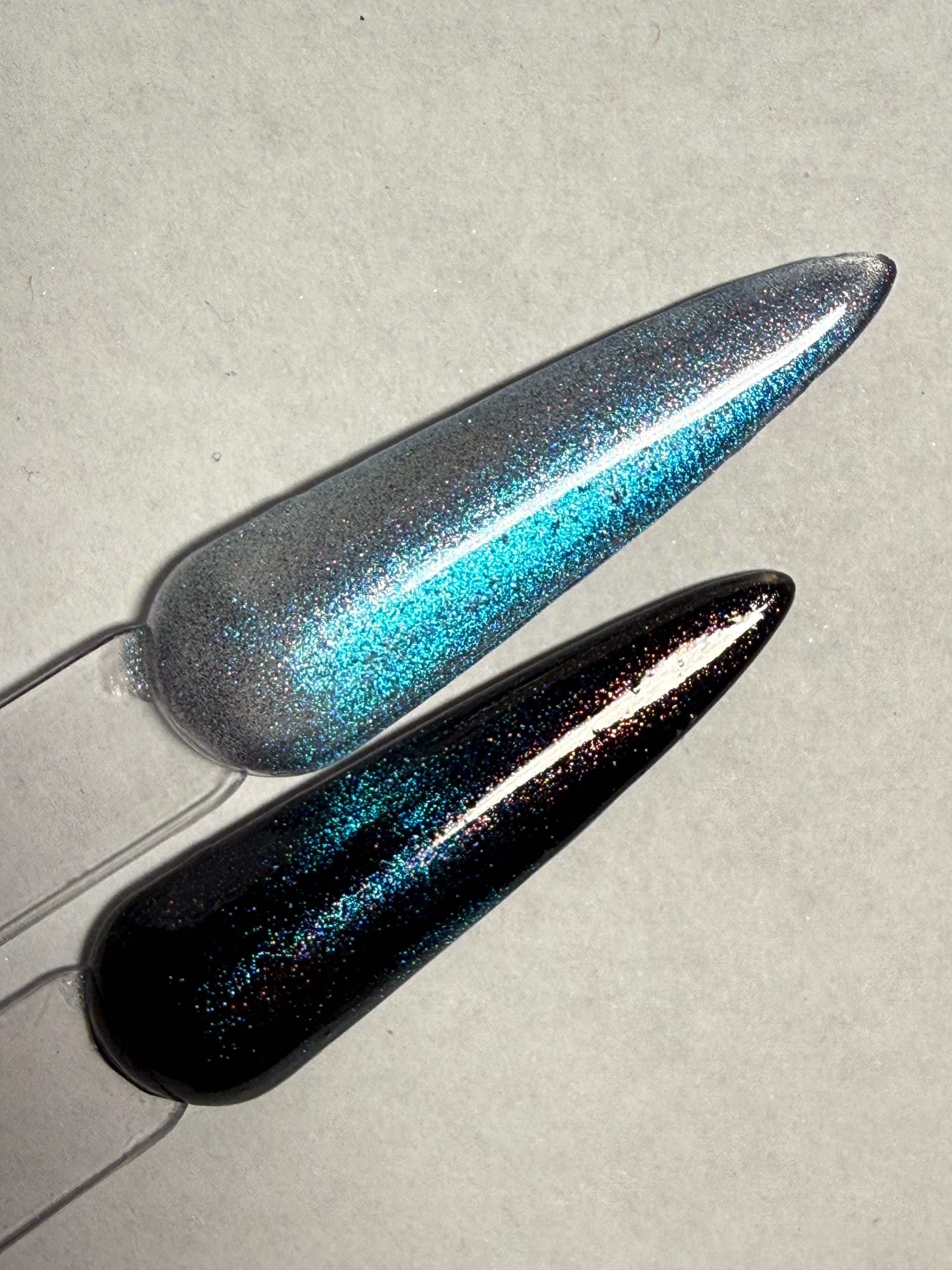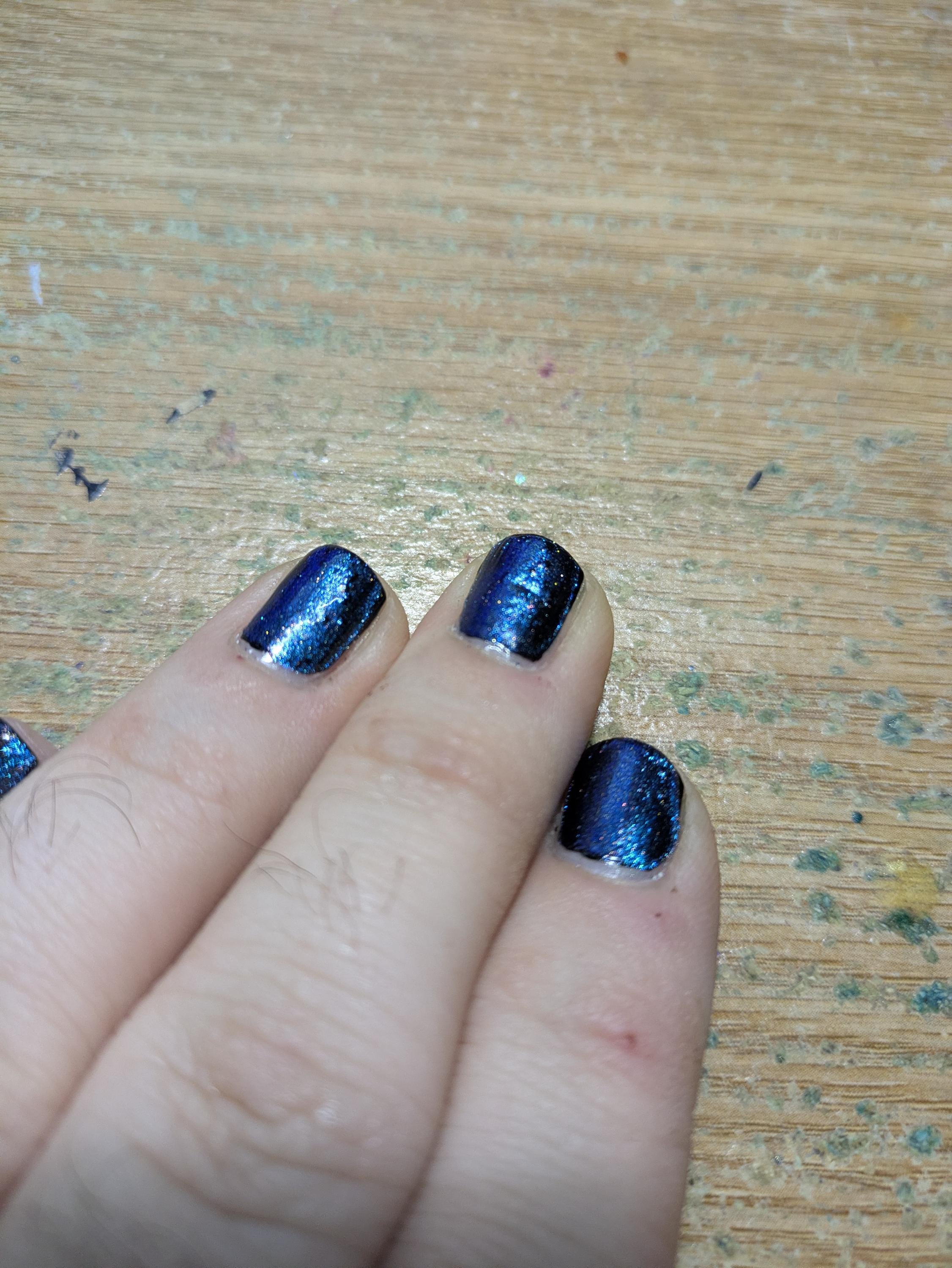 This polish is GORGEOUS. On its own I’d call it “blue”, but it has a rich, almost deep maroon base, with a bright teal shifty glitter. Used as a topper, it deepens the cream underneath and gives a stunning teal sparkle. It’s a perfect example of what can be done with a fine particle magnetic. It has a very jelly/like texture, so the end result is truly glass bead like. I’d enjoyed other polishes from this maker, but this one is a HG. In the video, this is one coat over my favorite smoky blue cream base.