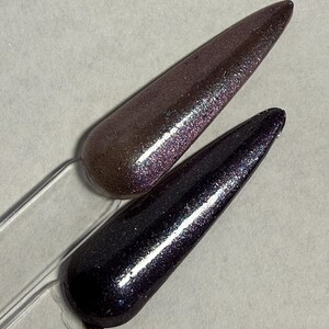 The photos/videos is one coat over a black base and magnetized using the bead method, and the other is two coats on clear, velvetized.
