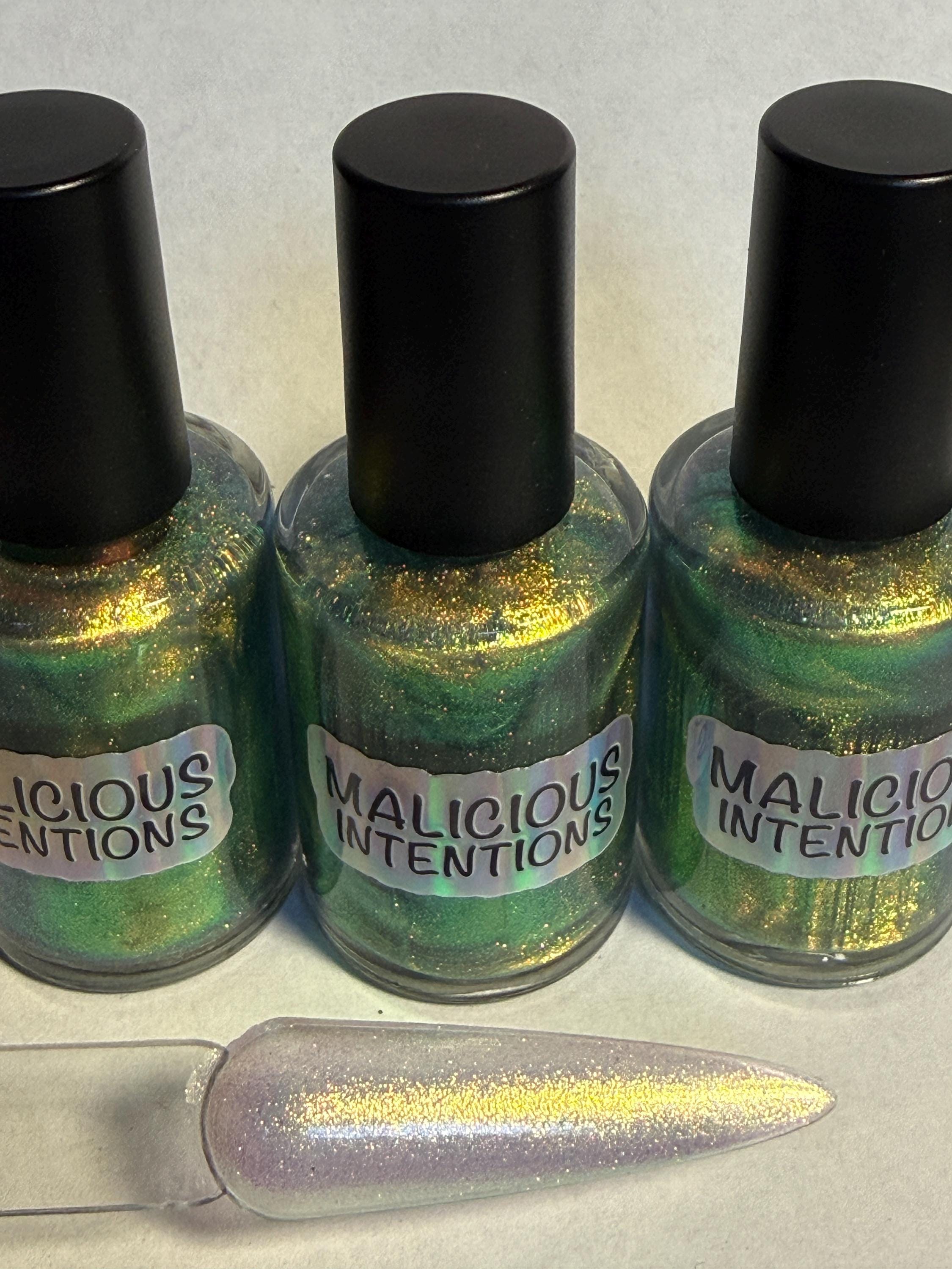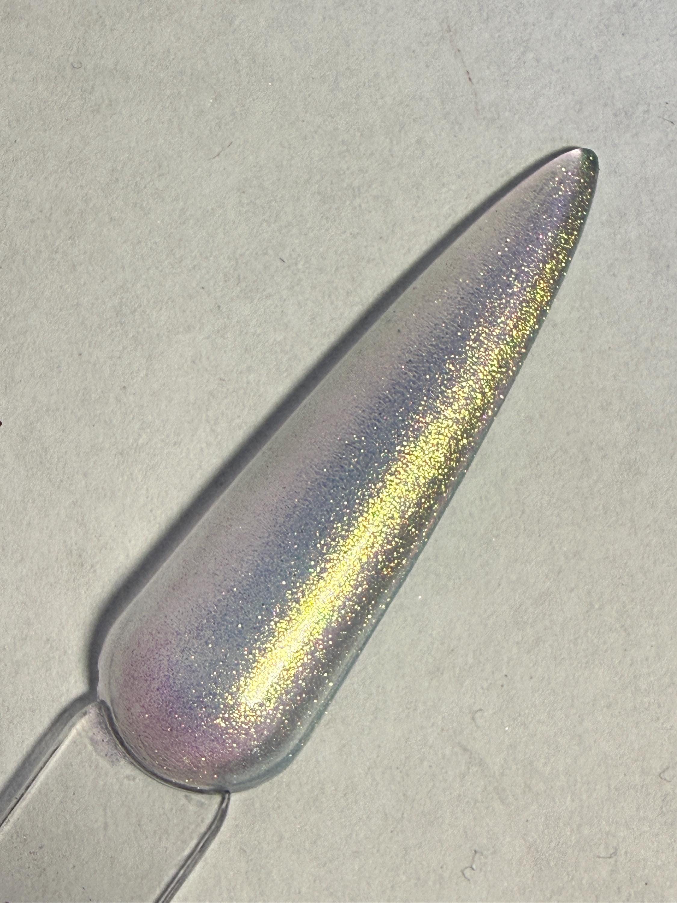 This nail polish comes in either 5 or 15ml bottles and is a sheer green/gold duochrome.