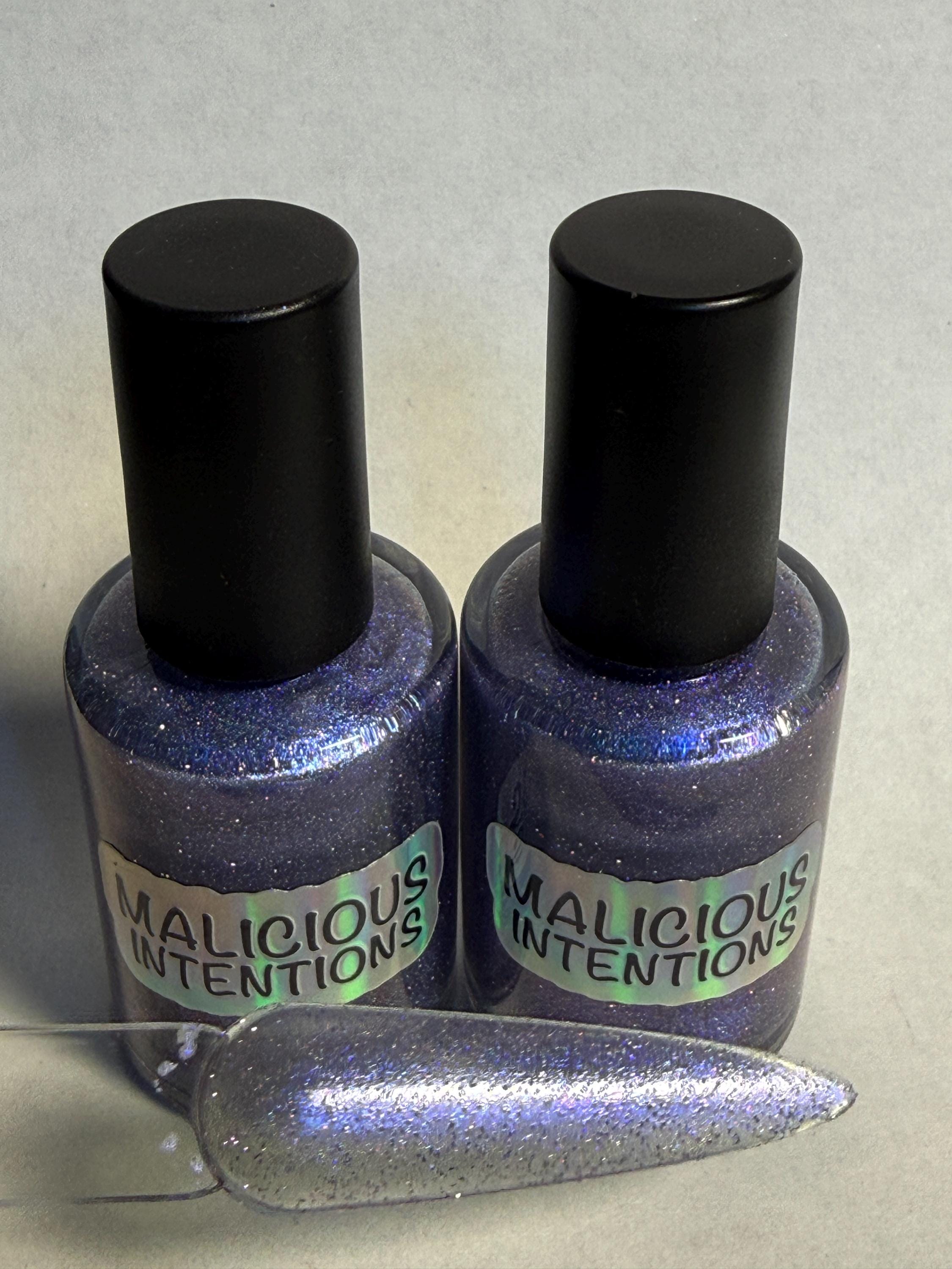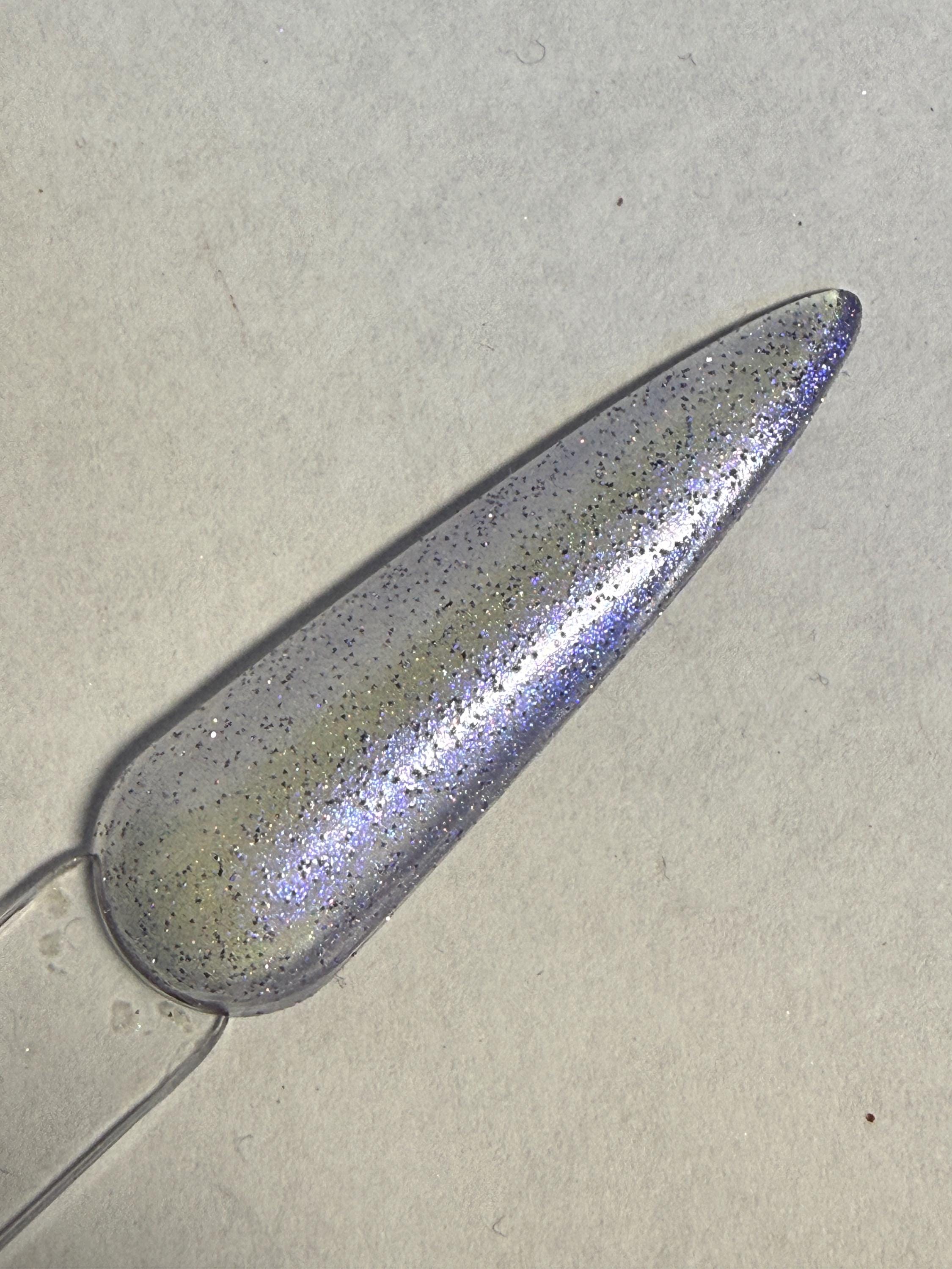 This nail polish comes in either 5 or 15ml bottles and is a sheer purple reflective with a touch of holo. The swatch is two coats on a clear swatch stick.