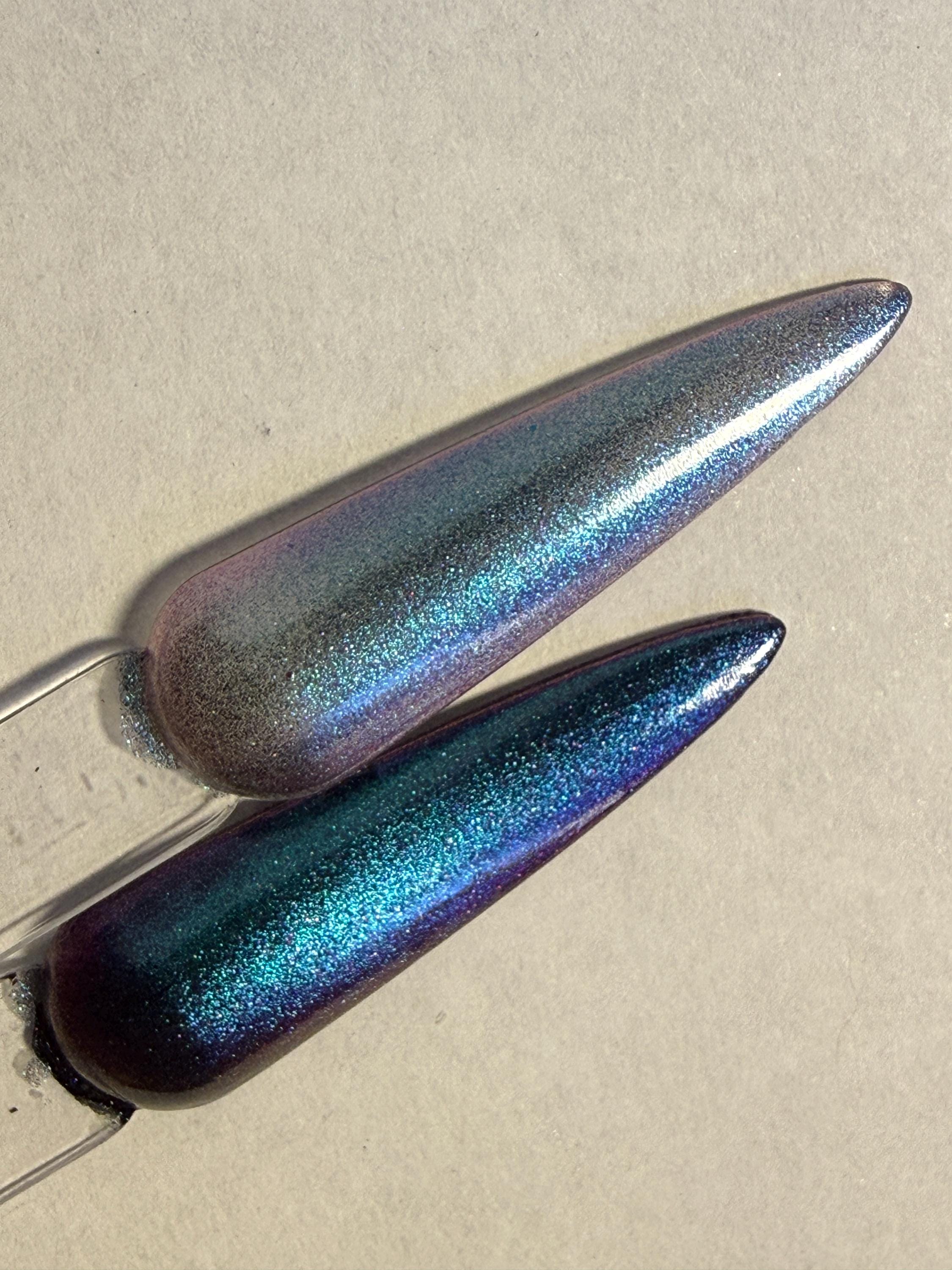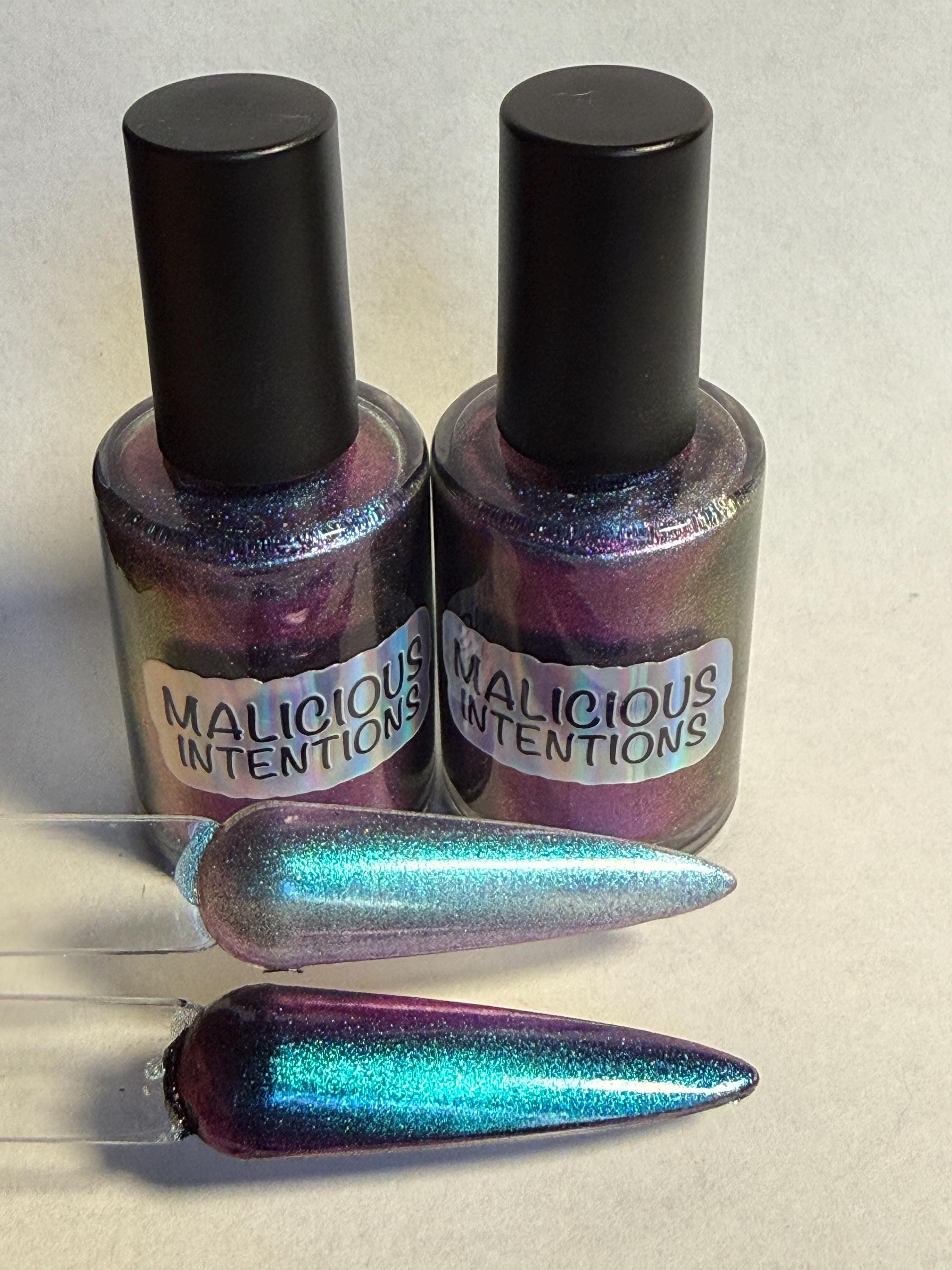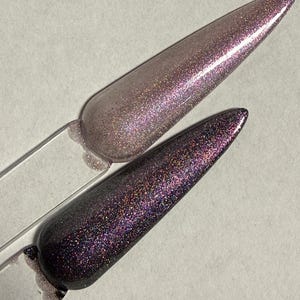 This nail polish comes in either 5 or 15ml bottles and is a magnetic purple holo with a green/blue flash. You will need a magnet to take advantage of the magnetic properties within. It does not come with a magnet but if you'd like me to include one for $1, please check my other listings.