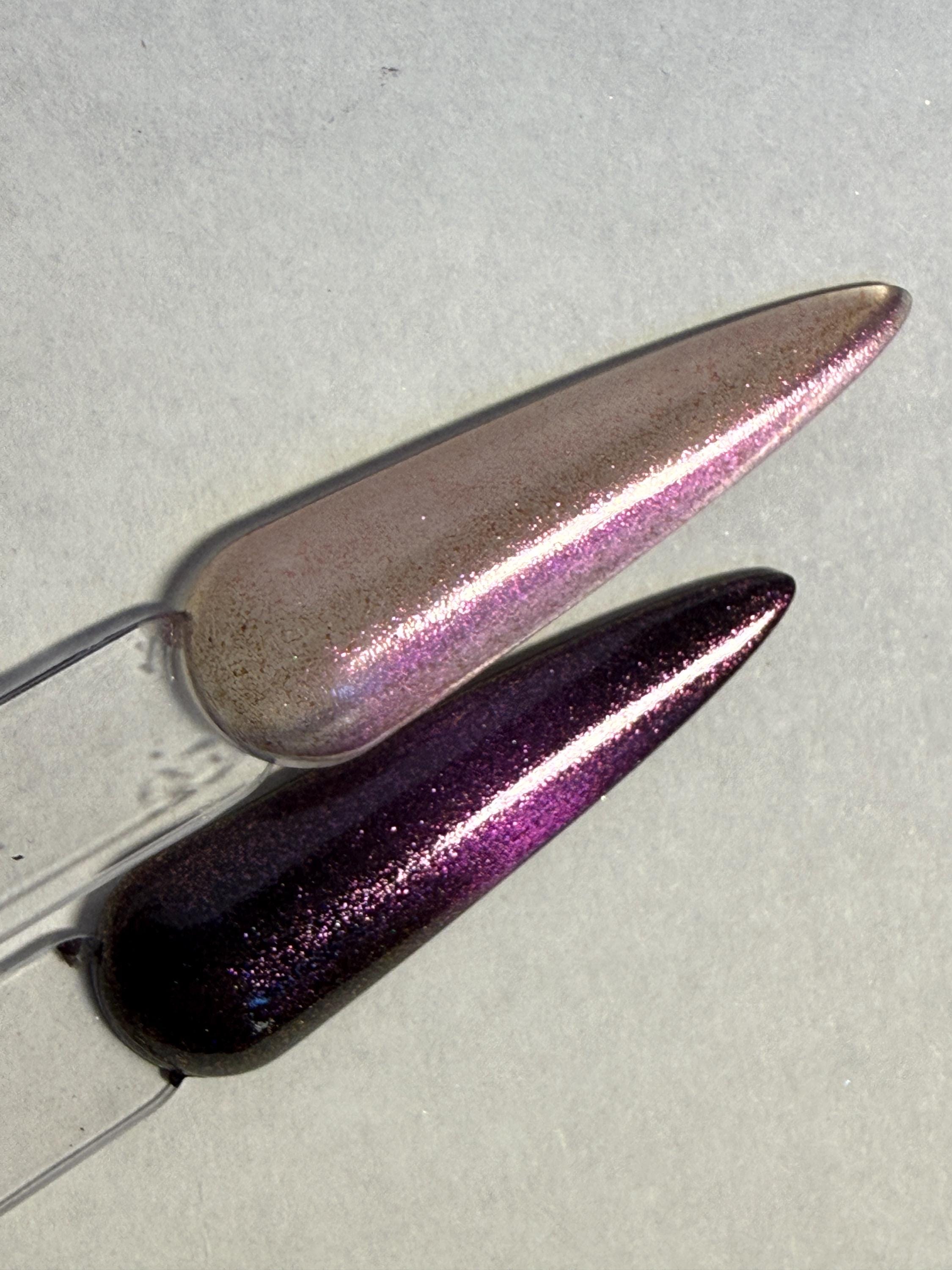 The photos/videos is one coat over a black base and magnetized using the bead method, and the other is two coats on clear, velvetized.