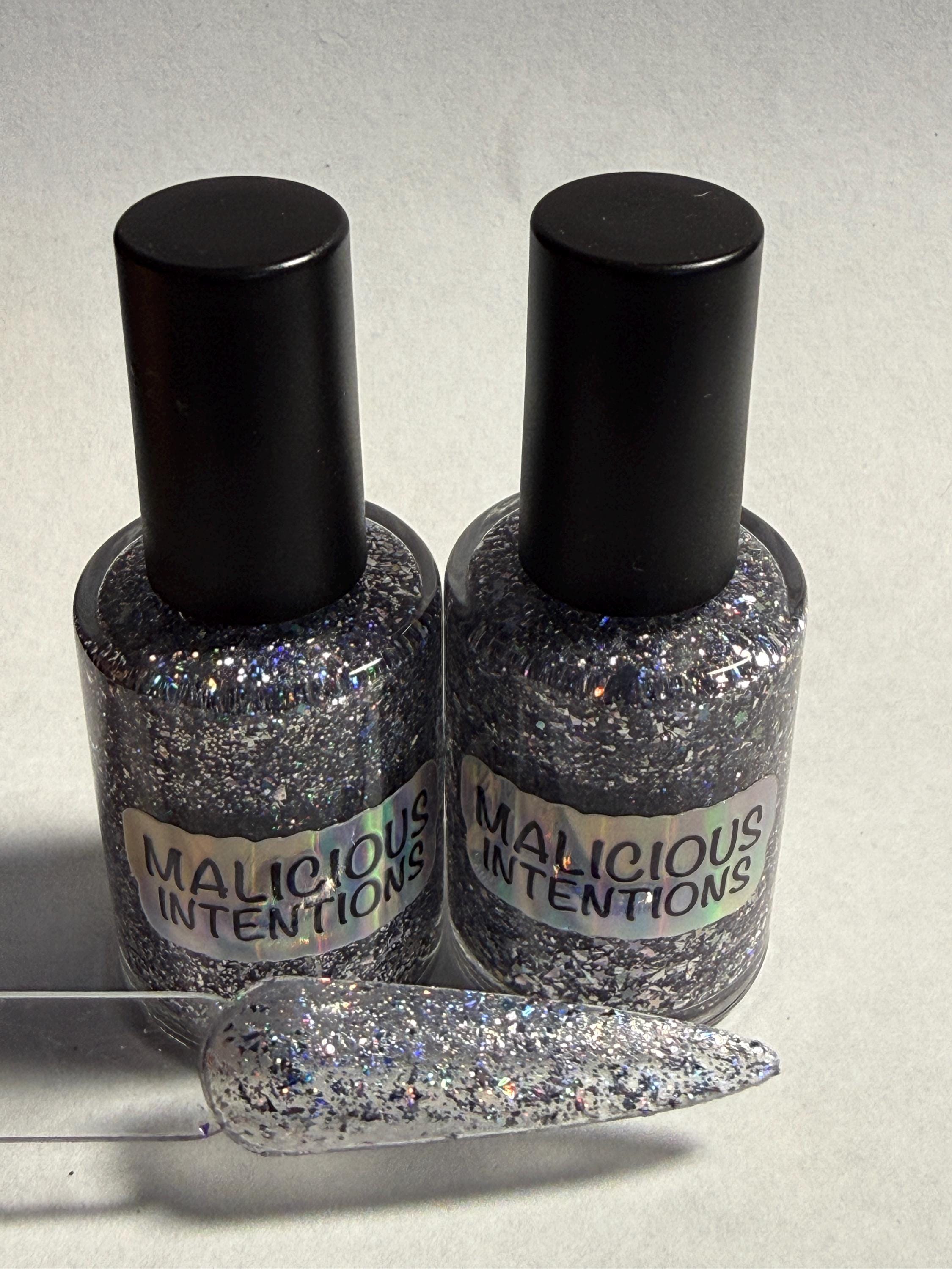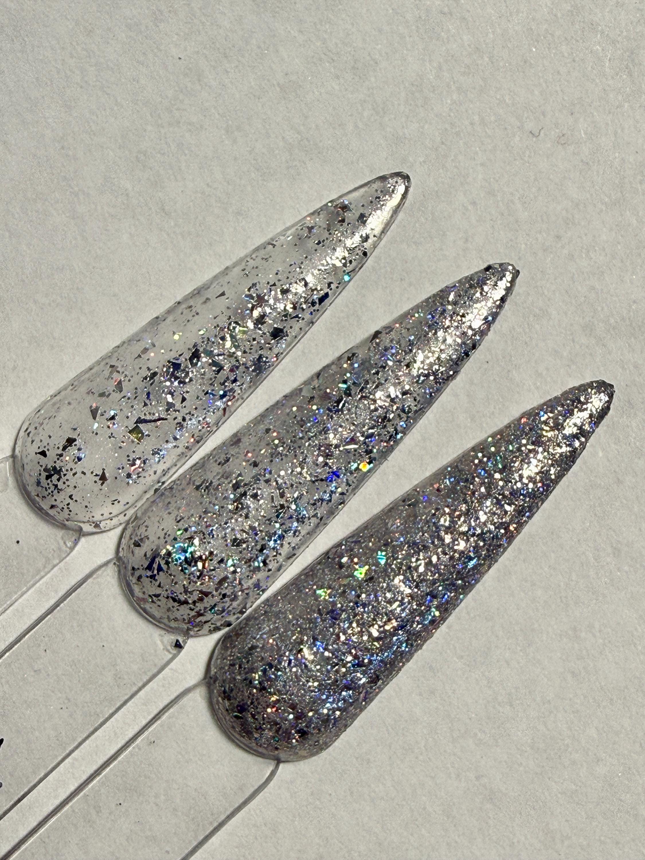 This nail polish comes in either 5 or 15ml bottles and its packed with silver holographic flakes and a small handful of stars, squares, and other shapes.