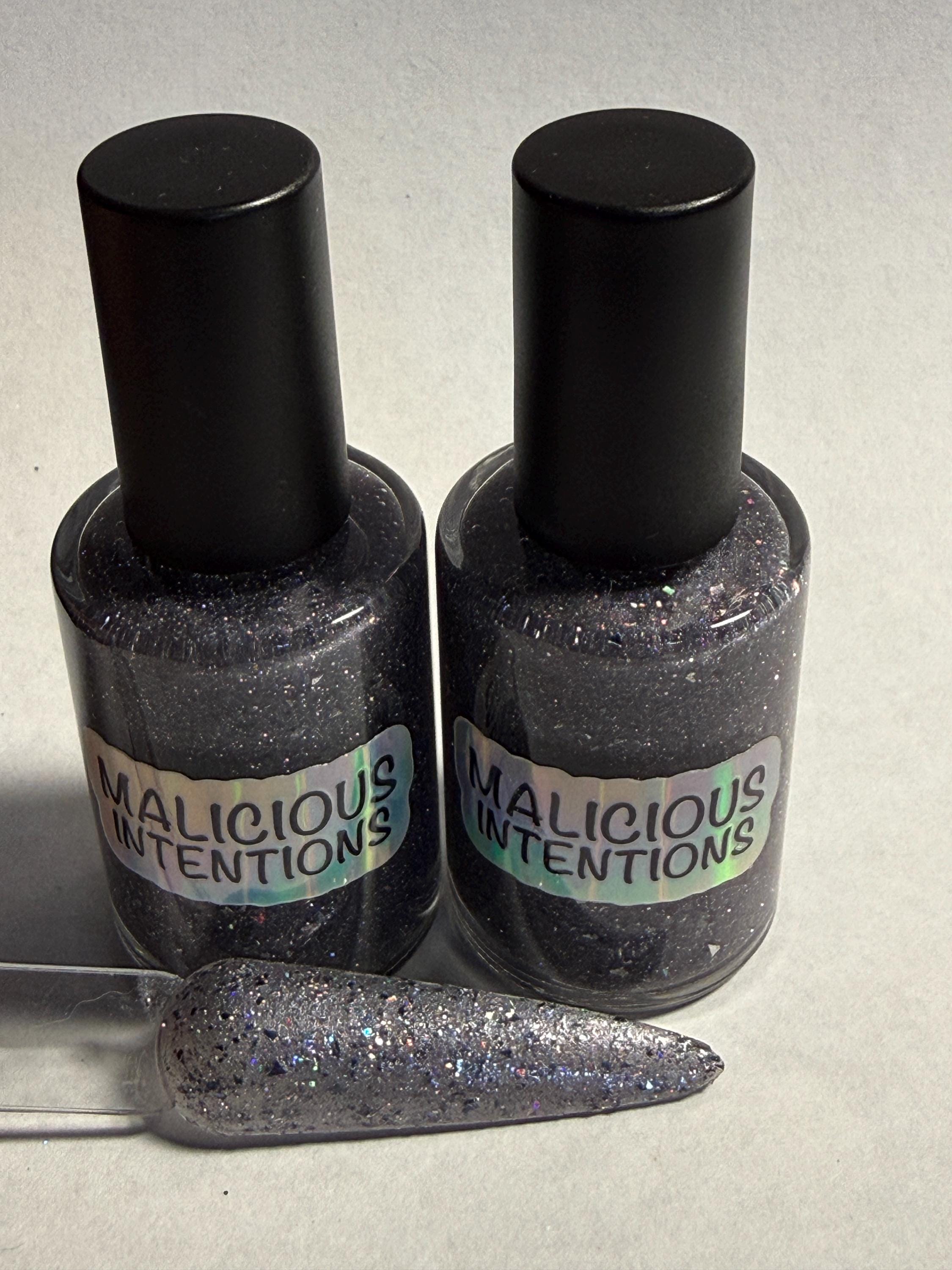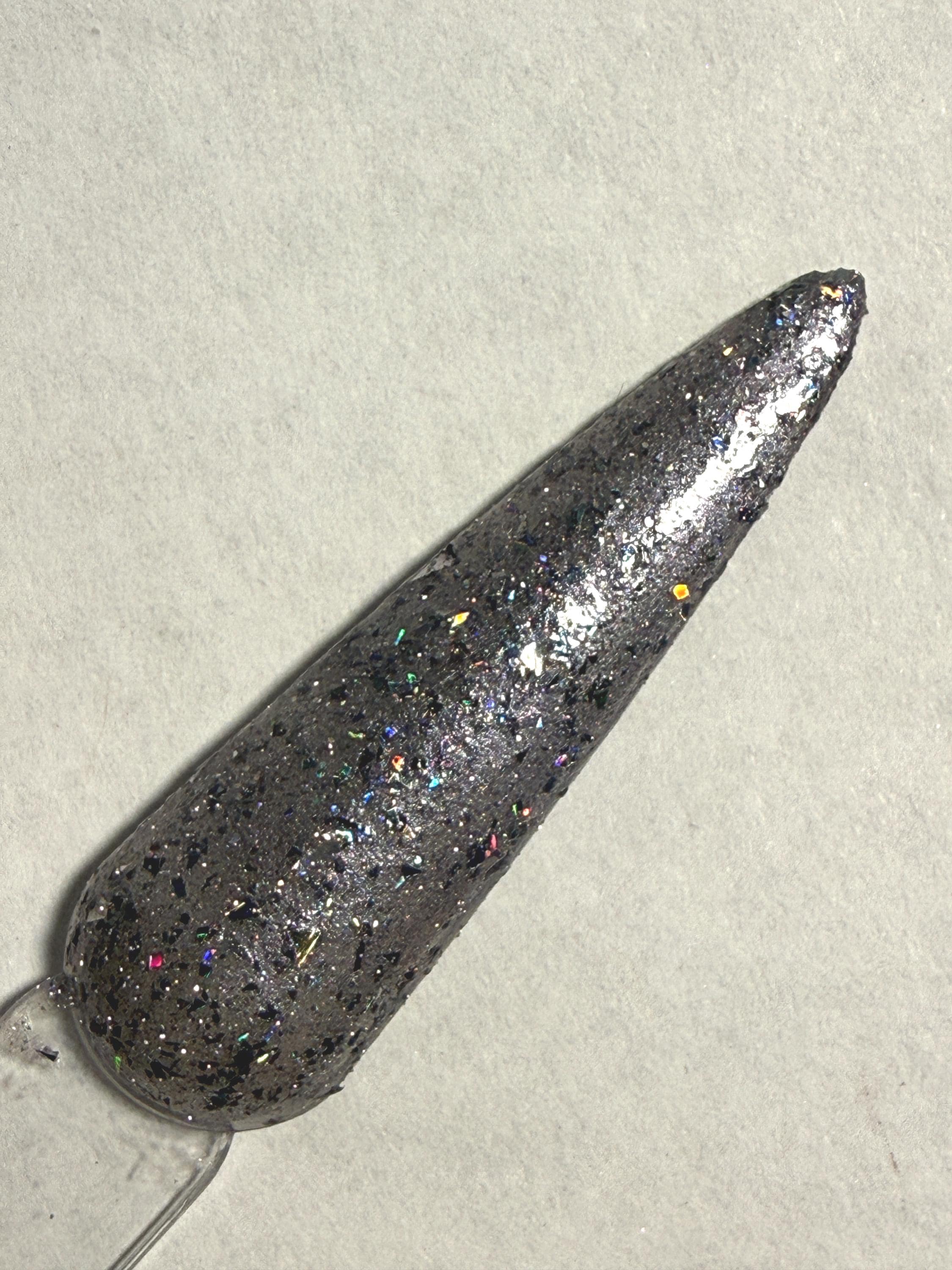 This nail polish comes in either 5 or 15ml bottles and is a dark gray metallic base with gray holographic flakes.