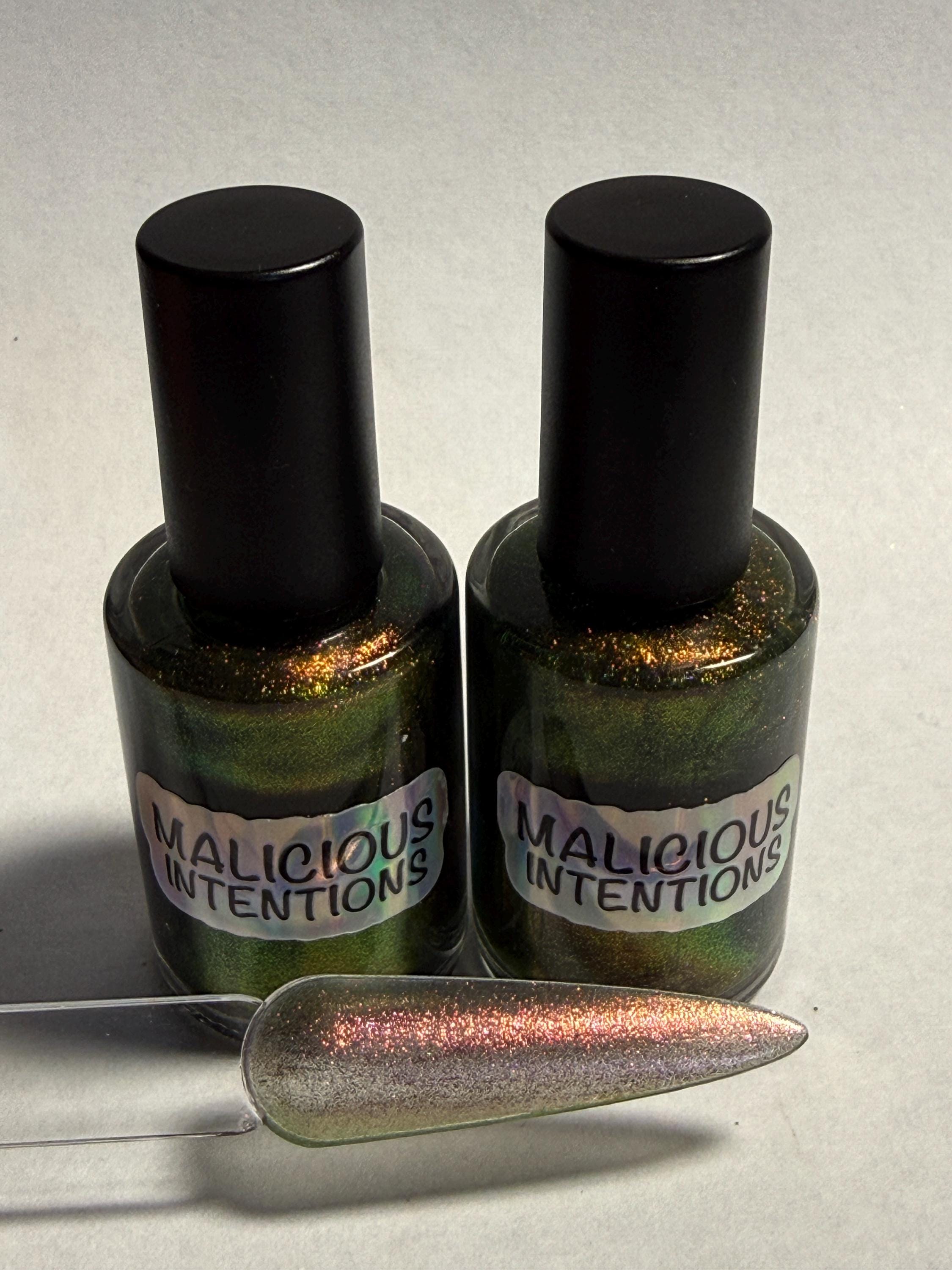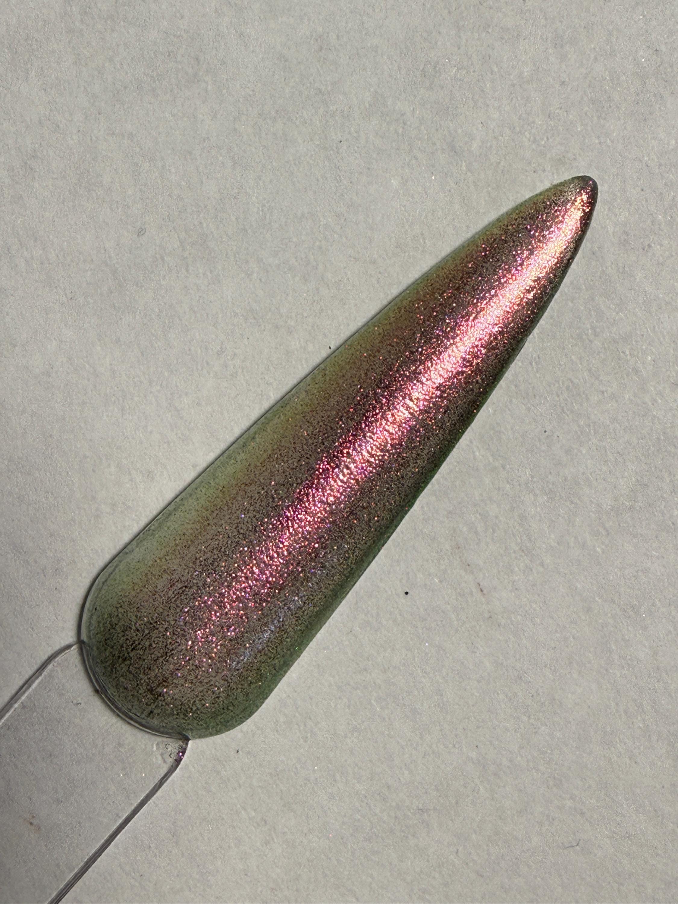 This nail polish comes in either 5 or 15ml bottles and is a sheer green/gold/orange chameleon.