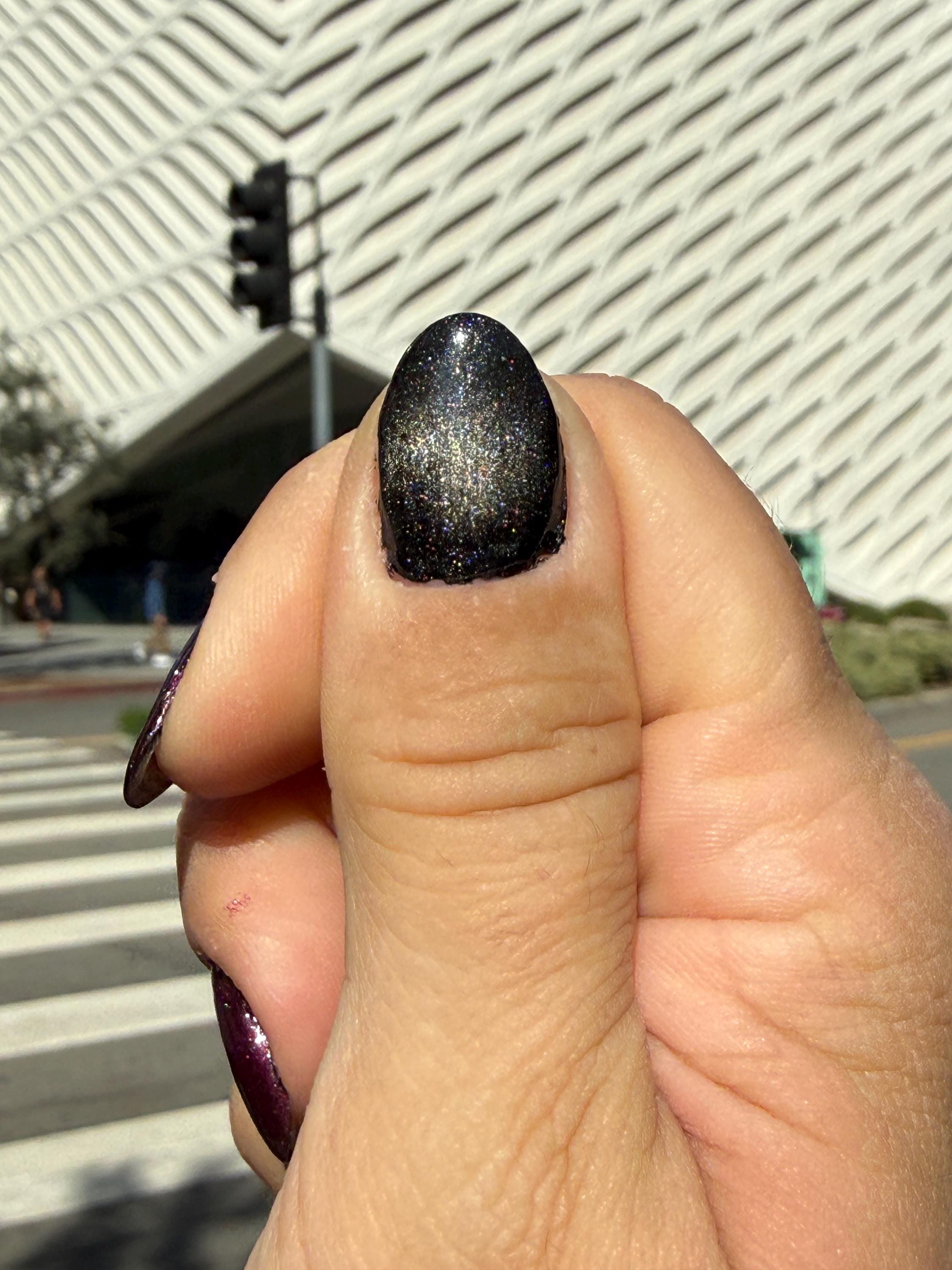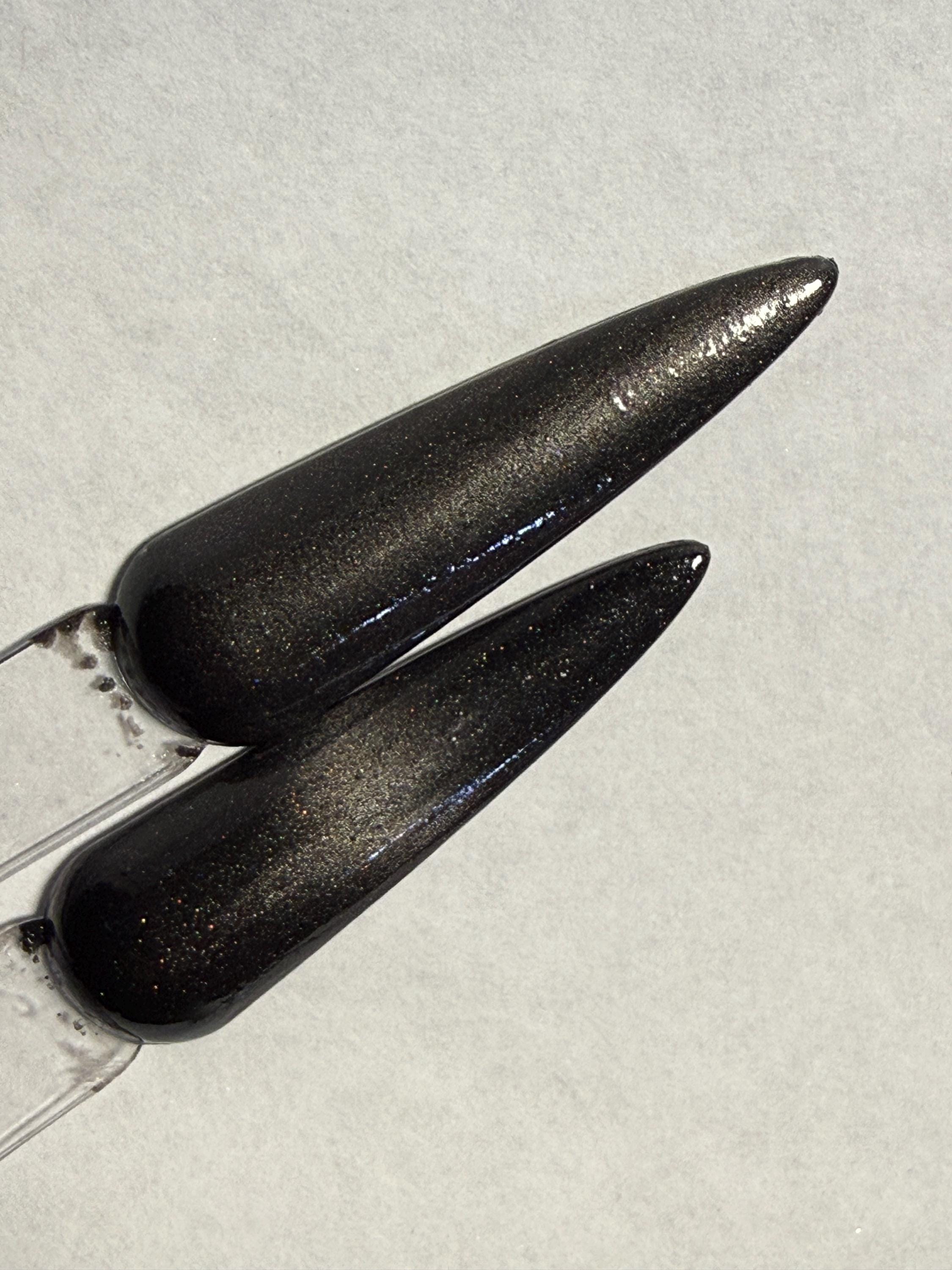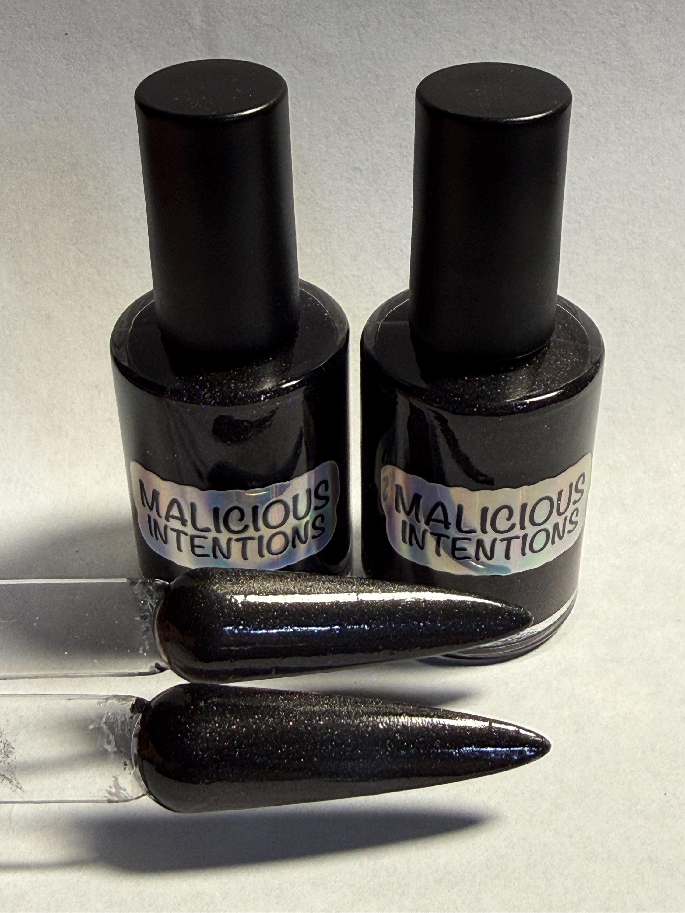 This nail polish comes in either 5 or 15ml bottles and is a magnetic black holographic with a dark silver shift. You will need a magnet to take advantage of the magnetic properties within. It does not come with a magnet but if you'd like me to include one for $1, please check my other listings.