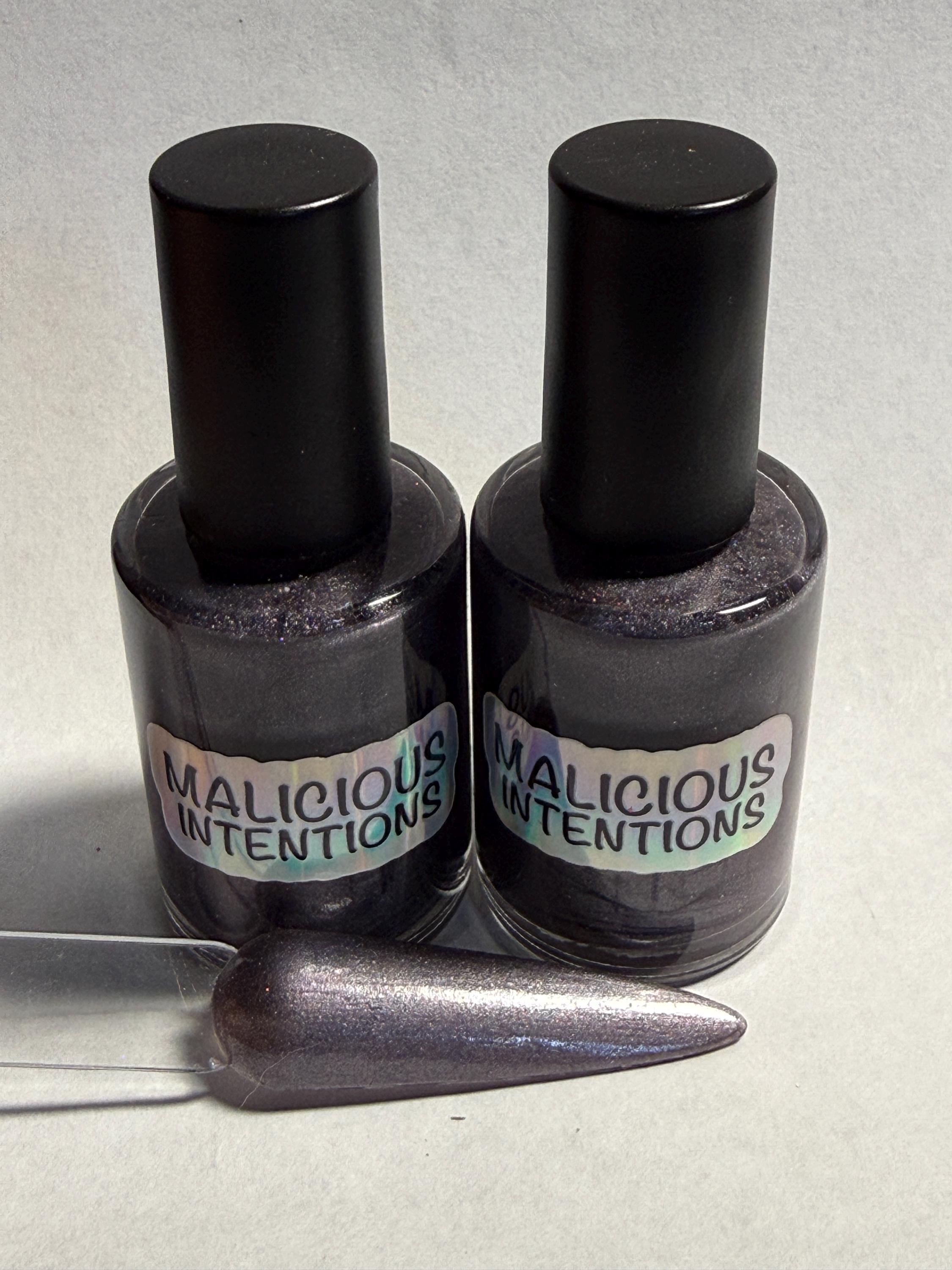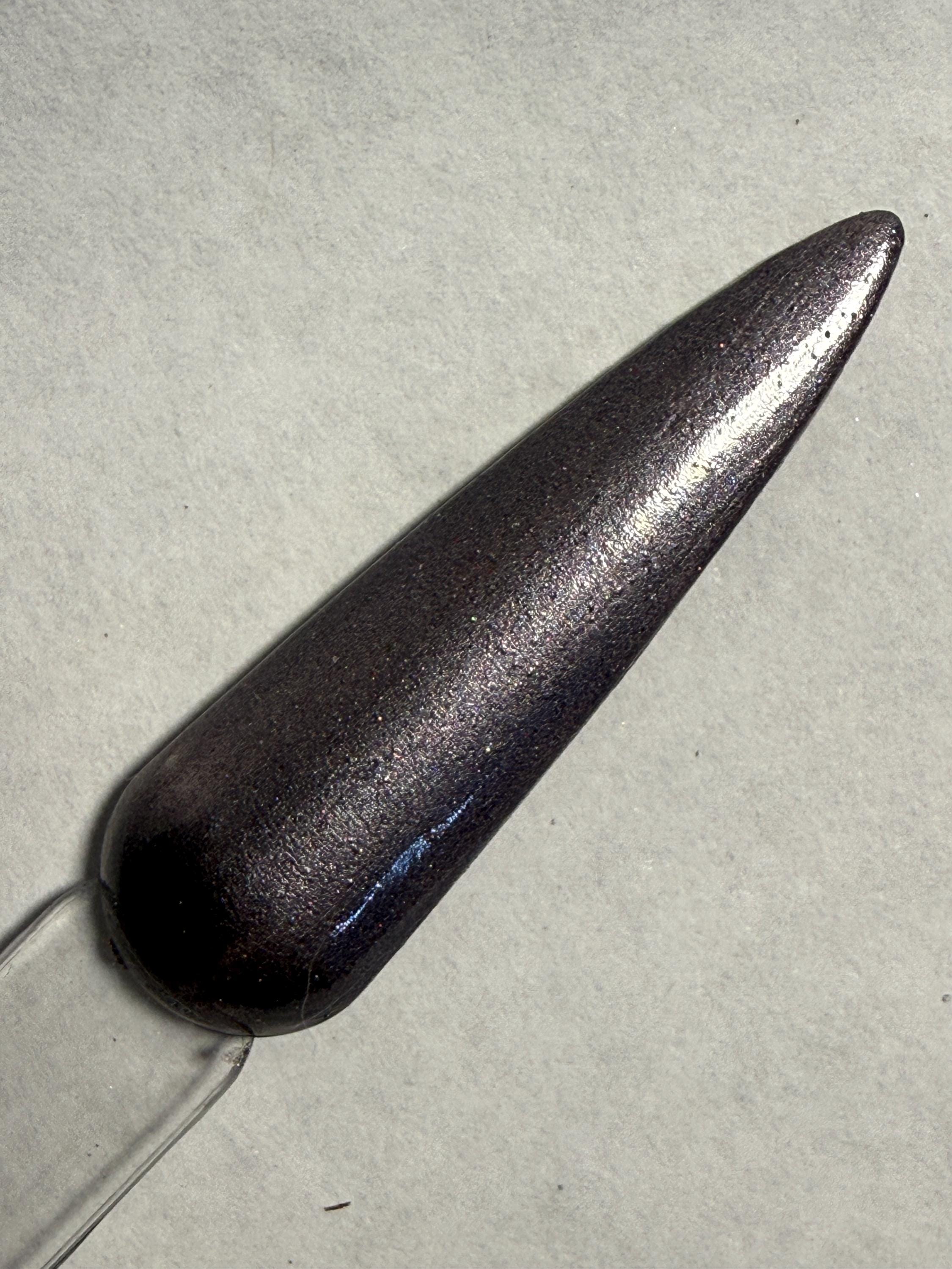 This nail polish comes in either 5 or 15ml bottles and is a dark gunmetal gray with a pink cast and a bit of holographic glitter mixed in.