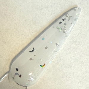 This nail polish comes in either 5 or 15ml bottles and has iridescent flakes and glitter in a shimmery holo base.