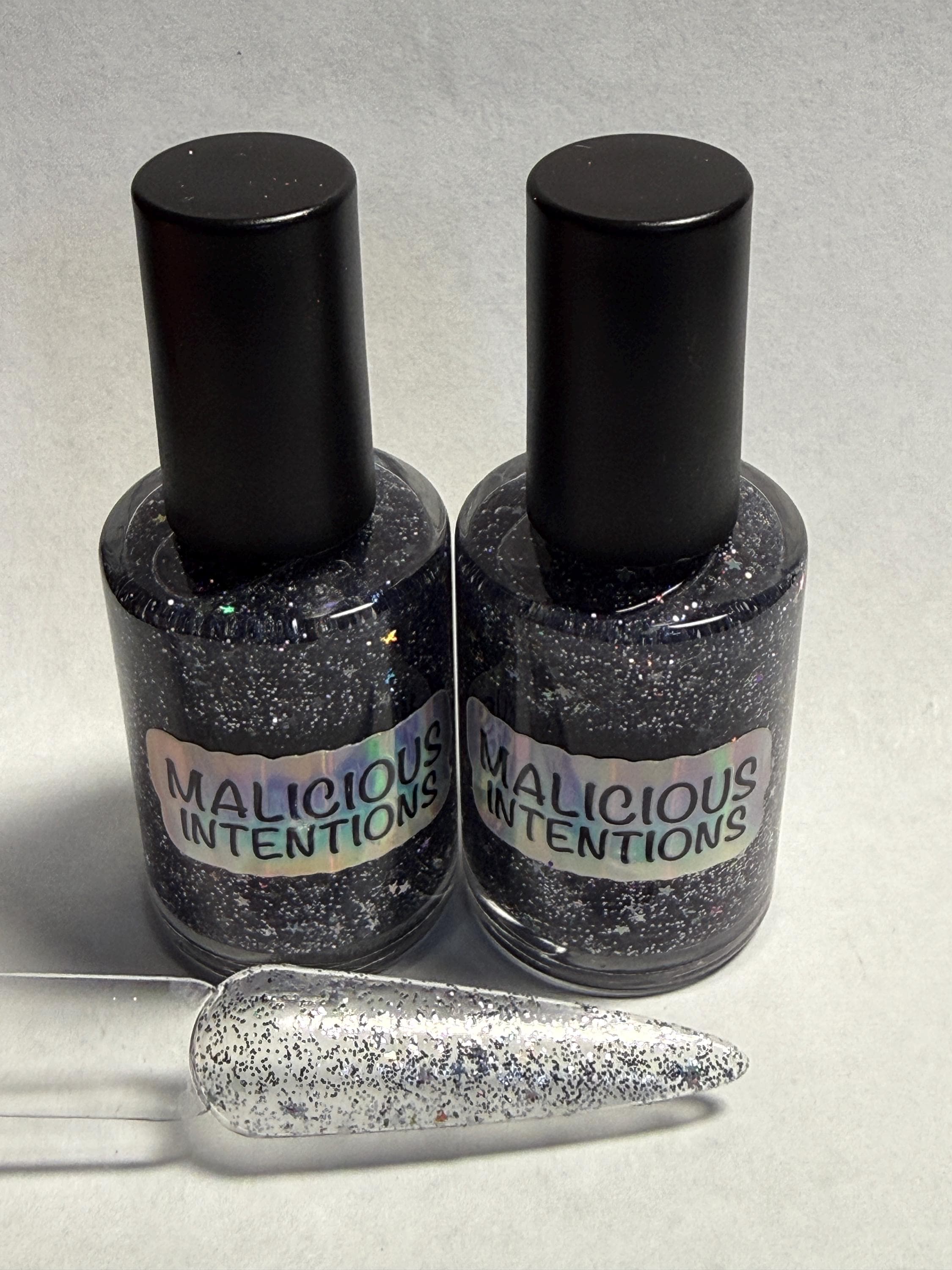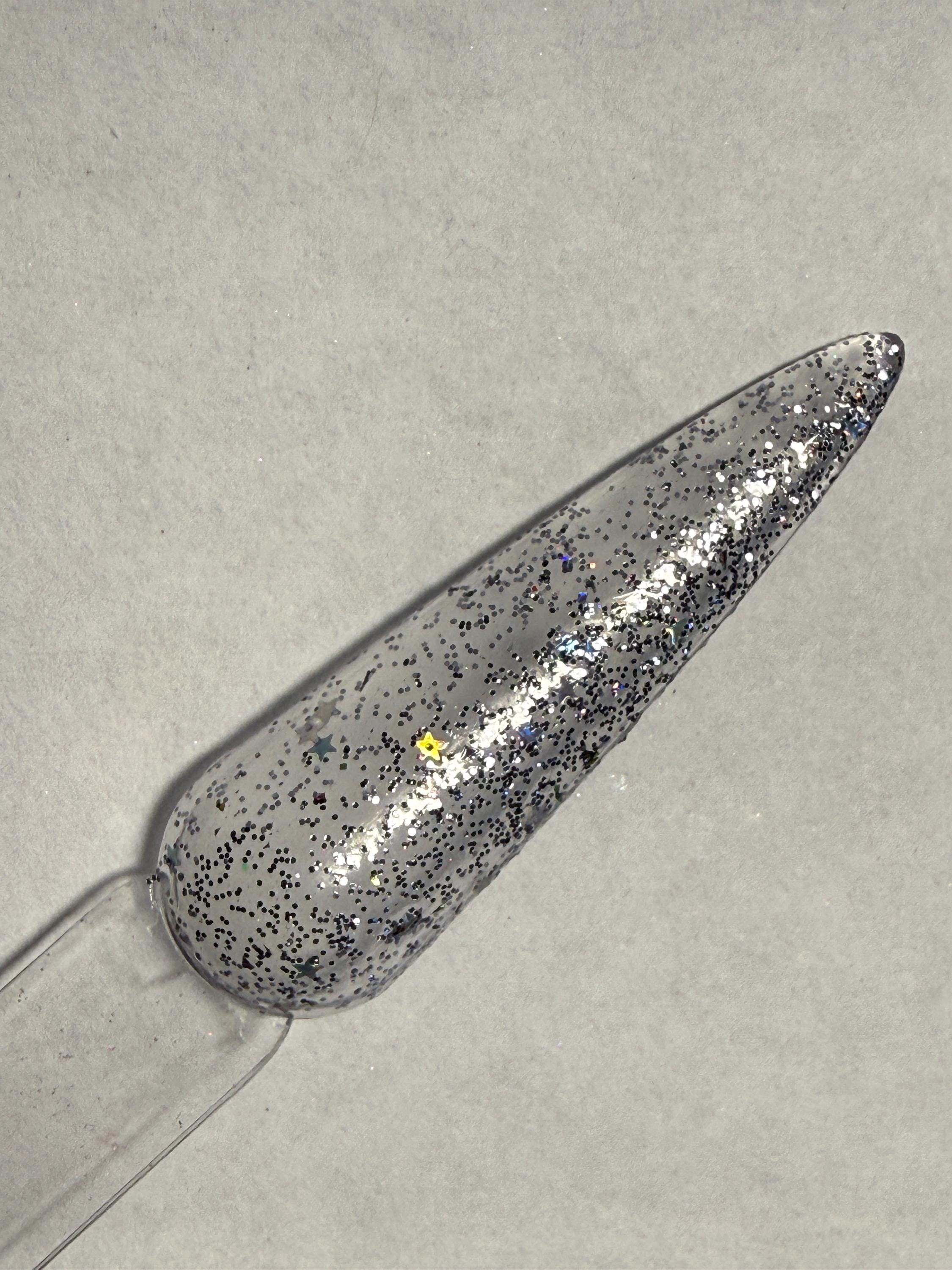 This nail polish comes in either 5 or 15ml bottles and has dark gray holo flakes, charcoal gray fine glitter, and some silver holographic stars.