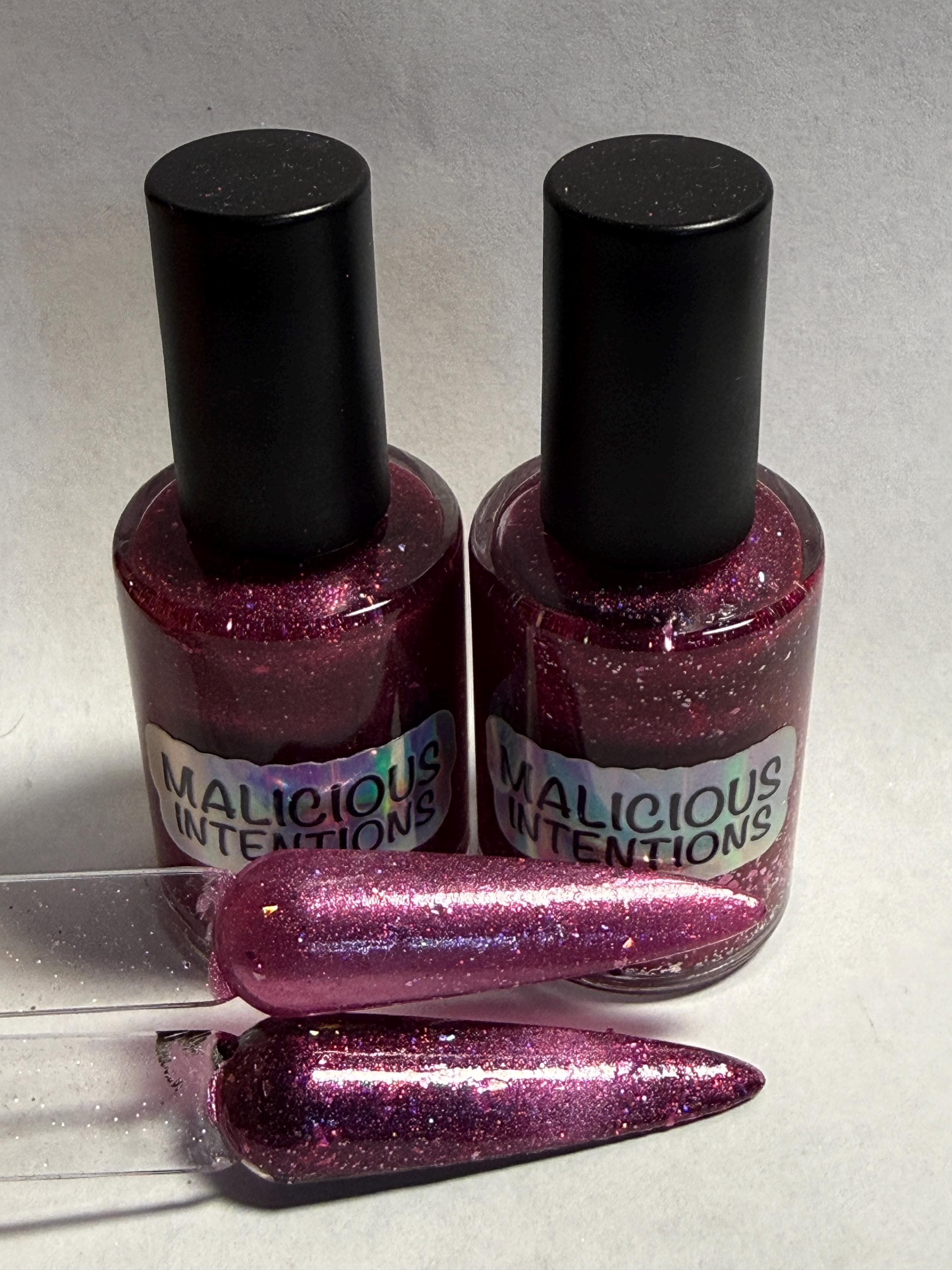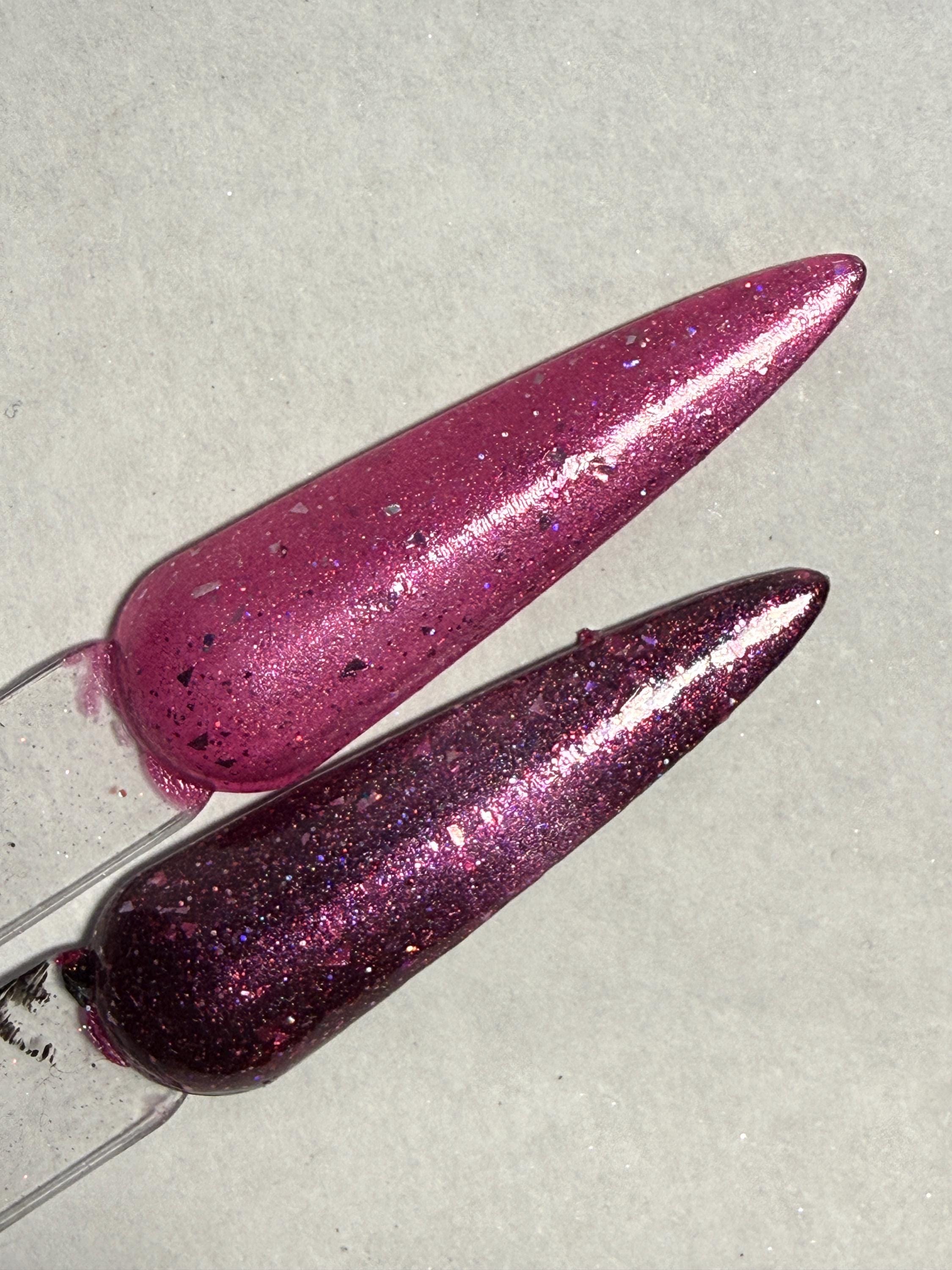 This nail polish comes in either 5 or 15ml bottles and is a magnetic bright pink with silver holographic flakes and reflective glitter throughout. You will need a magnet to take advantage of the magnetic properties within. It does not come with a magnet but if you'd like me to include one for $1, please check my other listings.