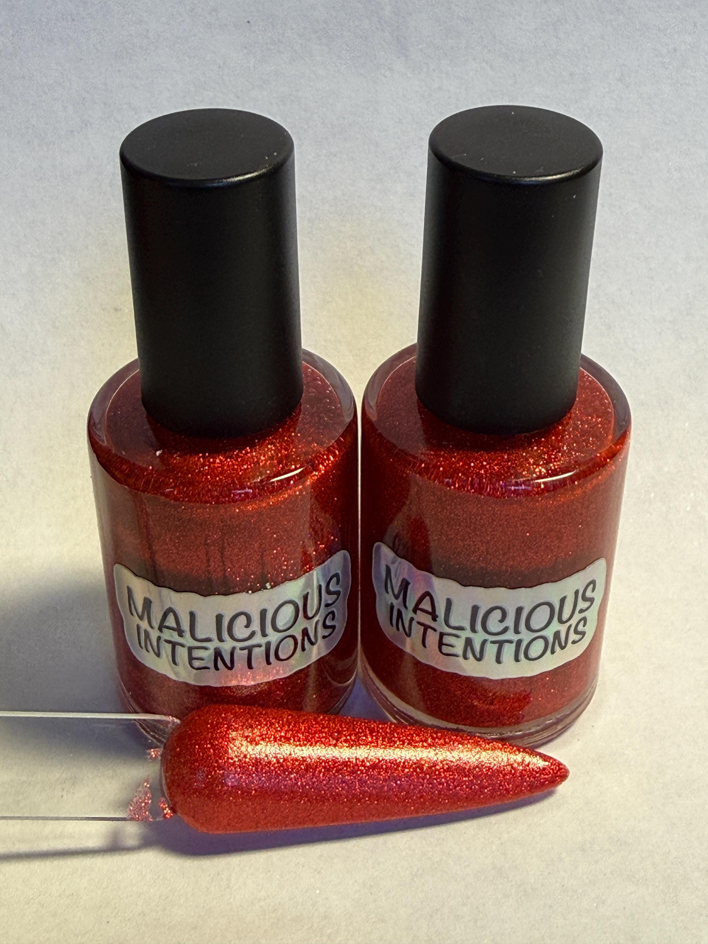 This nail polish comes in either 5 or 15ml bottles and is a very finely milled red holographic shimmer.