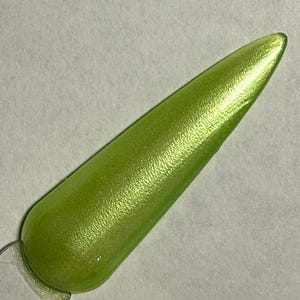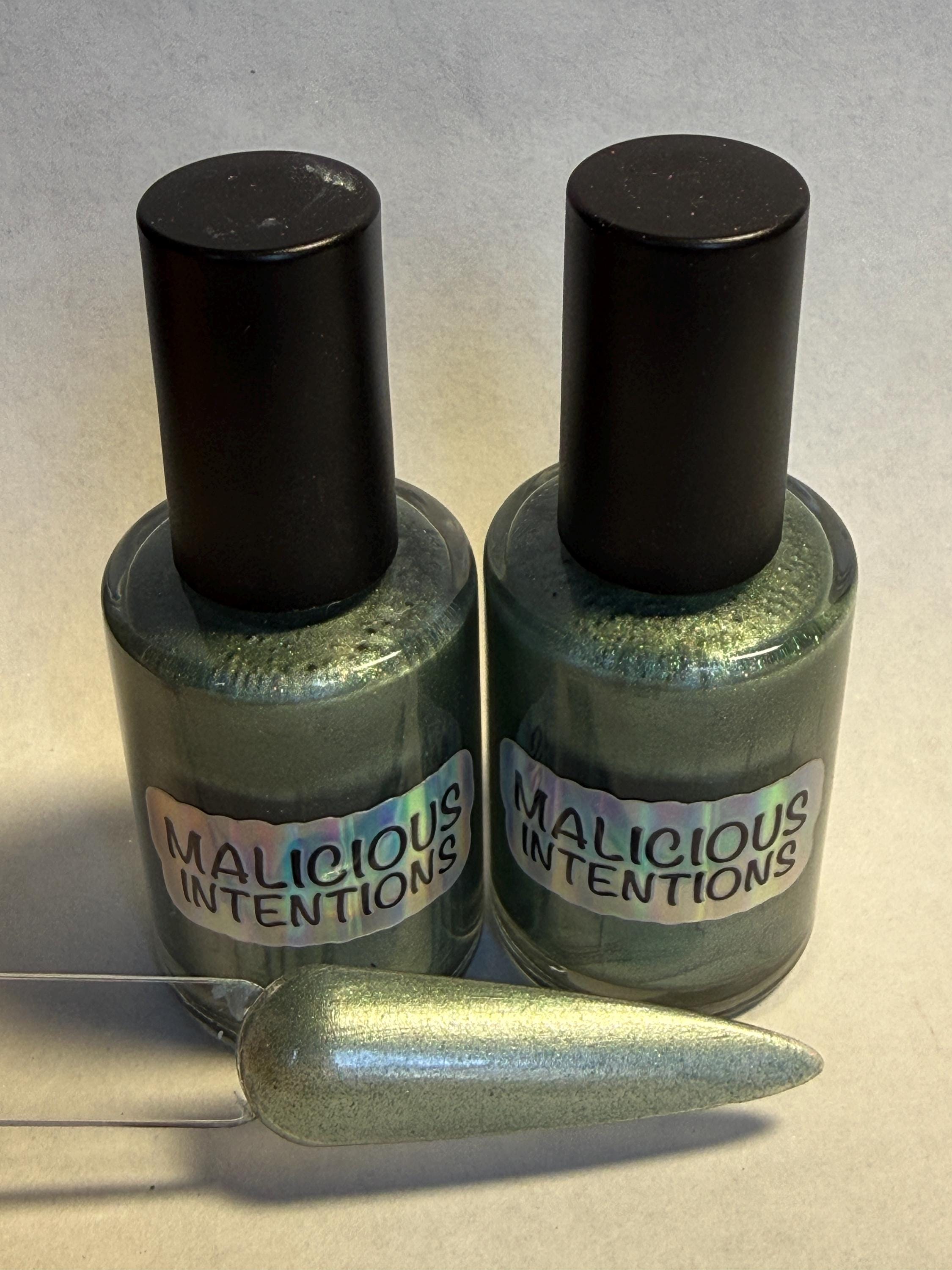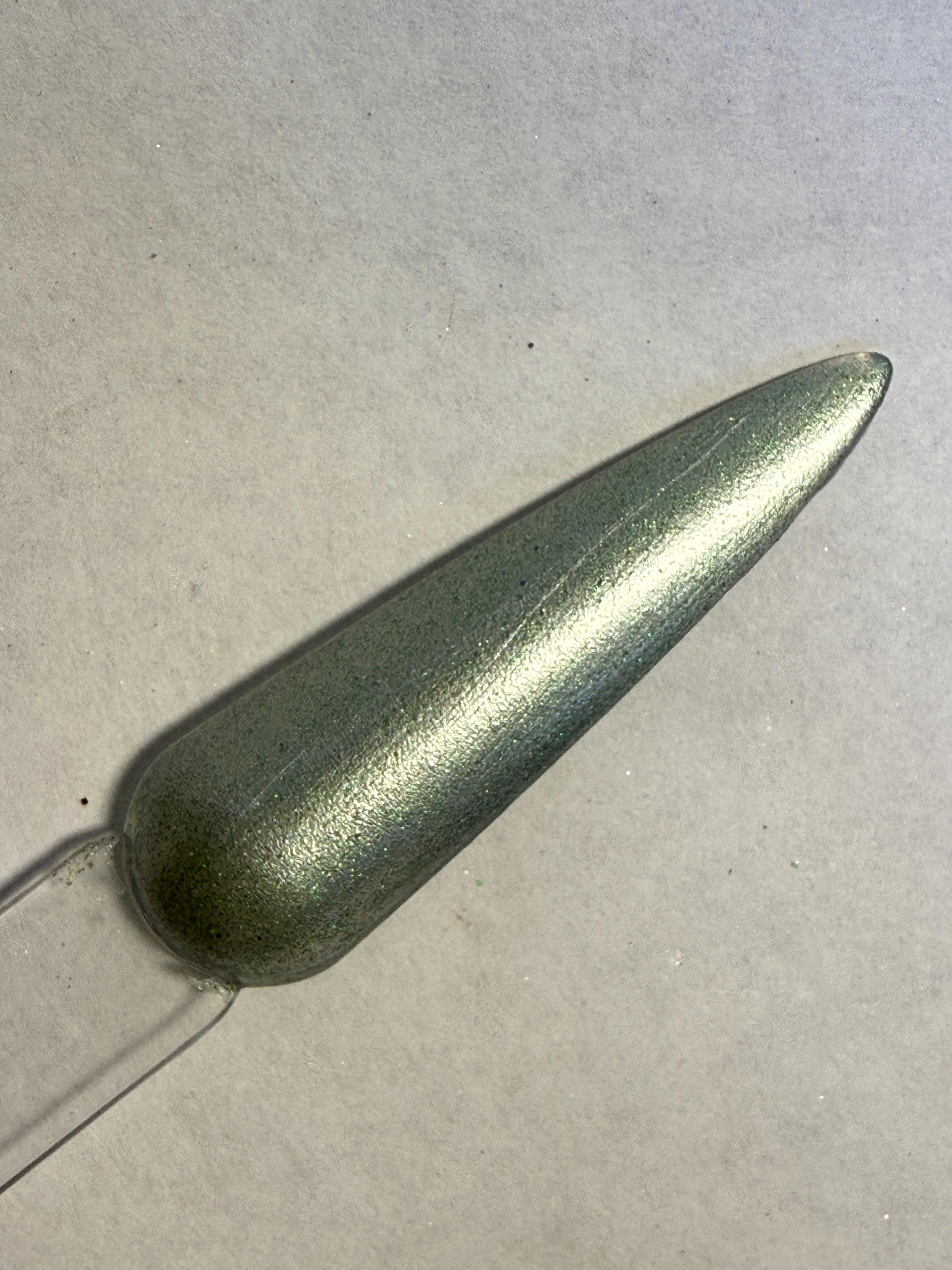 This nail polish comes in either 5 or 15ml bottles and is a moss green shimmer with very fine green holo mixed in.