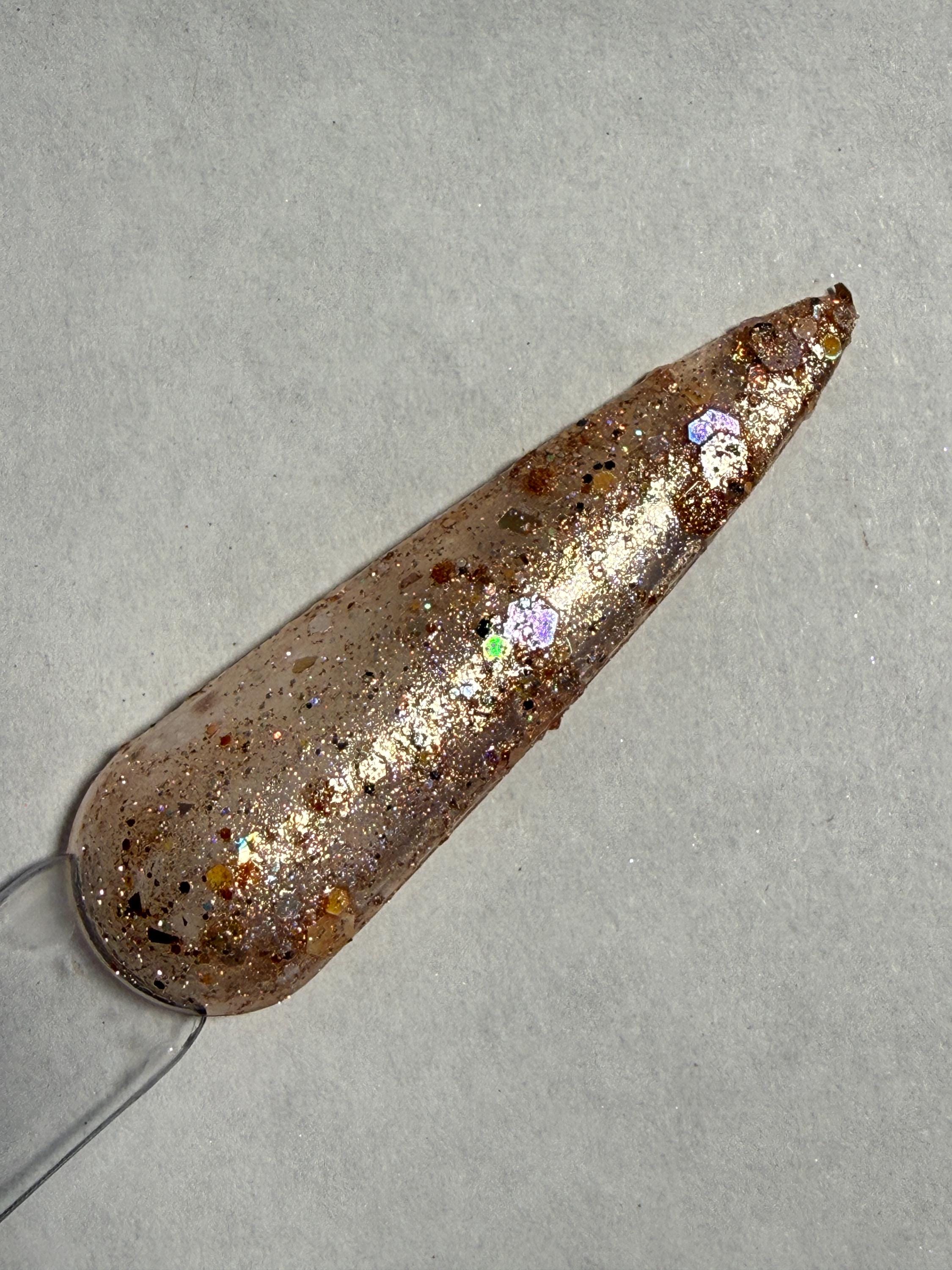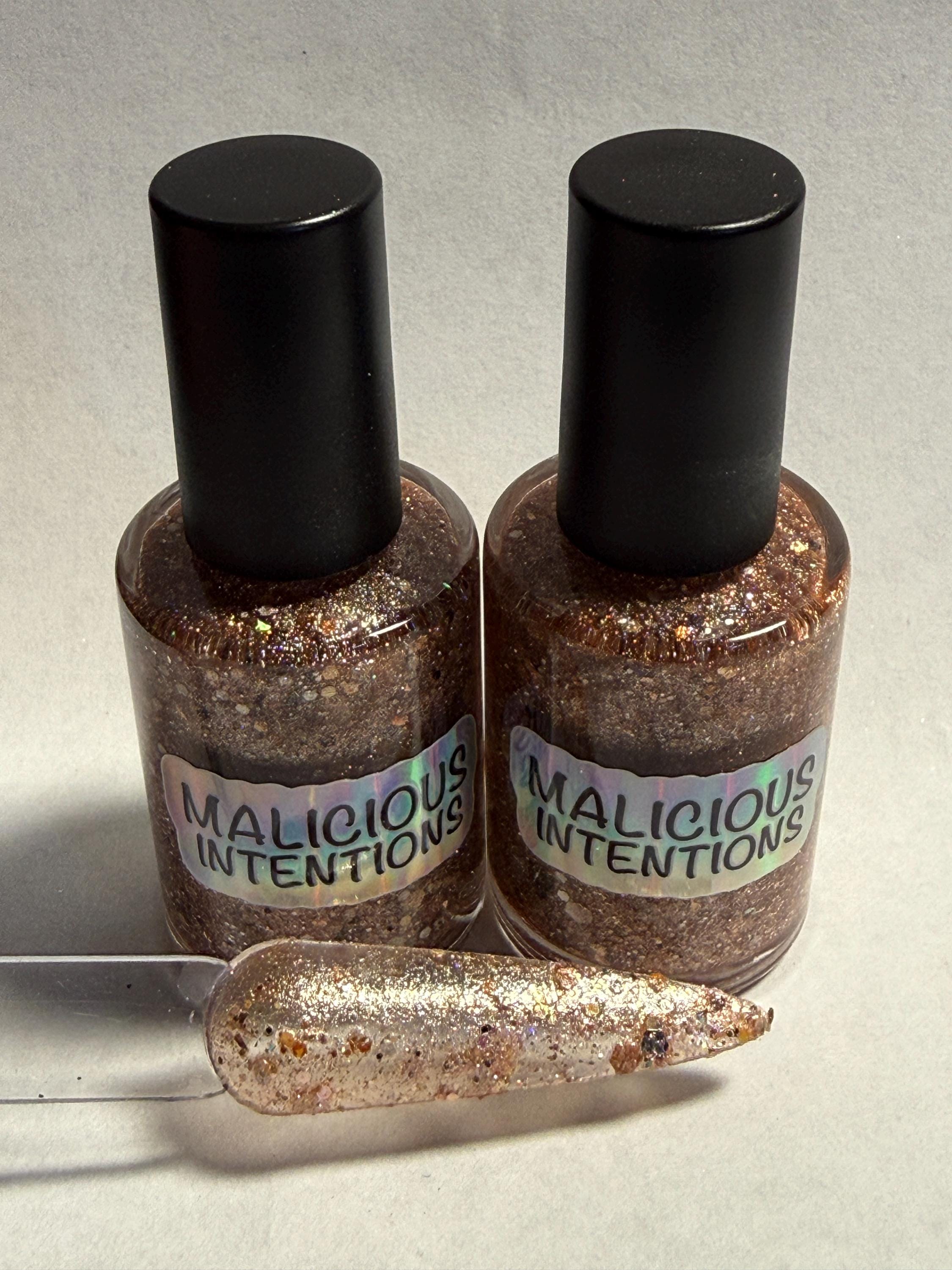 This nail polish comes in either 5 or 15ml bottles and is named so because its namesake favored this color palette. gilded gold with flecks of black, green, pink, and lavender.