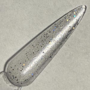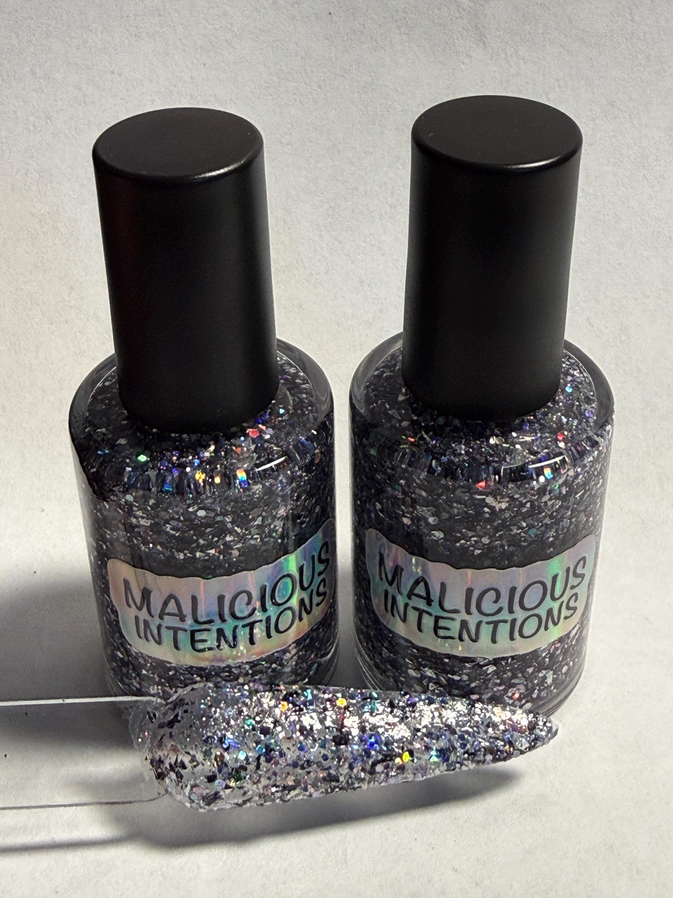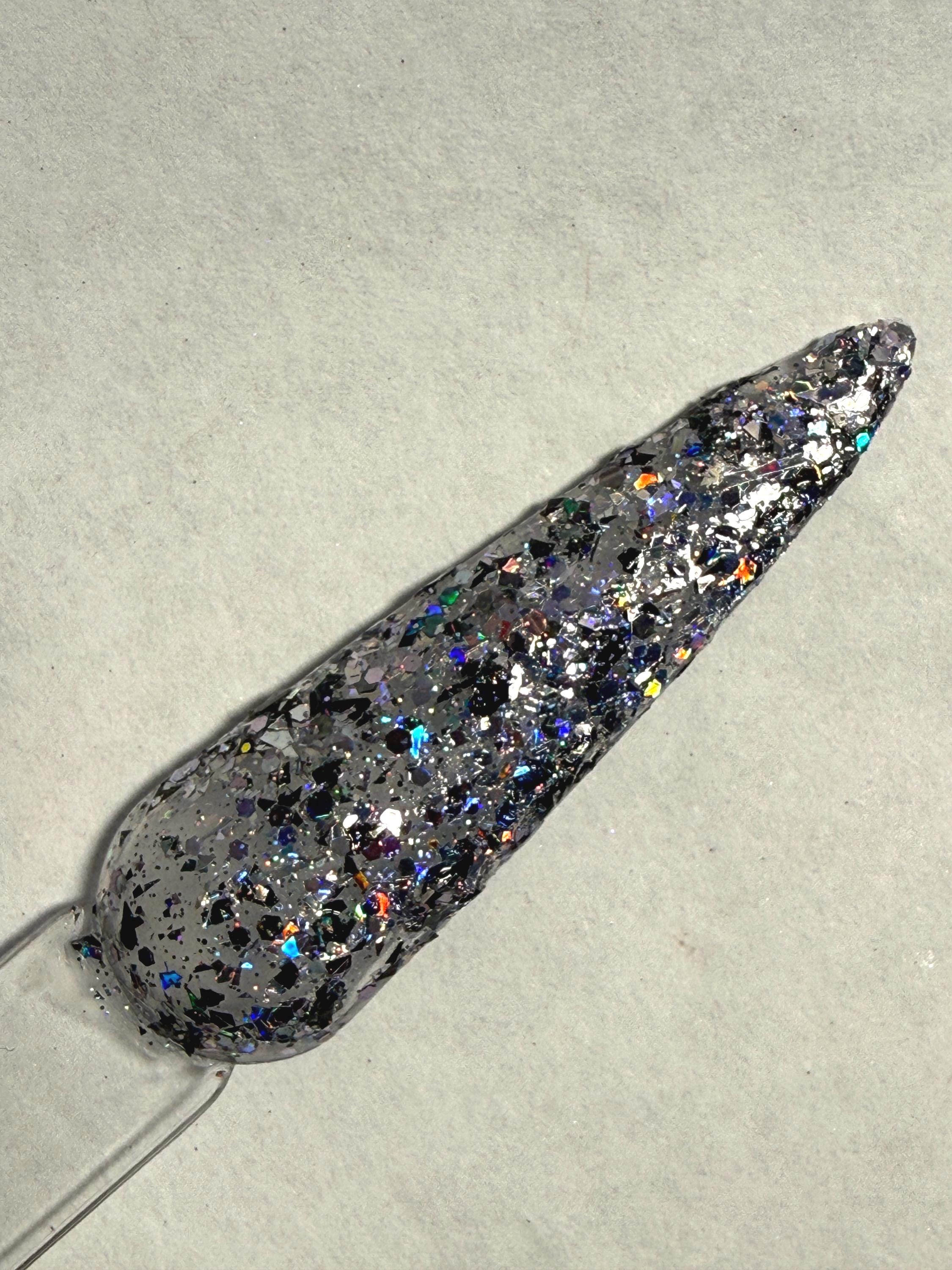 This nail polish comes in either 5 or 15ml bottles and has black and silver holo glitters and flakes.