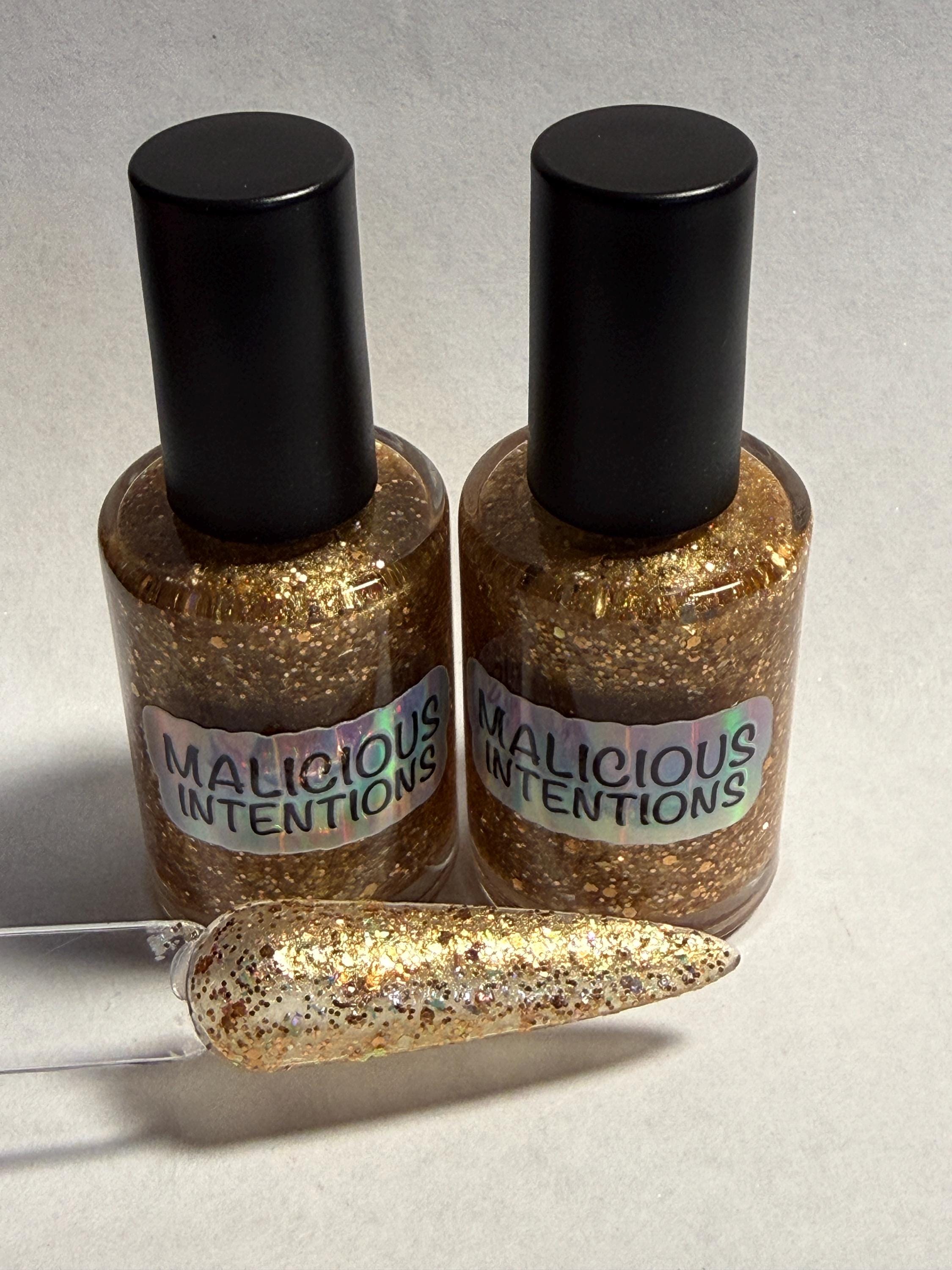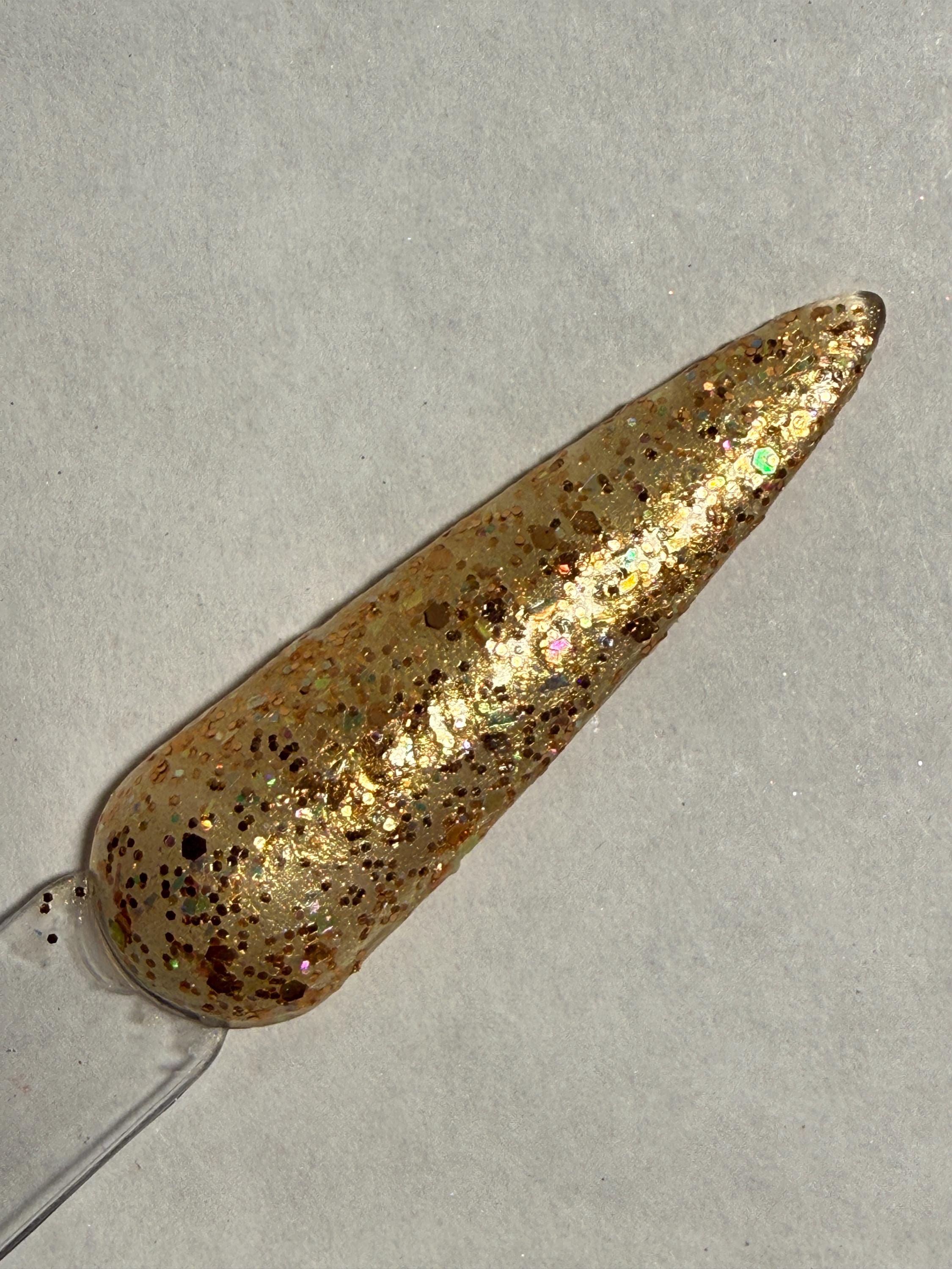 This nail polish comes in either 5 or 15ml bottles and is a warm gold shimmer with iridescent glitter throughout.
