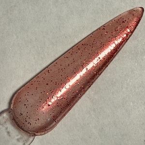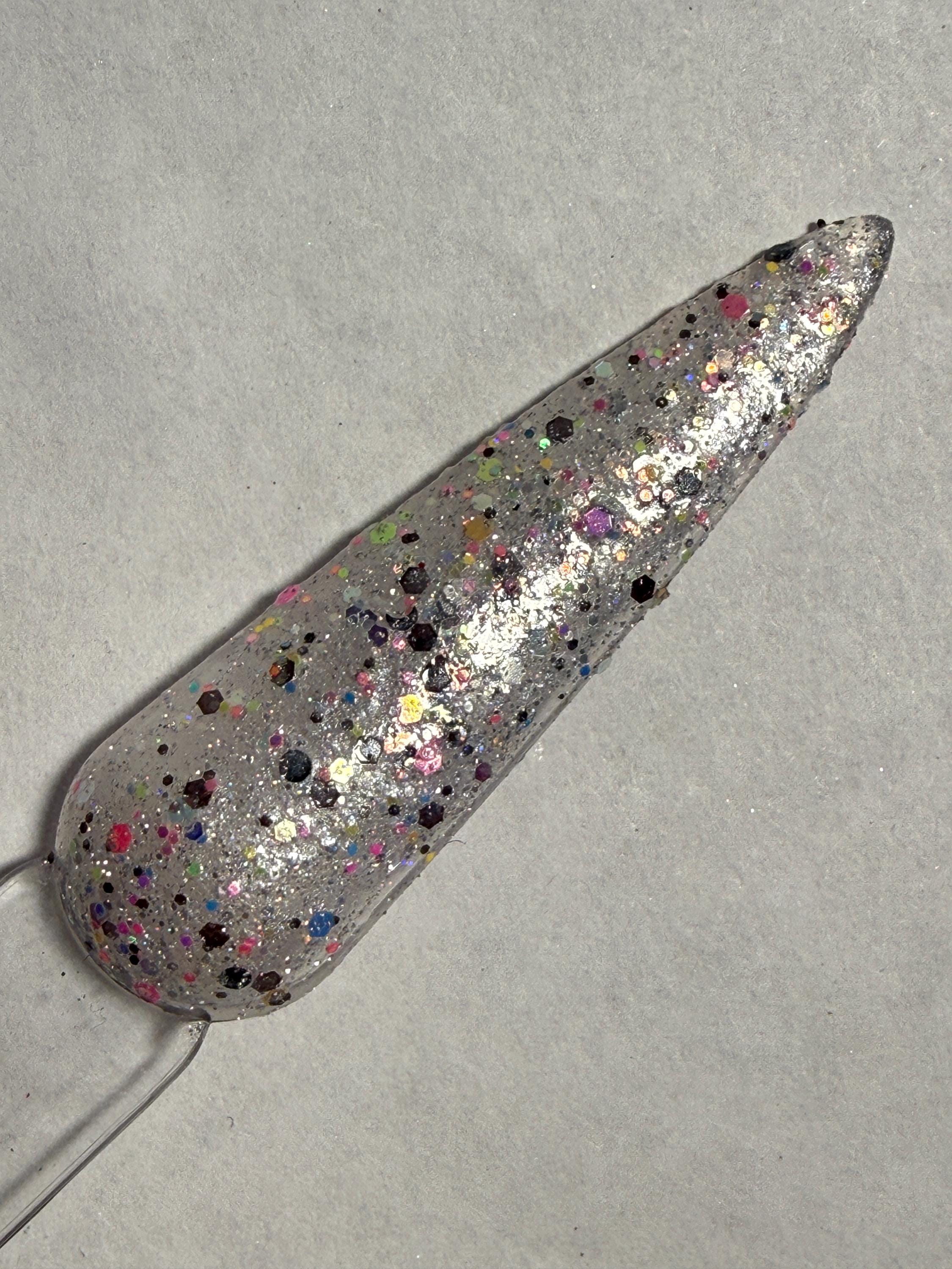 This nail polish comes in either 5 or 15ml bottles and has a gold shimmery base with pink, black, and iridescent glitters throughout.