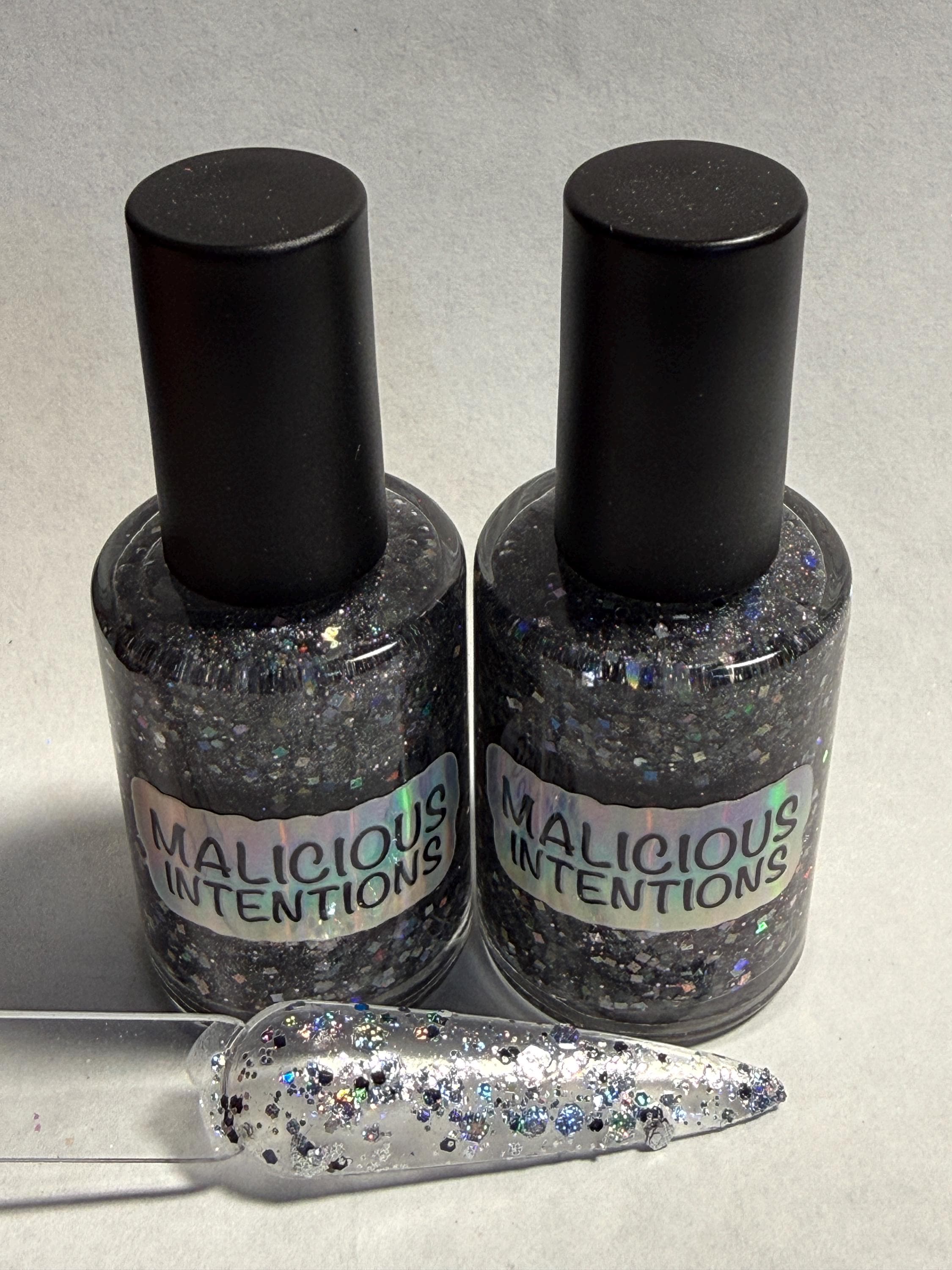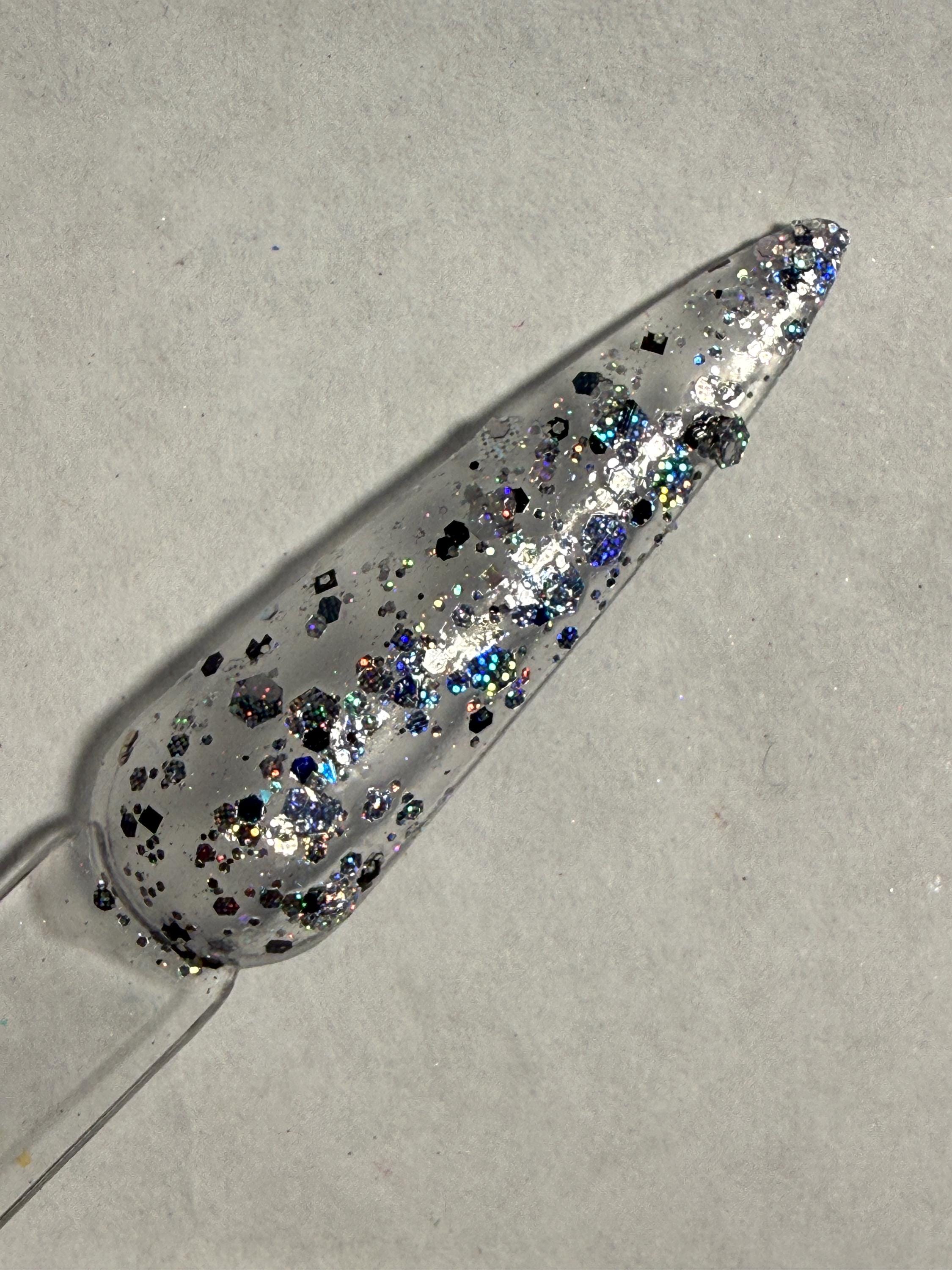 This nail polish comes in either 5 or 15ml bottles and has black and silver print holo glitters of various sizes and a few flecks of black.