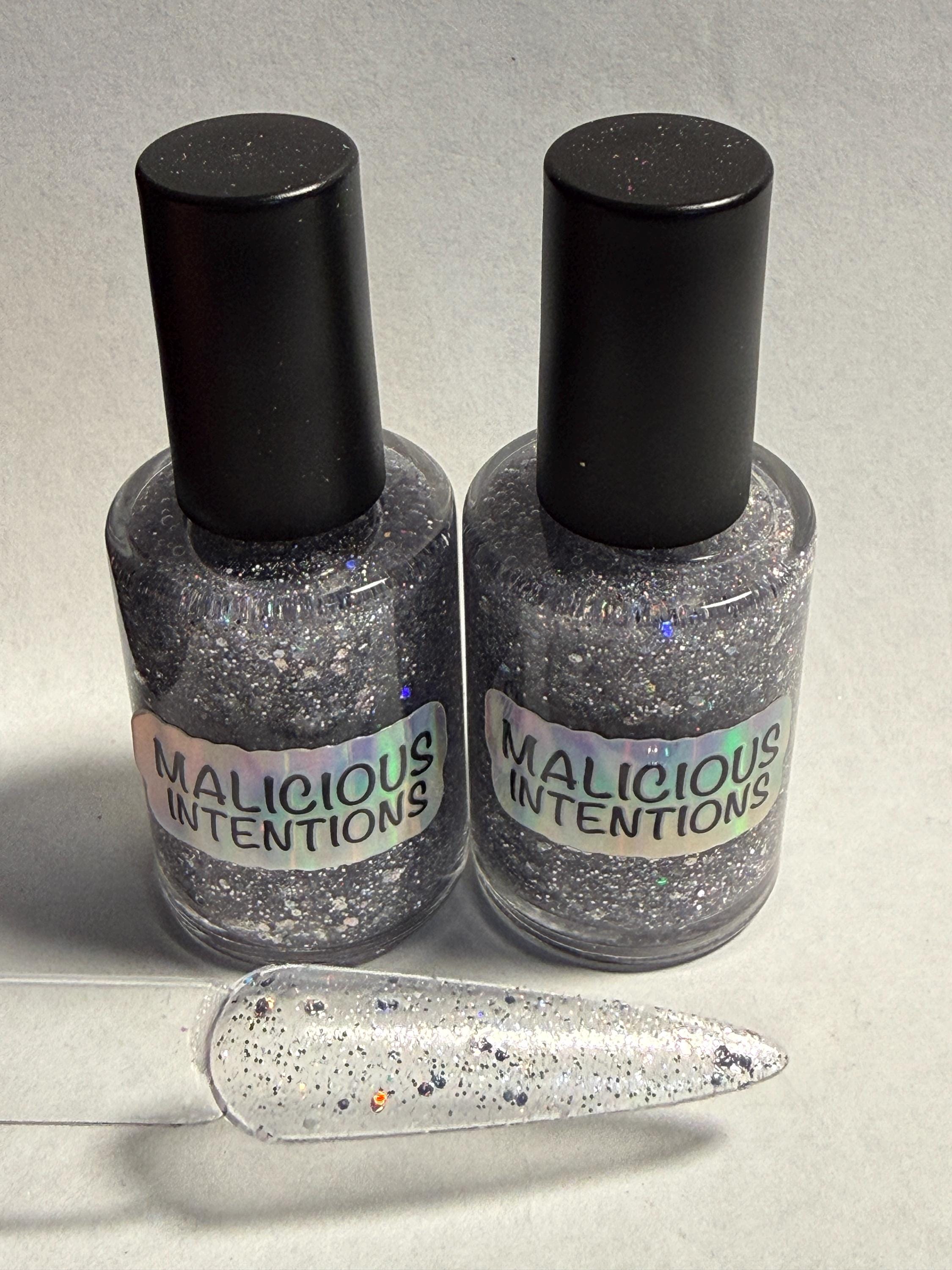 This nail polish comes in either 5 or 15ml bottles and has fine silver glitter with holo glitter of various sizes.
