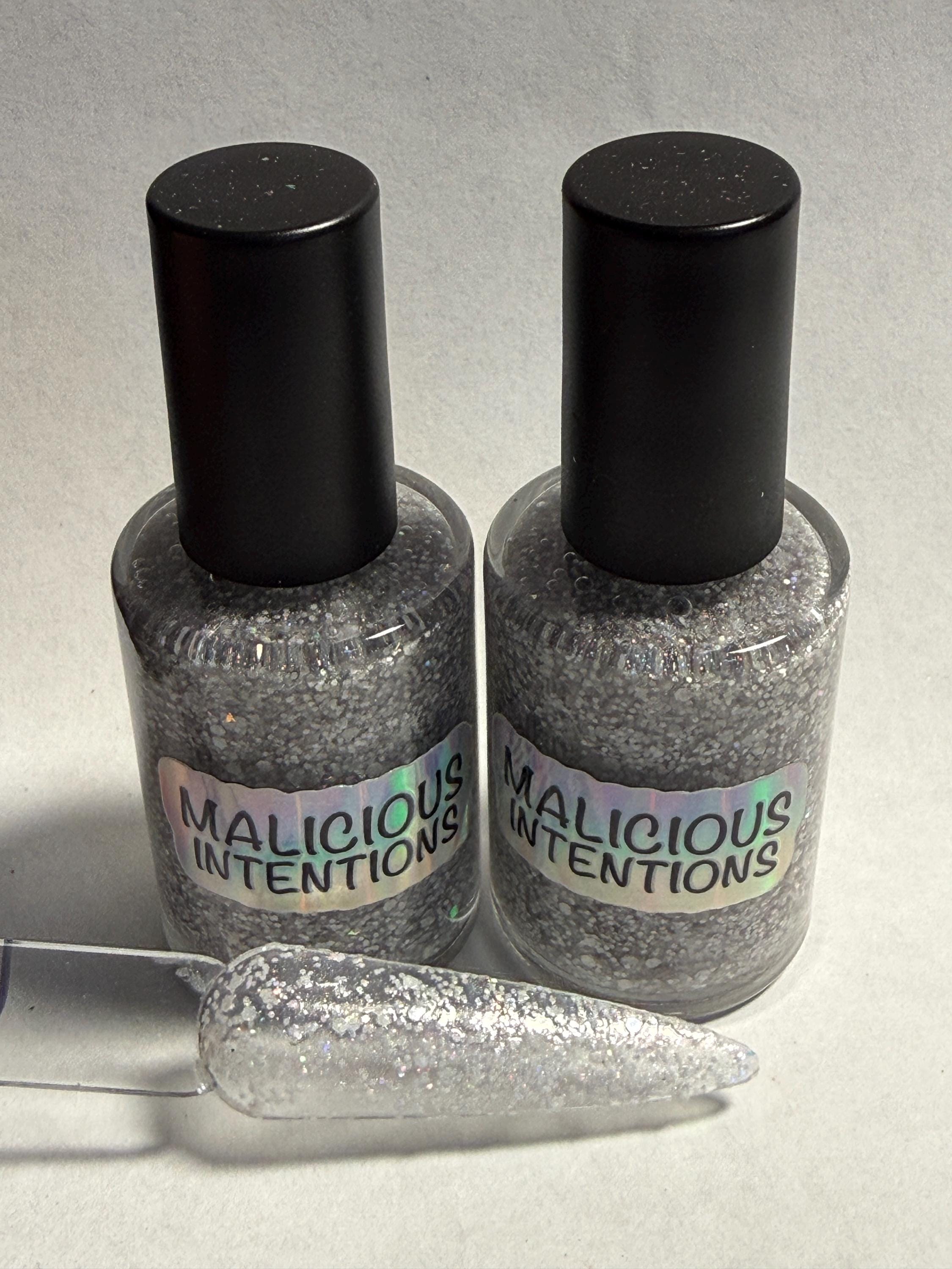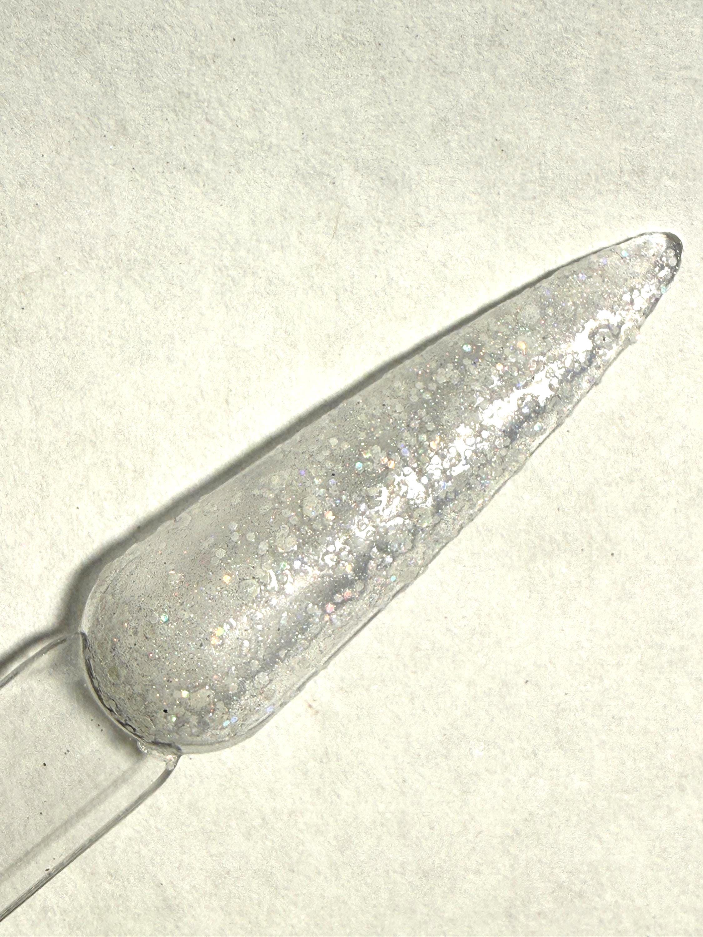 This nail polish comes in either 5 or 15ml bottles and has white iridescent opaque glitter with a touch of holo.