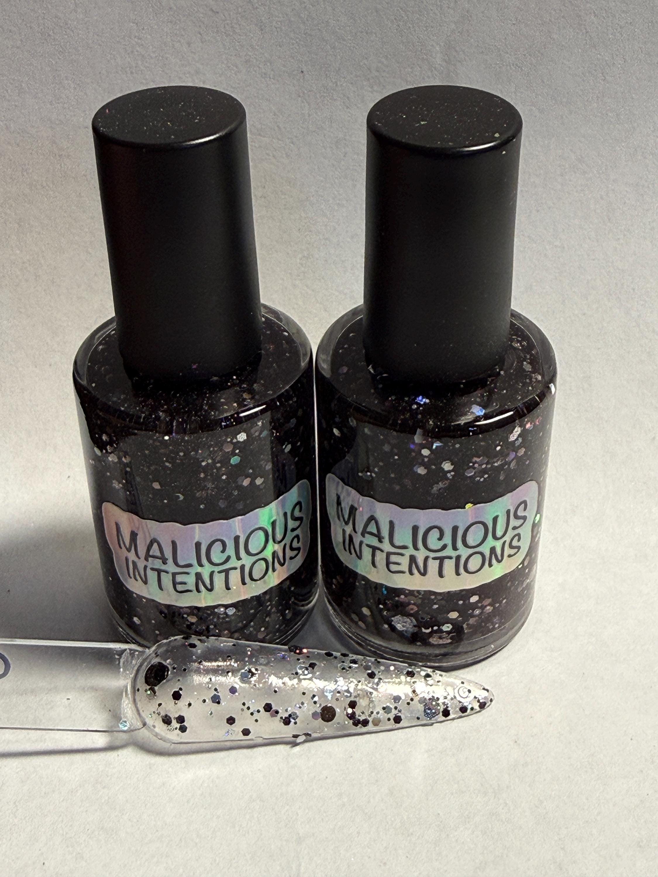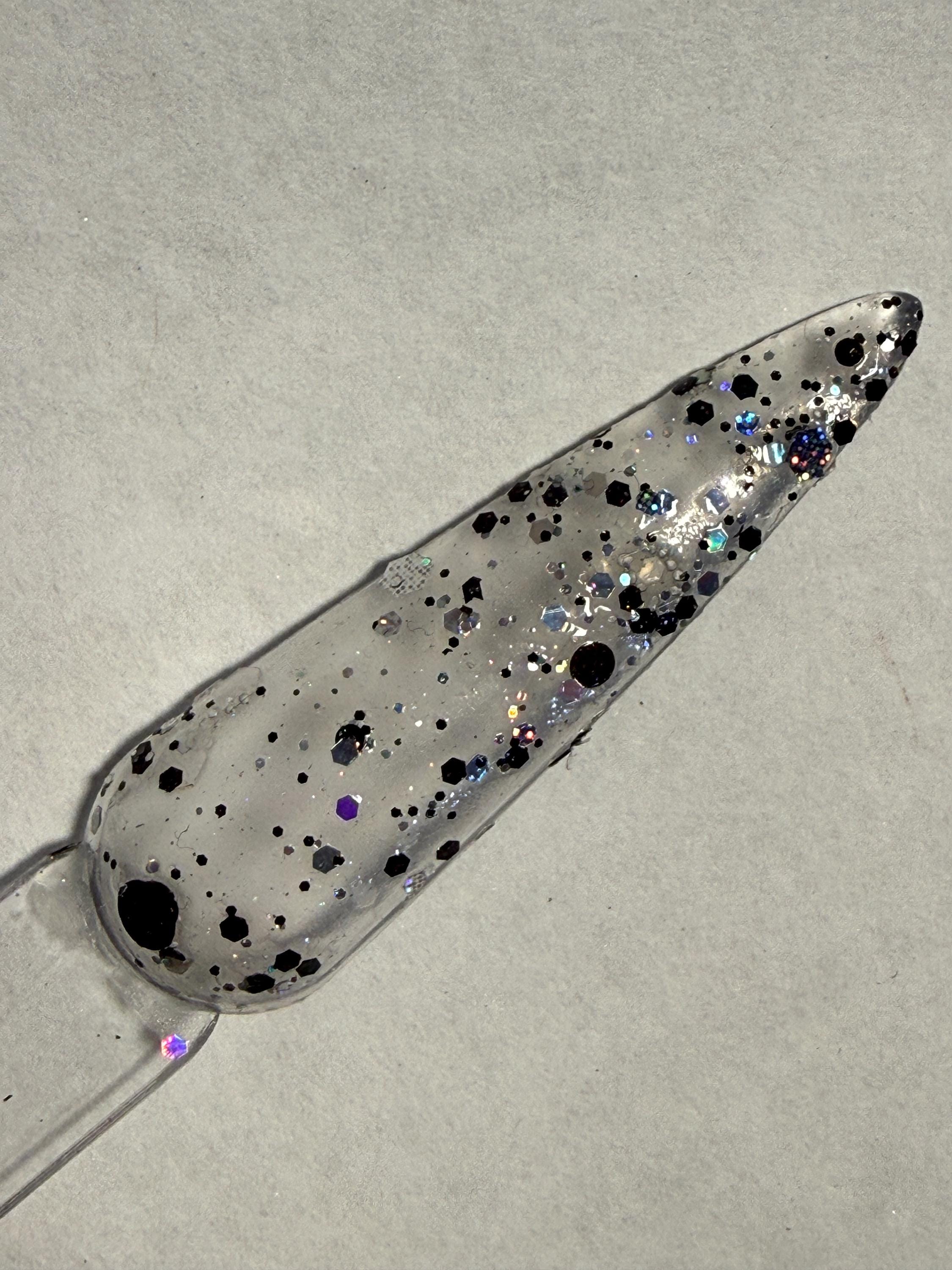This nail polish comes in either 5 or 15ml bottles and has black and silver round glitters of various sizes.