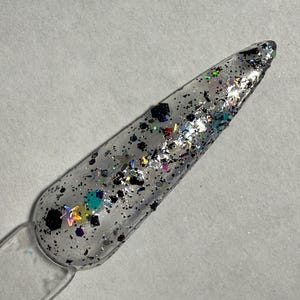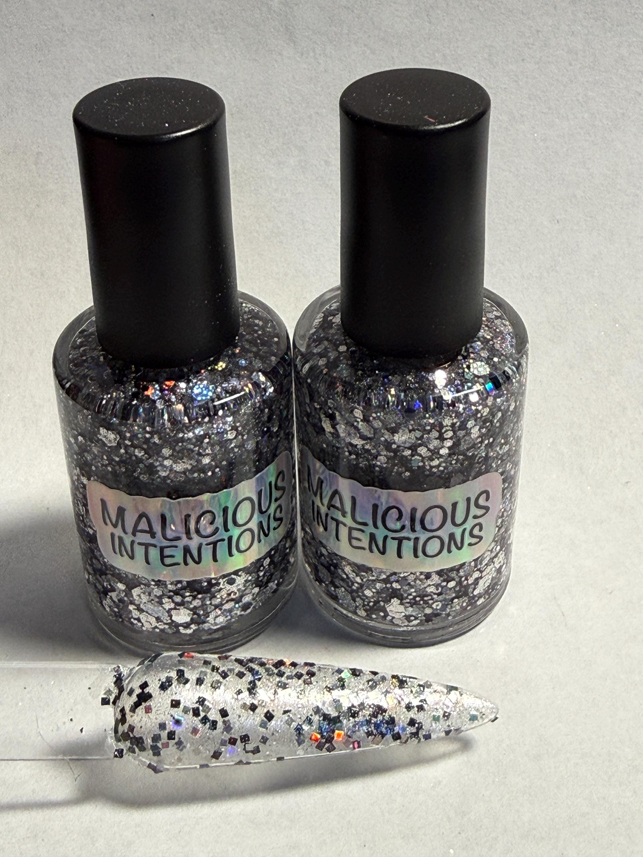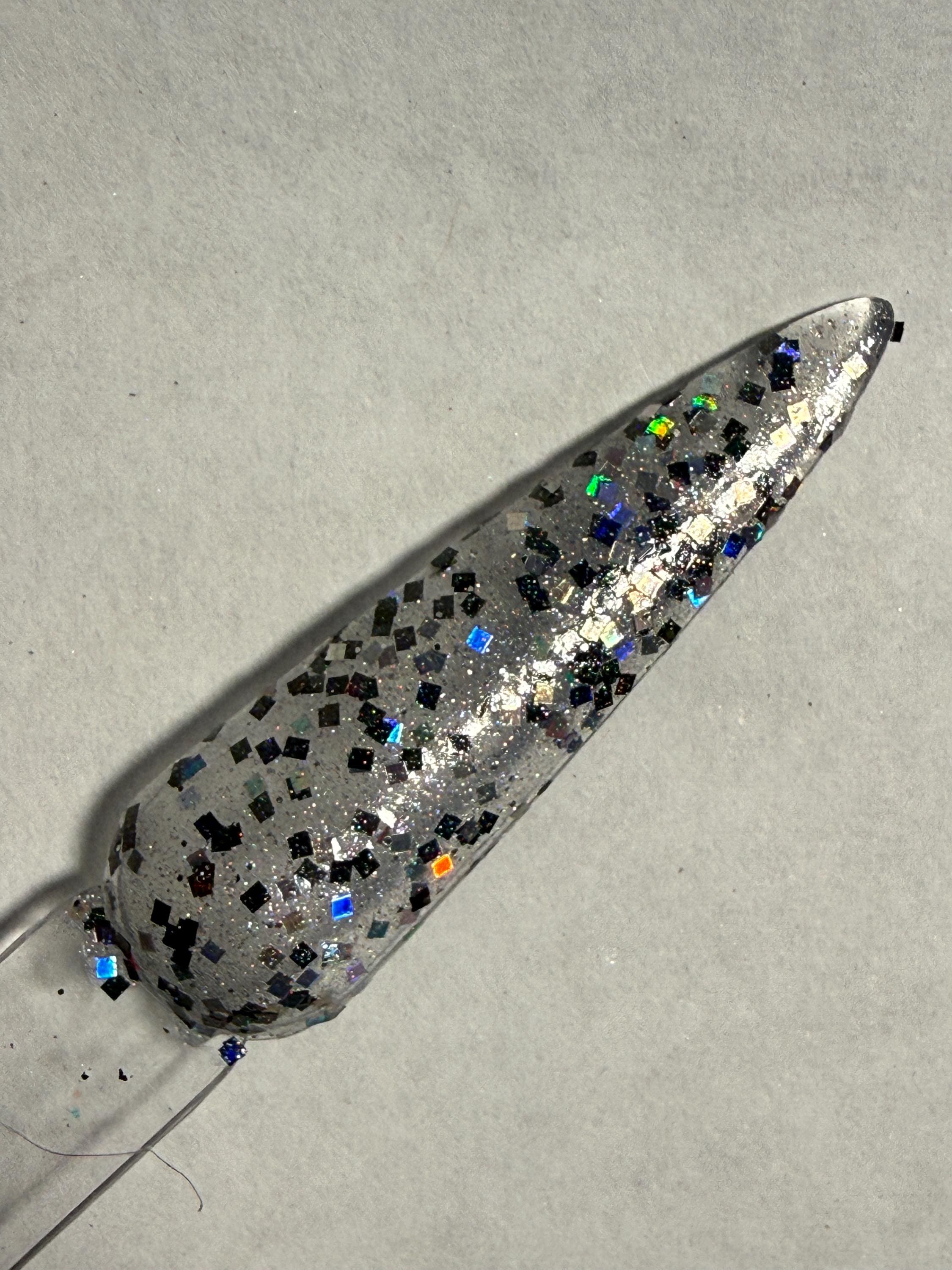 This nail polish comes in either 5 or 15ml bottles and has black and silver holographic squares.