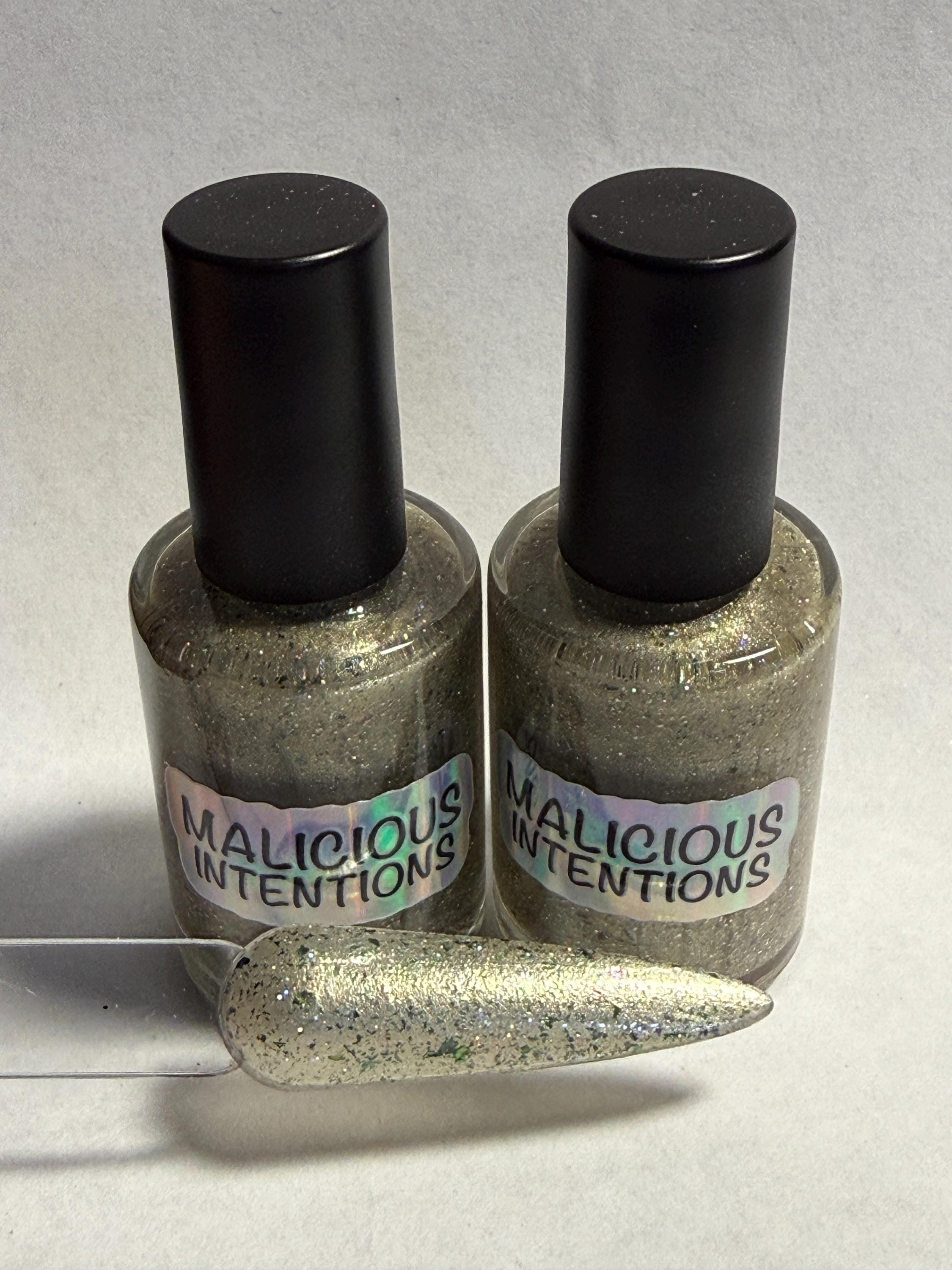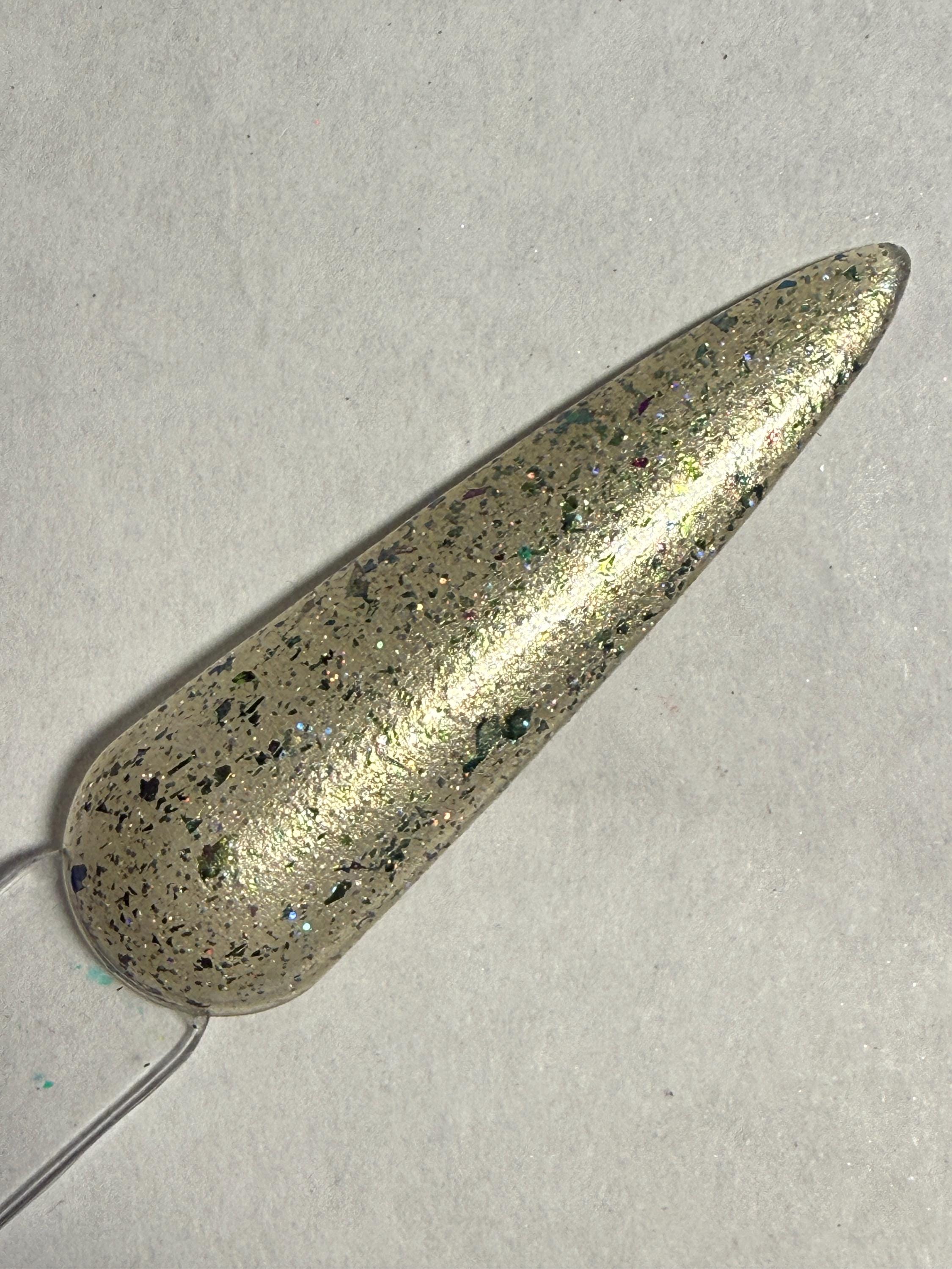 This nail polish comes in either 5 or 15ml bottles and is a celery green shimmer with green/gold chameleon flakes and holographic glitter.
