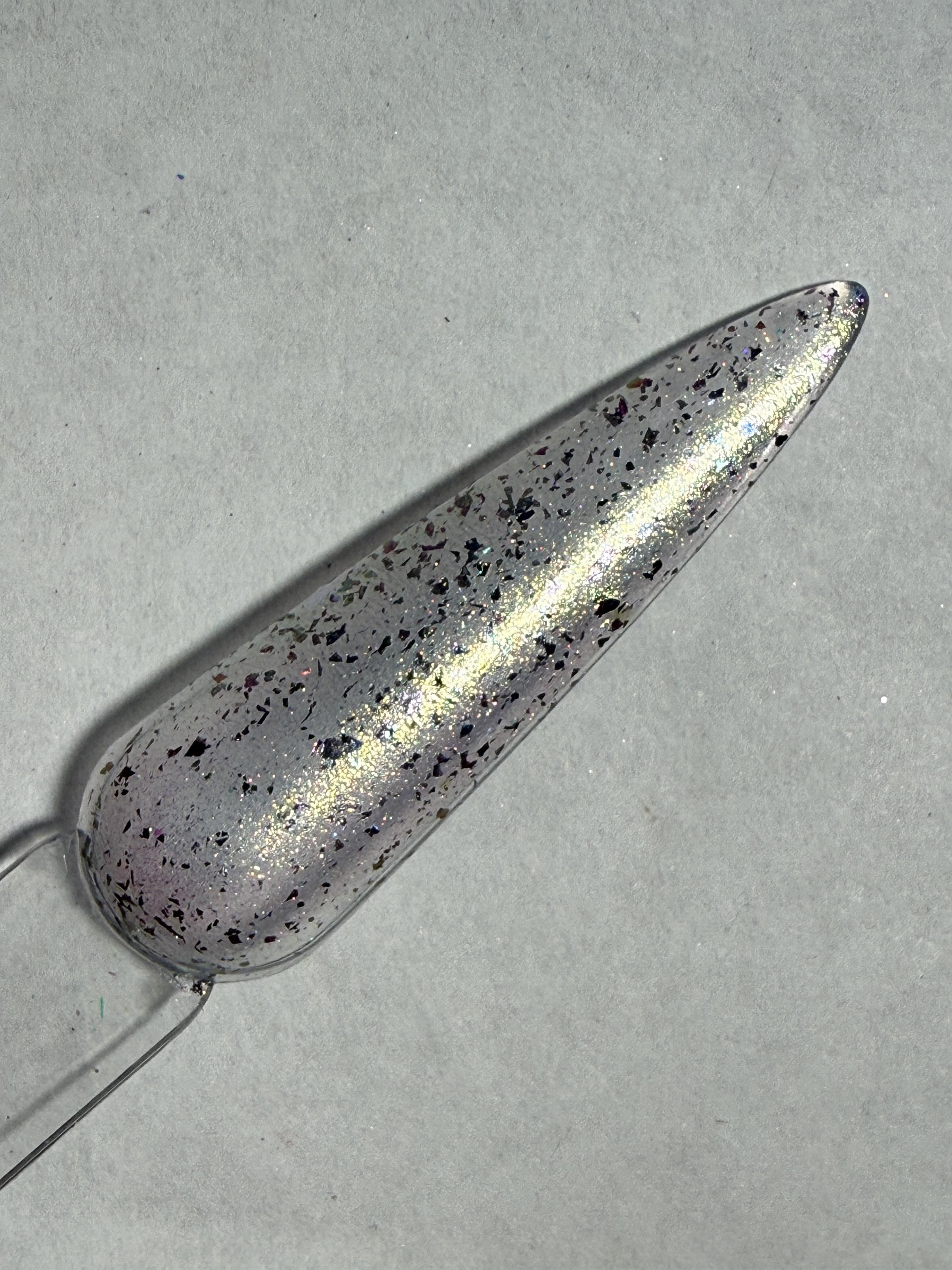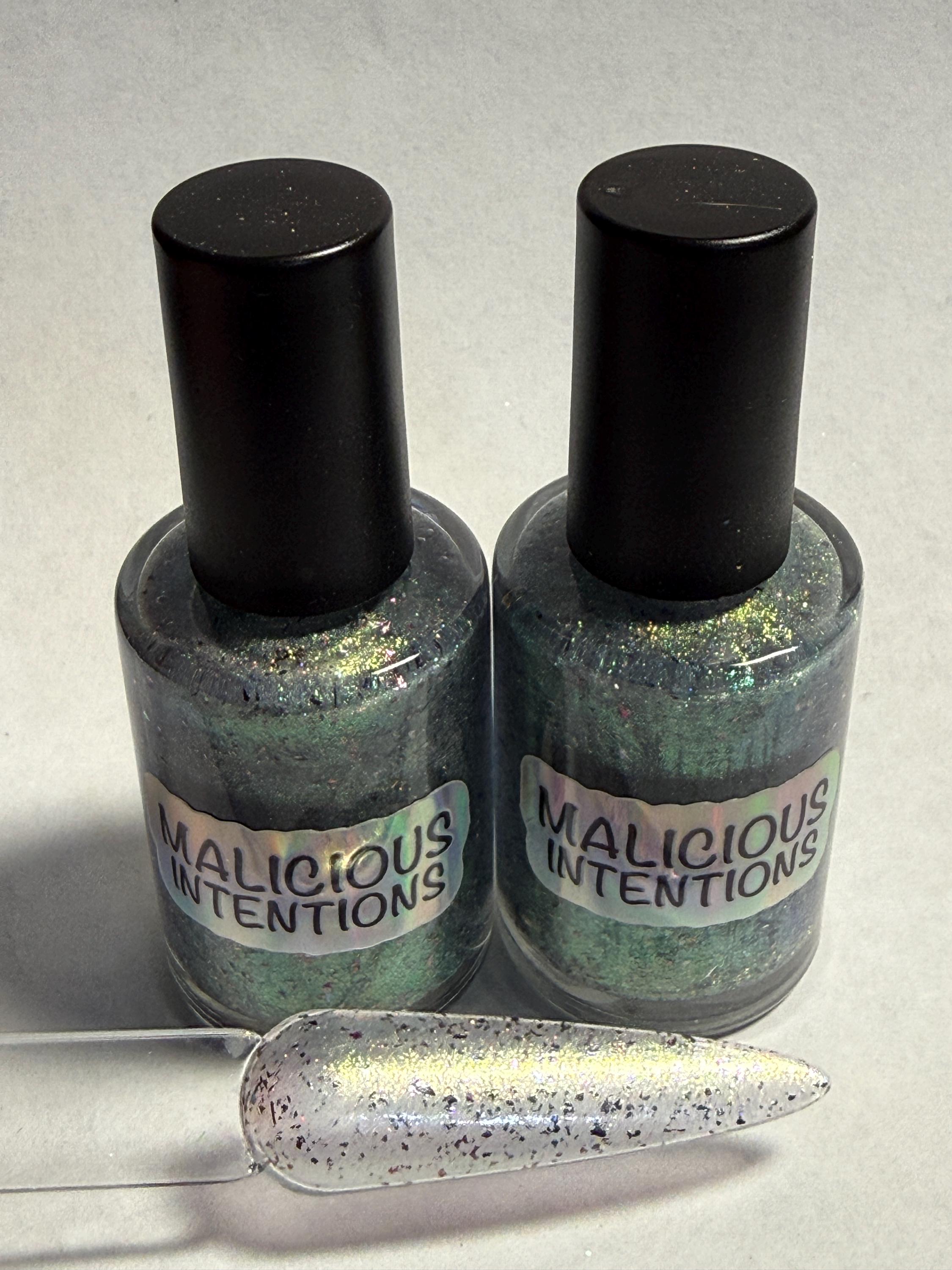 This nail polish comes in either 5 or 15ml bottles and is a green duochrome shimmery base with pink/purple chameleon flakes and holographic glitter.