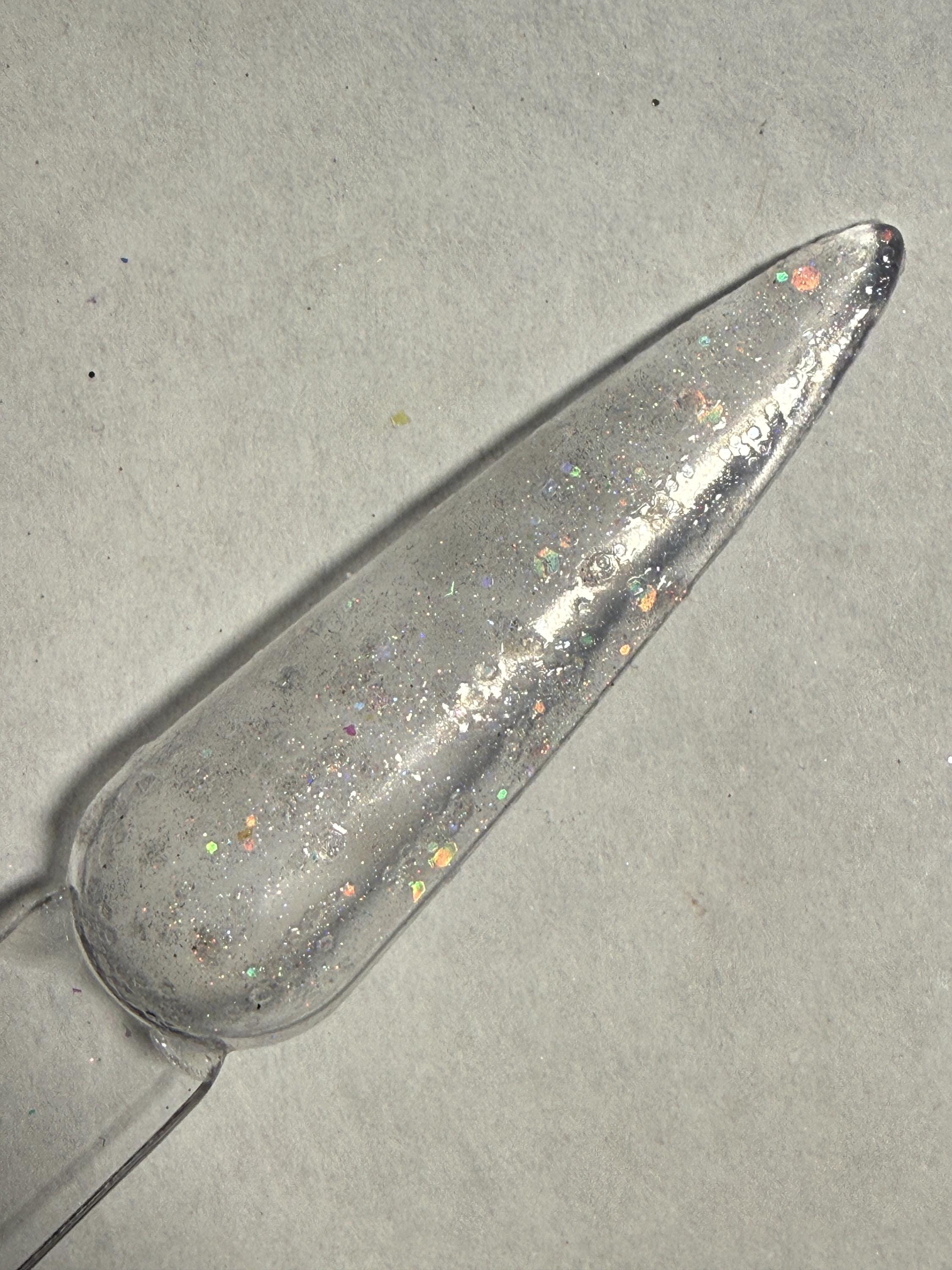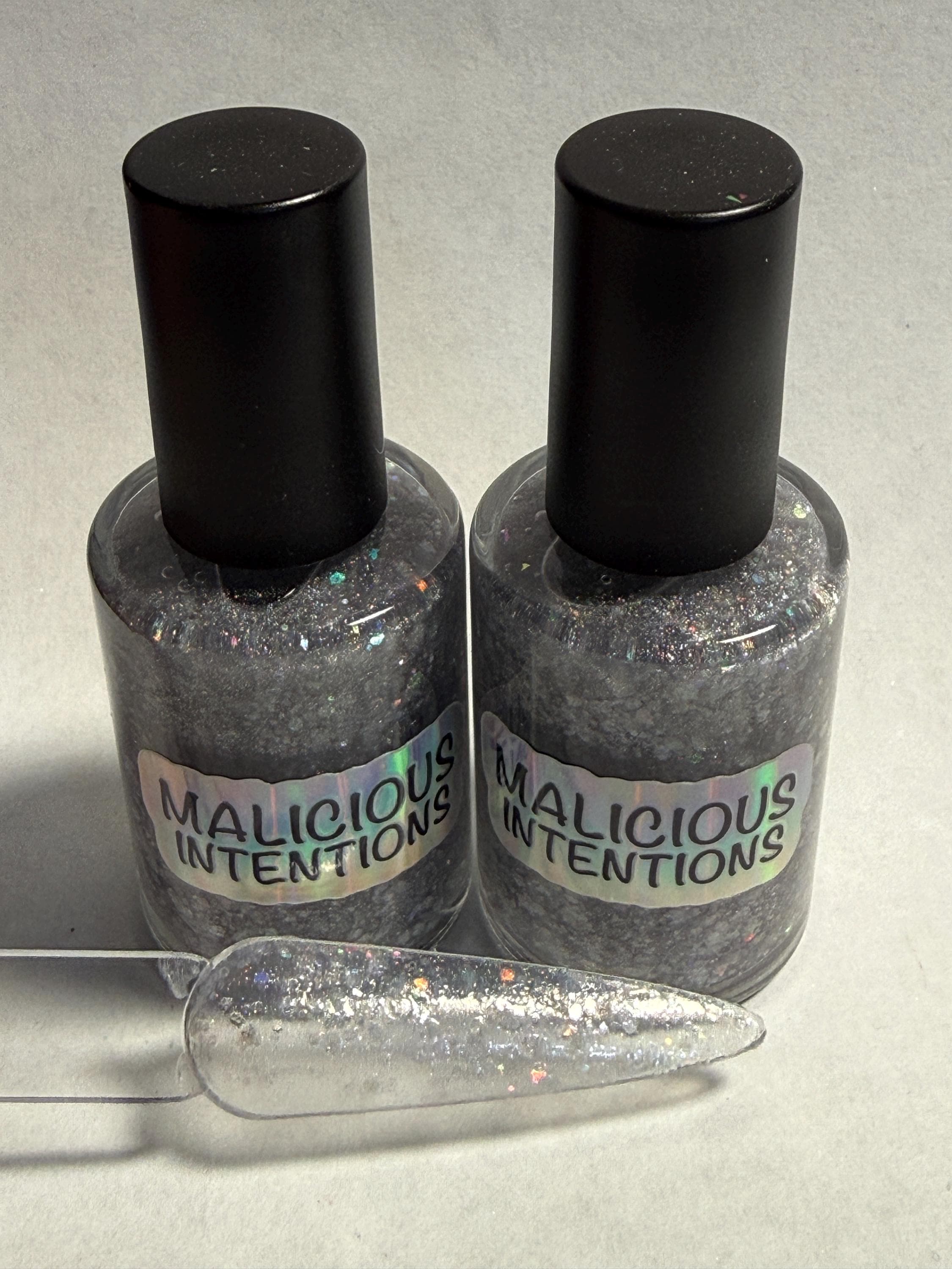 This nail polish comes in either 5 or 15ml bottles and has sheer gray holographic glitter of a variety of sizes on a sheer silver holo base.