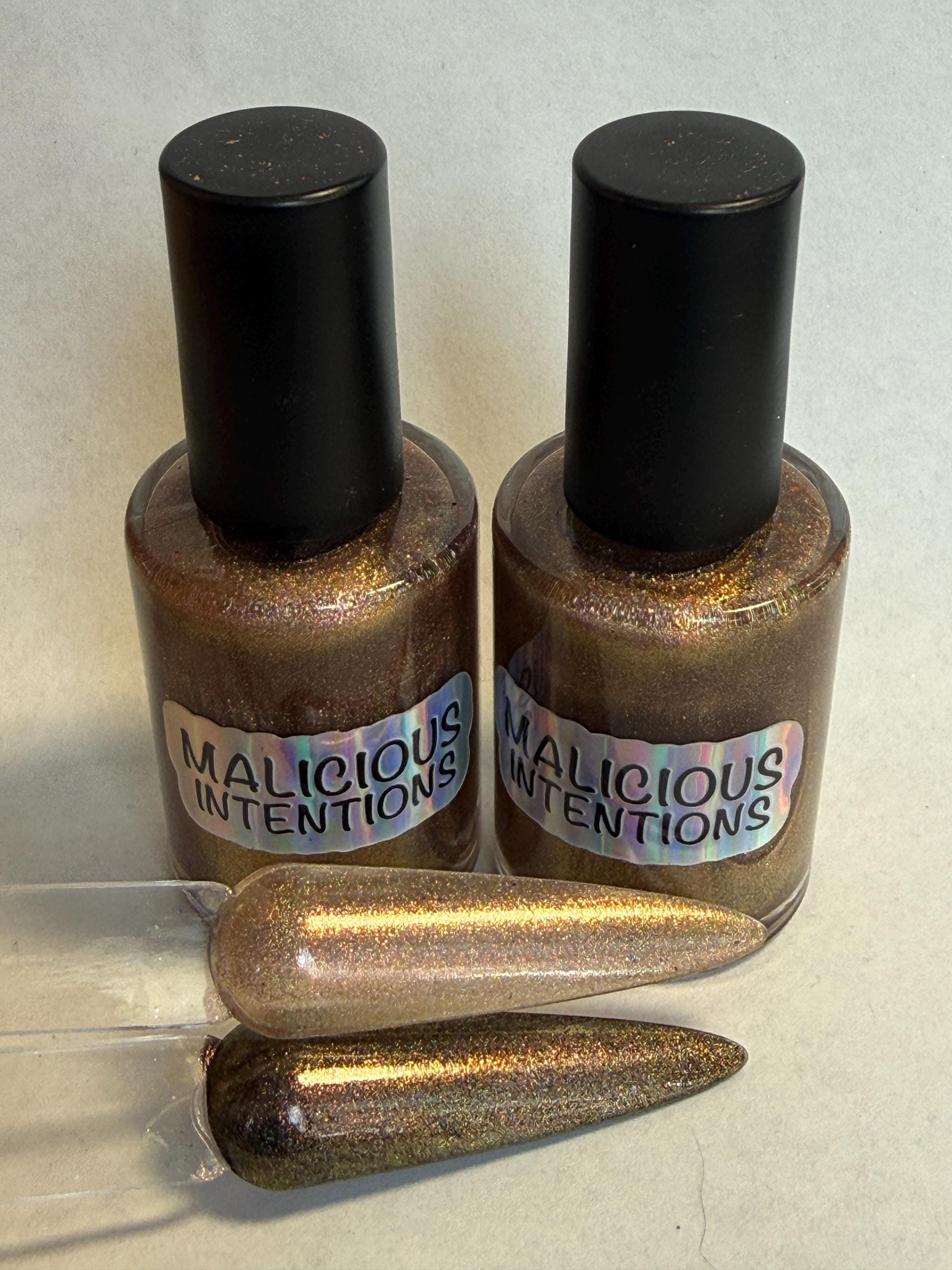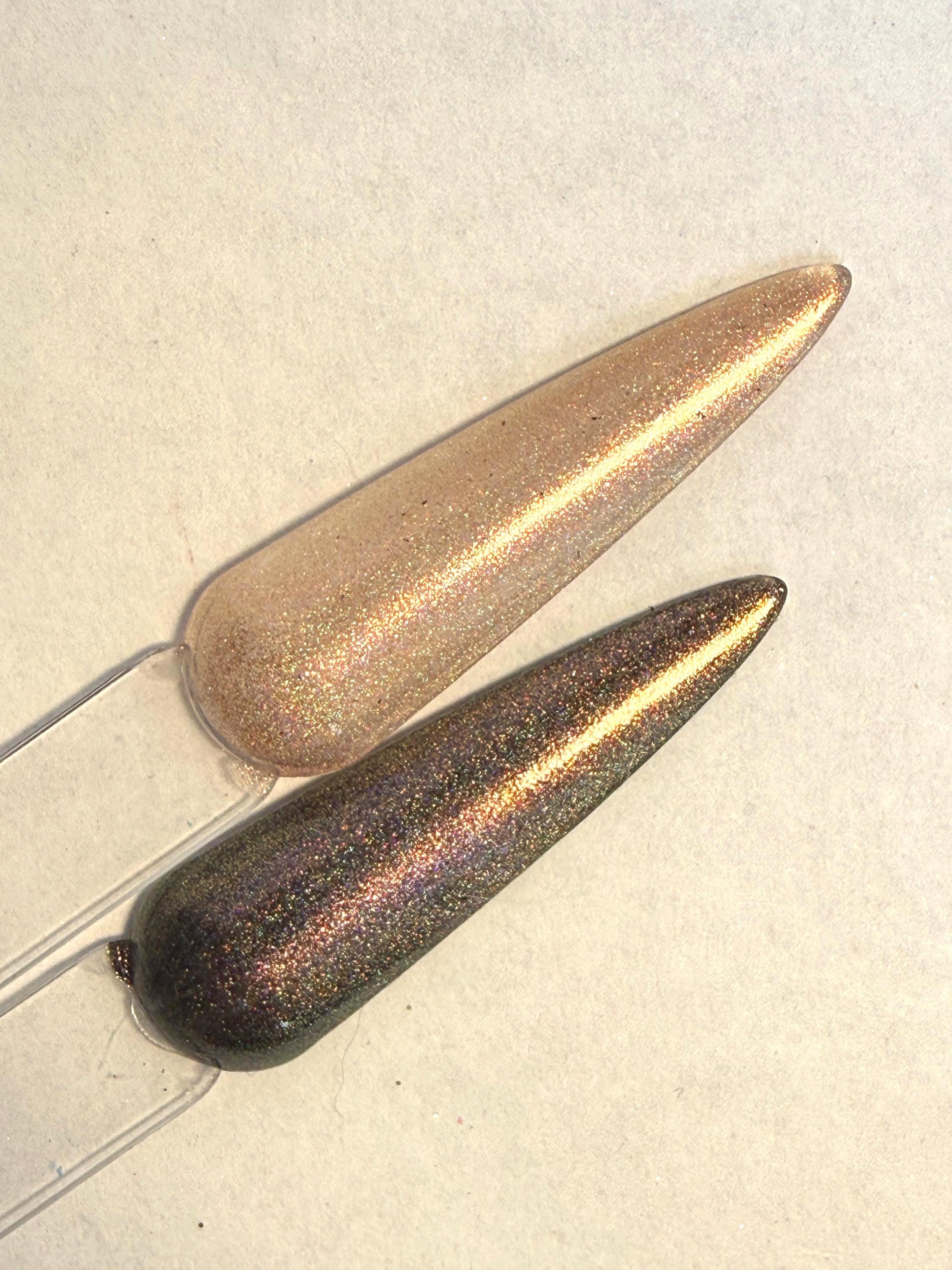 This nail polish comes in either 5 or 15ml bottles and is a warm gold holographic. You will need a magnet to take advantage of the magnetic properties within. It does not come with a magnet but if you'd like me to include one for $1, please check my other listings.