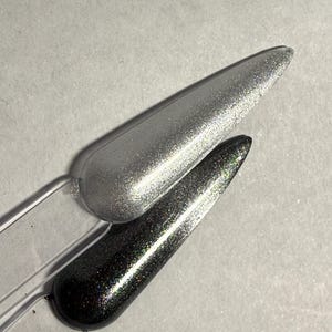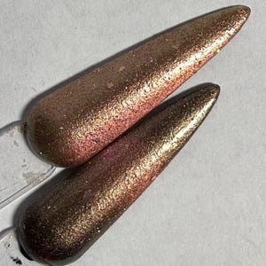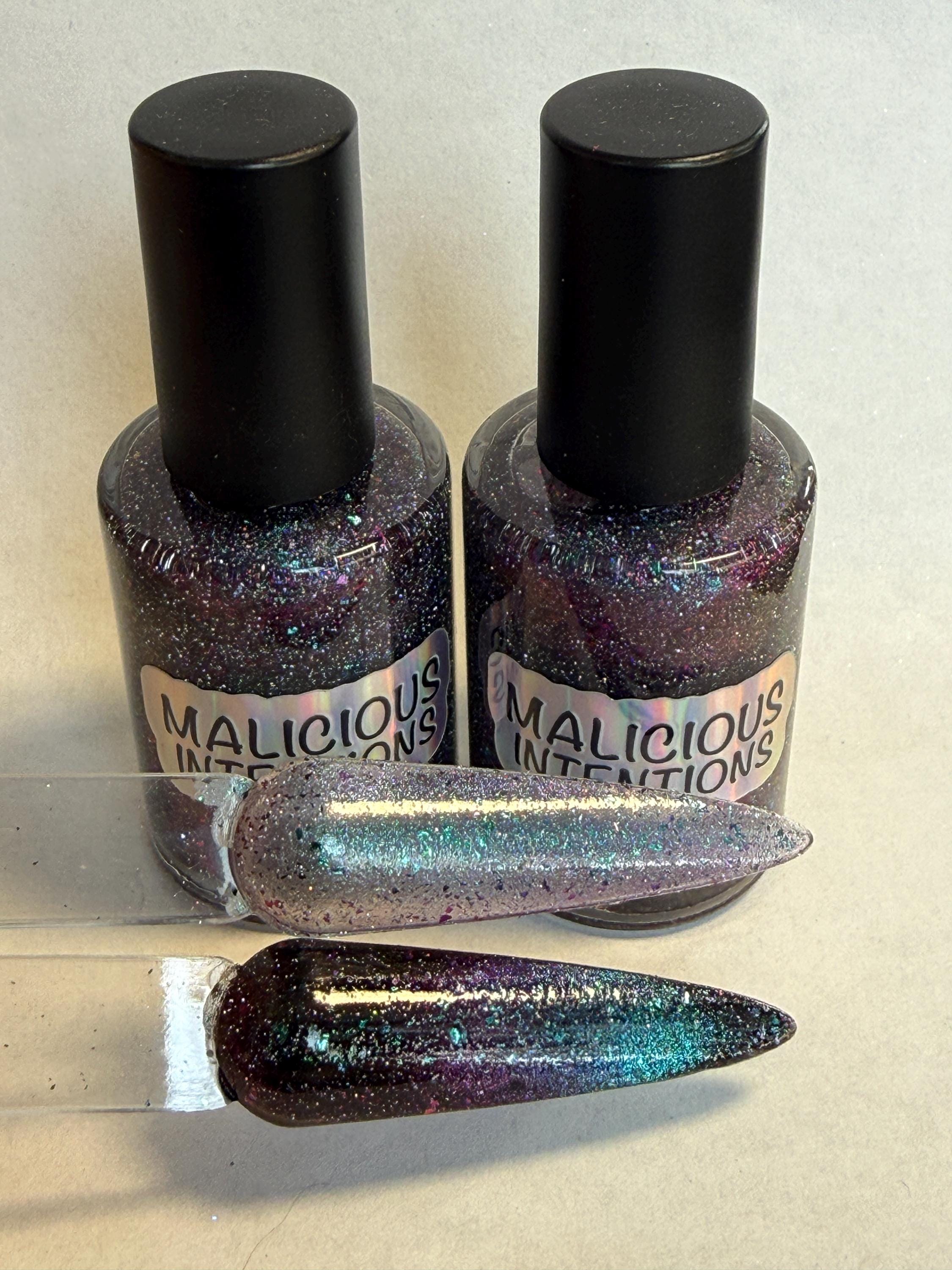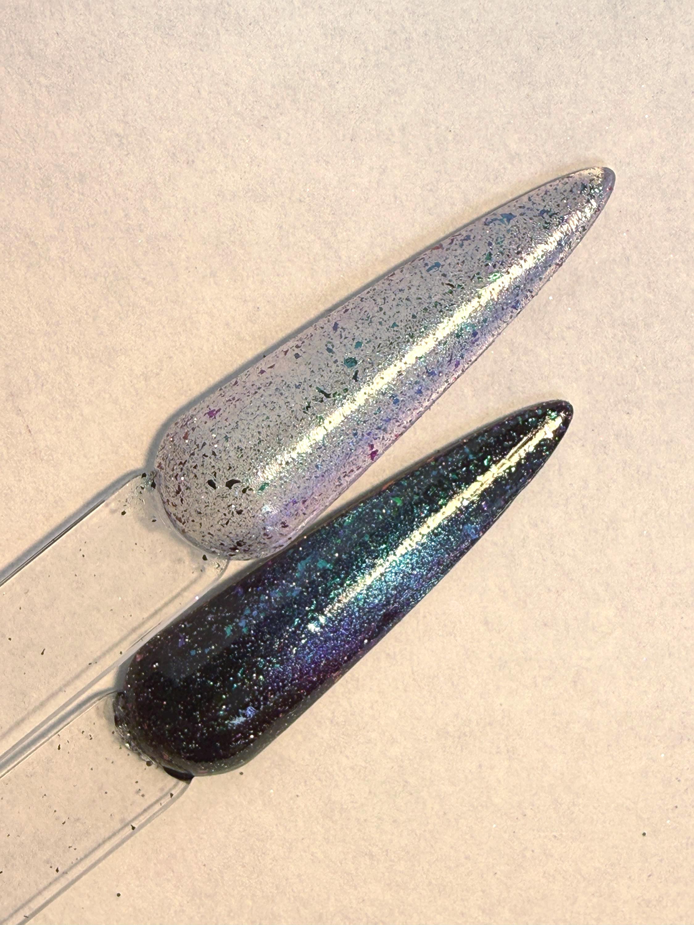 This nail polish comes in either 5 or 15ml bottles and is a green/pink/purple chameleon with matching flakes, holo, and reflective bits. You will need a magnet to take advantage of the magnetic properties within. It does not come with a magnet but if you'd like me to include one for $1, please check my other listings.