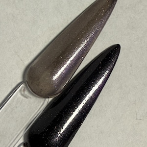 The photos/videos is one coat over a black base and magnetized using the bead method, and the other is two coats on clear, velvetized.