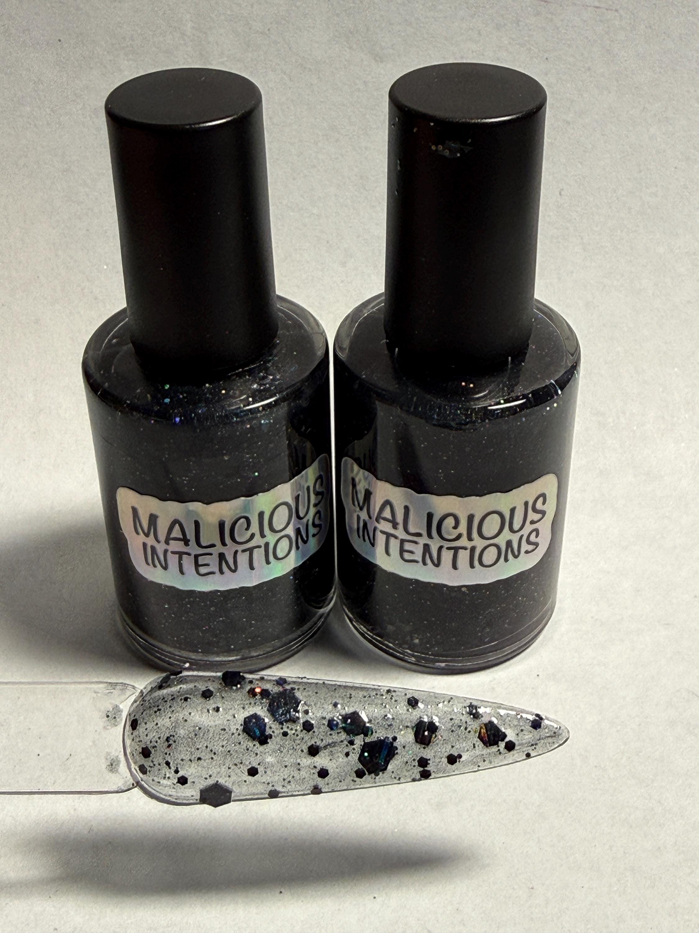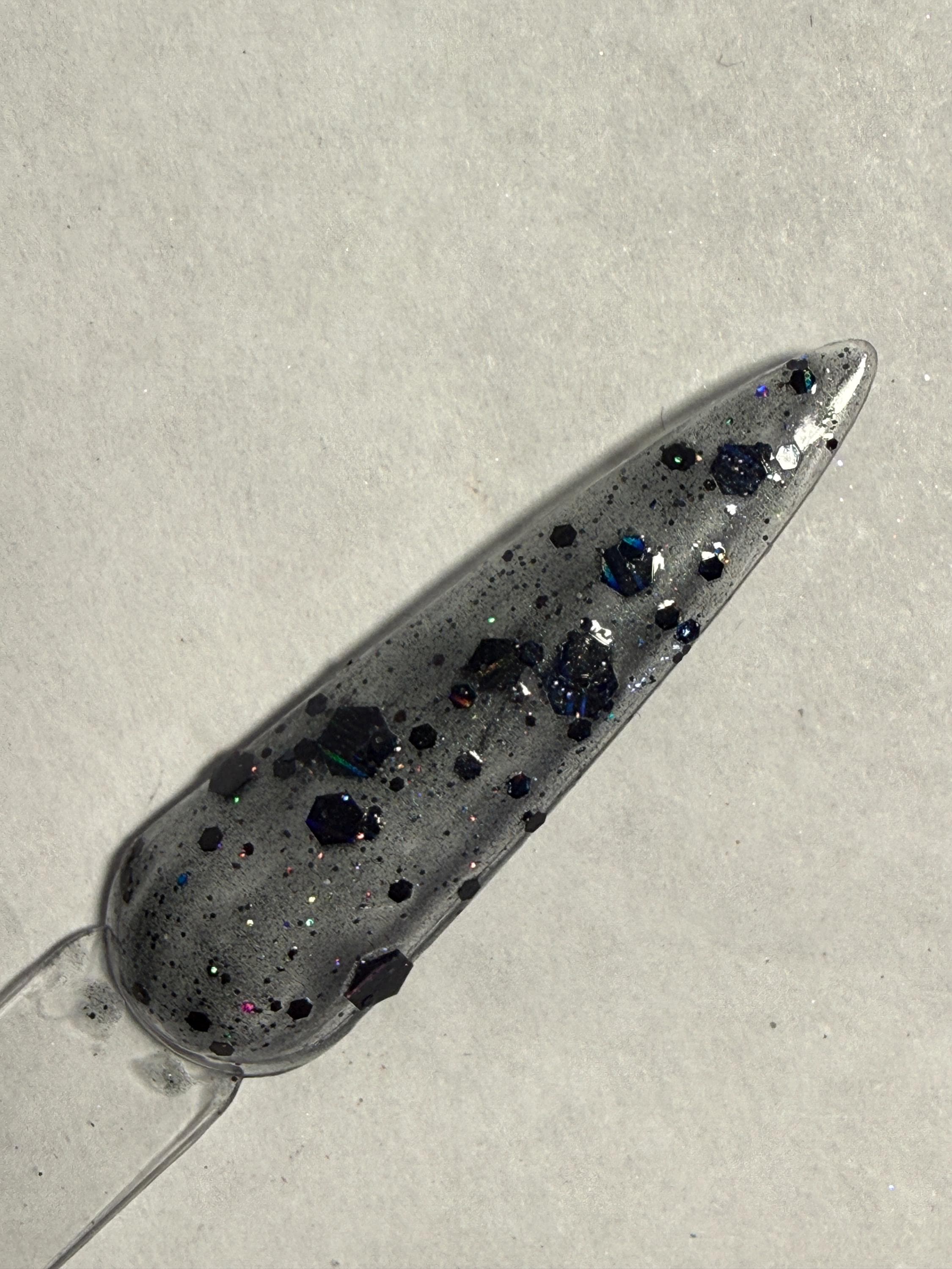 This nail polish comes in either 5 or 15ml bottles and has black holographic glitter of various sizes on a sheer black base.