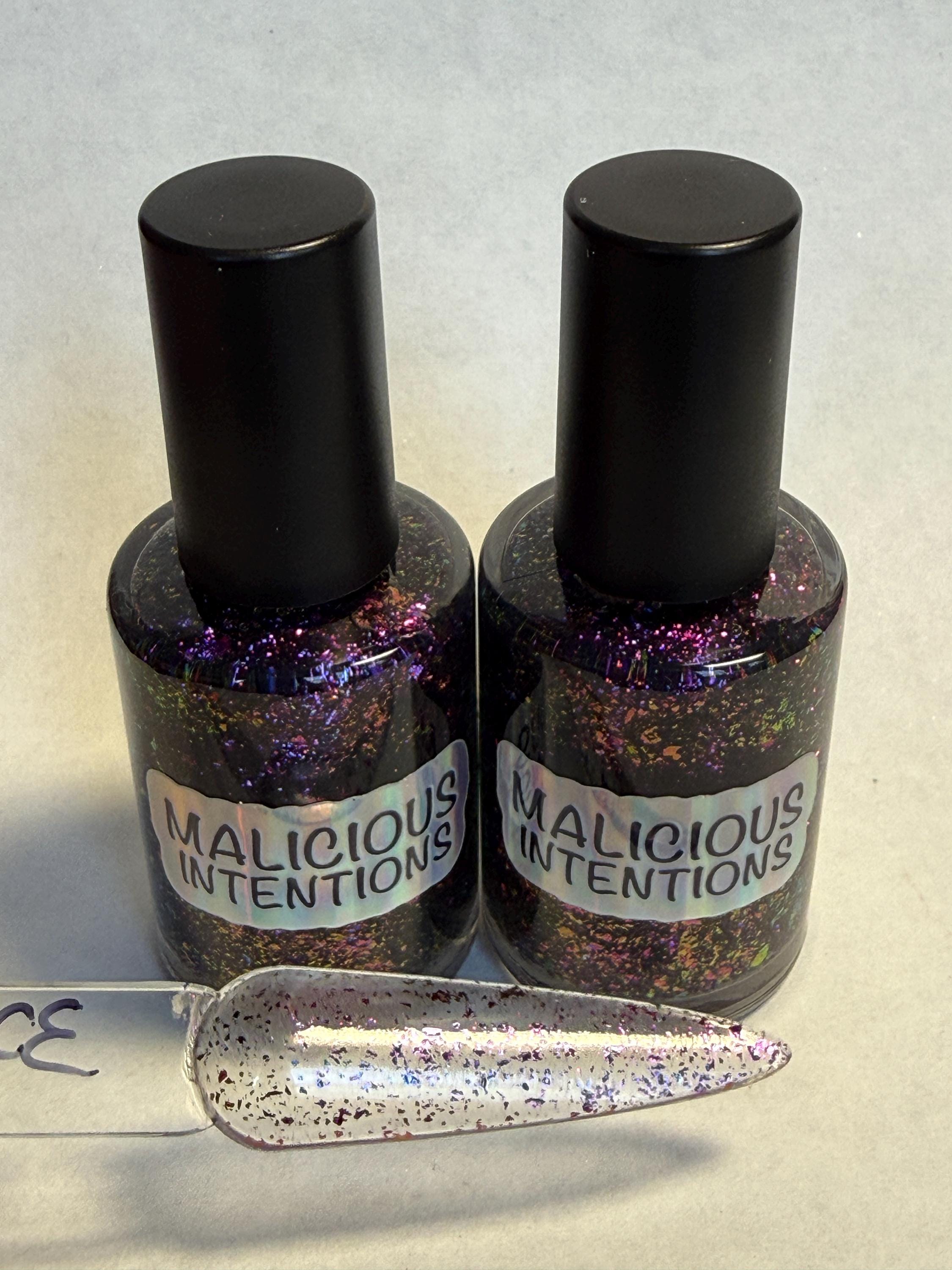 This nail polish comes in either 5 or 15ml bottles and has purple/orange/gold chameleon flakes.