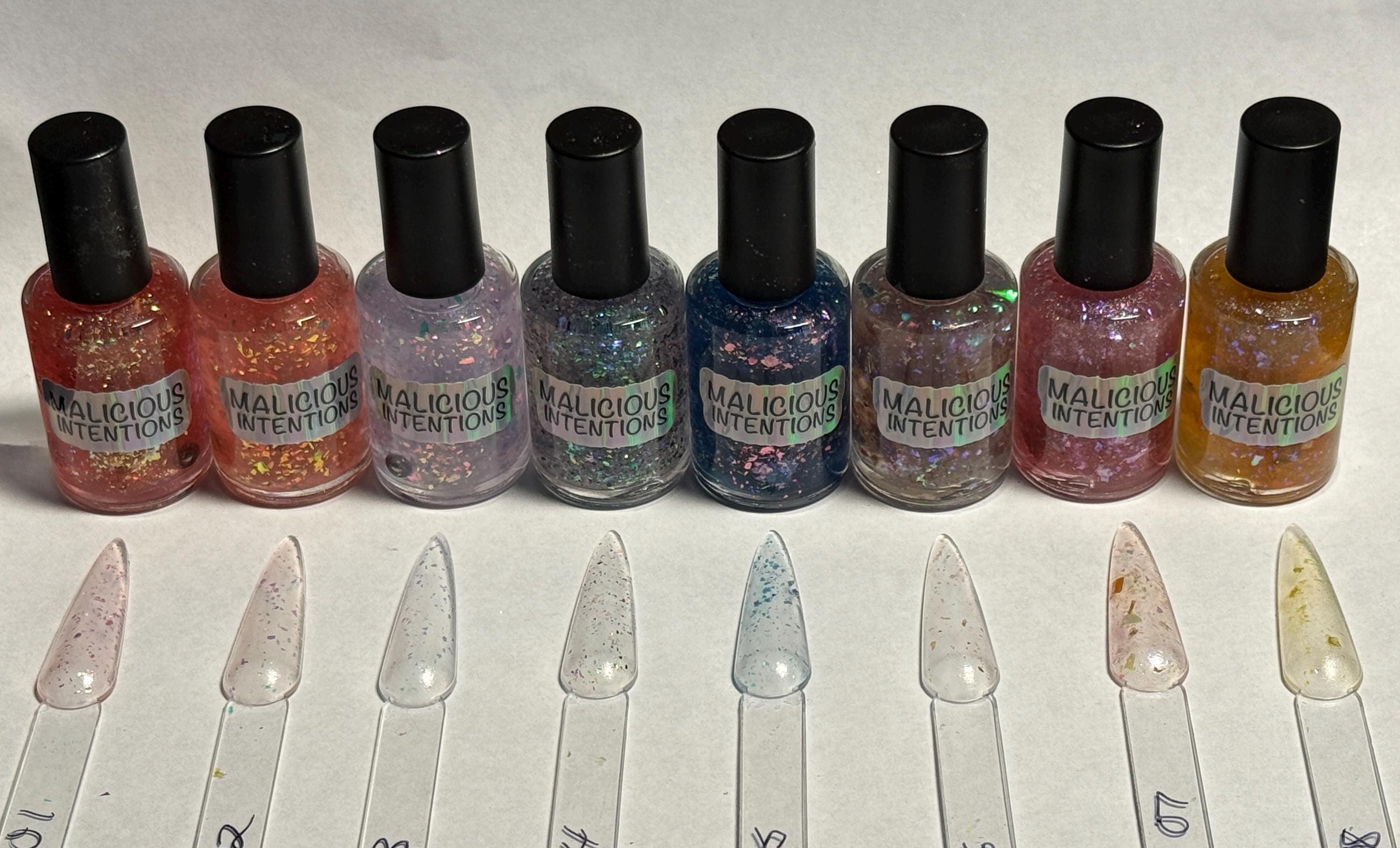 This nail polish series comes in either 5 or 15ml bottles and they each have foil flakes of different colors in them.
