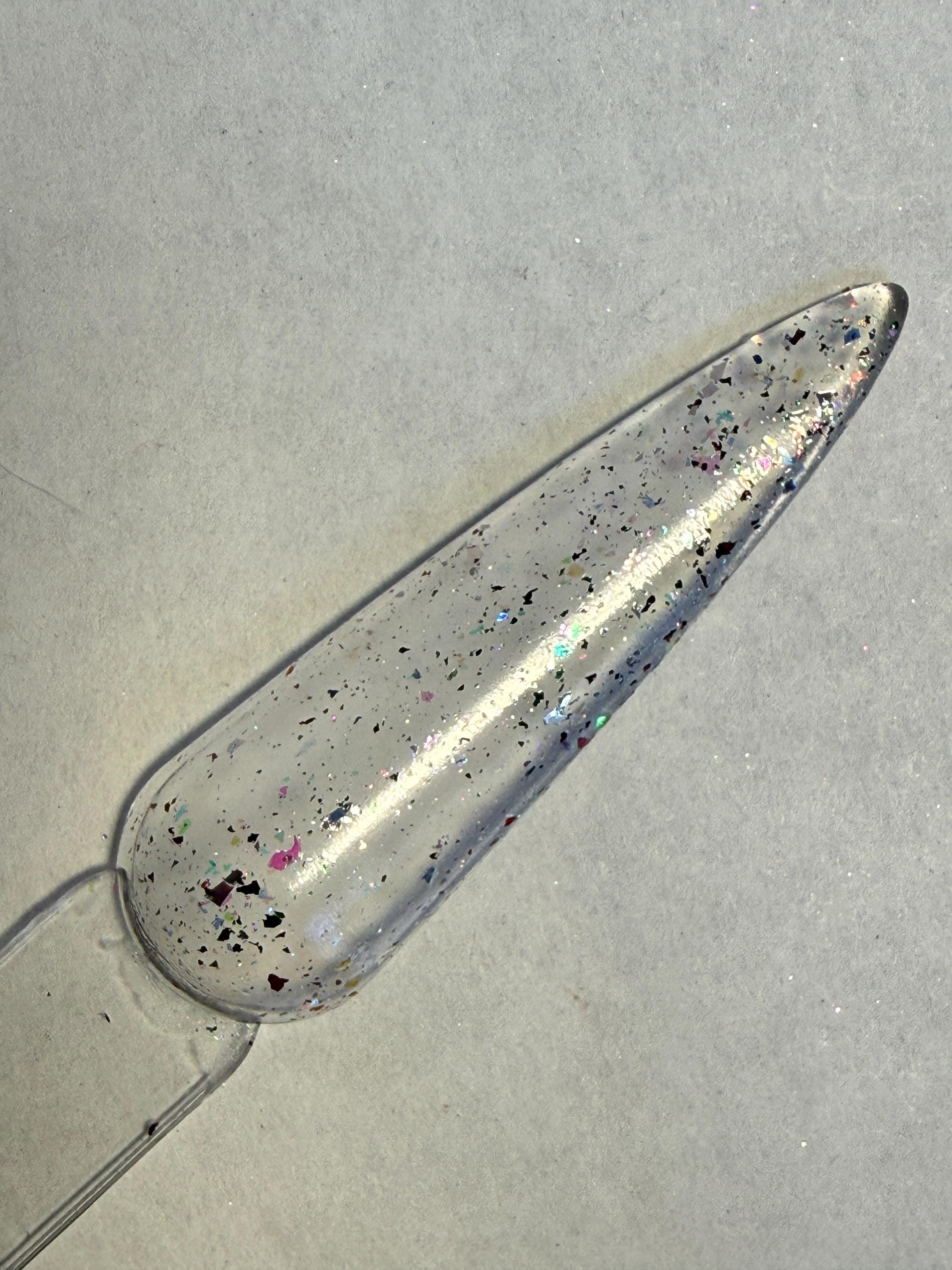 This nail polish comes in either 5 or 15ml bottles and has iridescent flakes as well as some holo and reflective bits.
