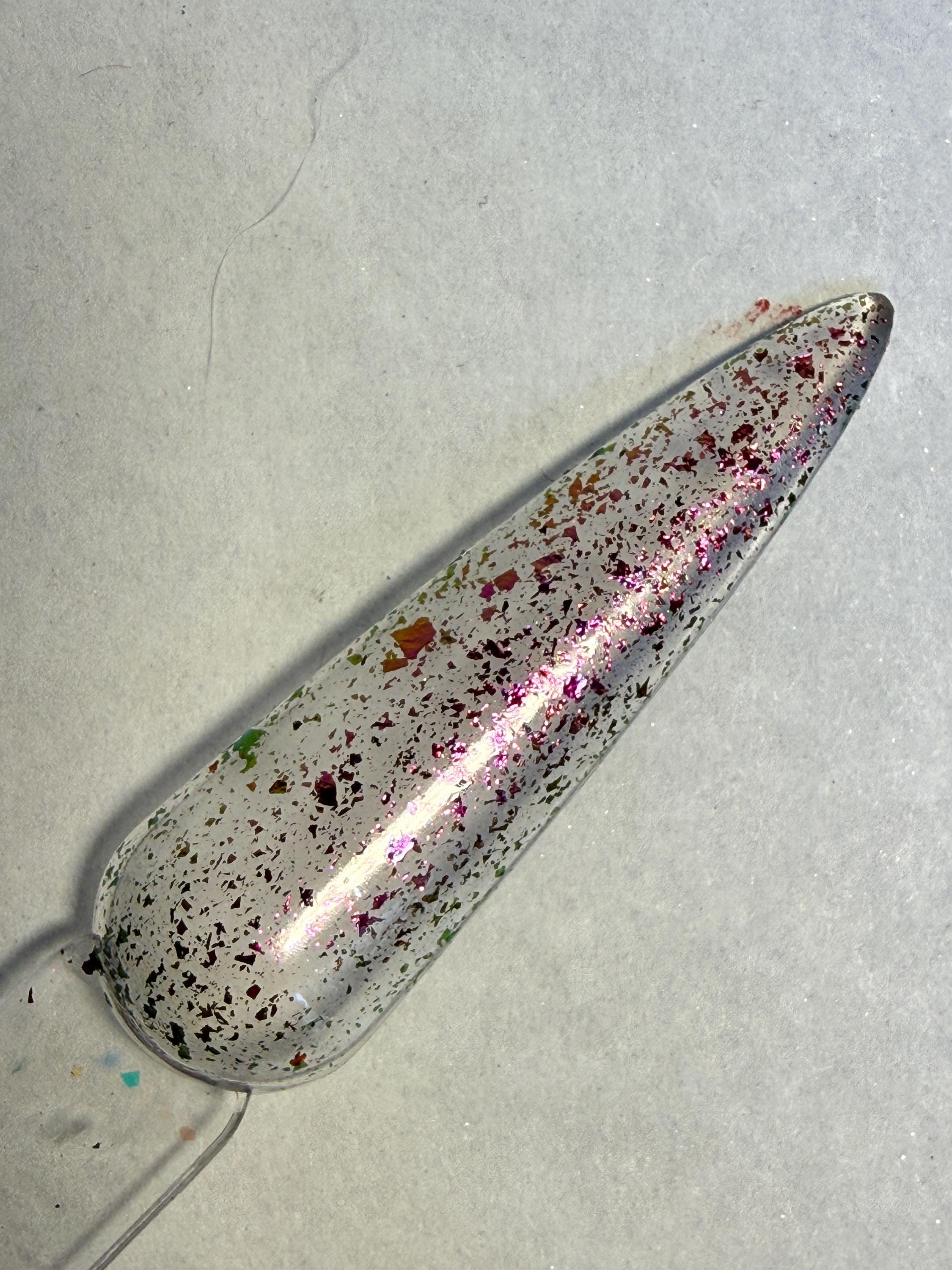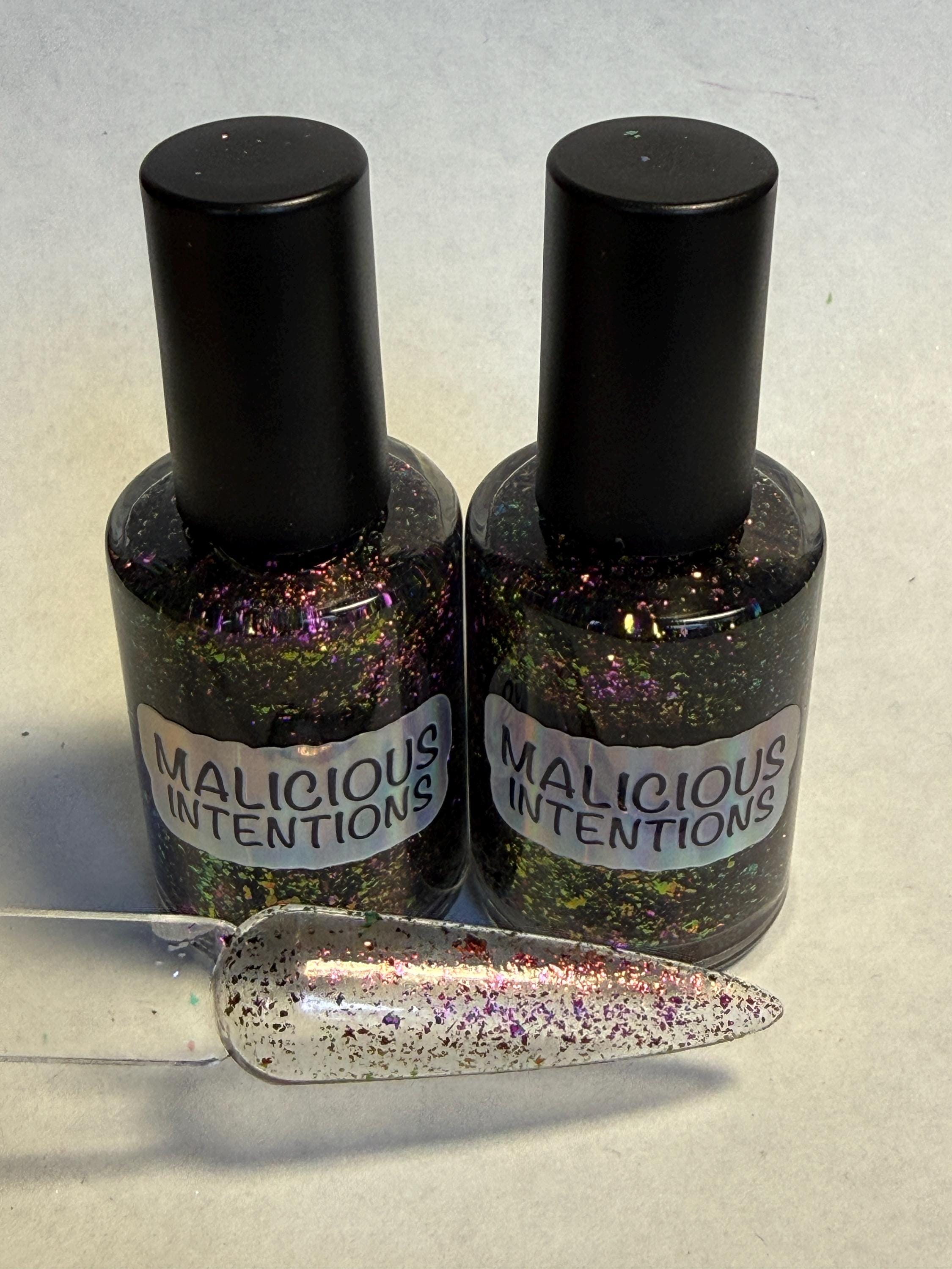 This nail polish comes in either 5 or 15ml bottles and has green/orange shifting chameleon flakes in it.