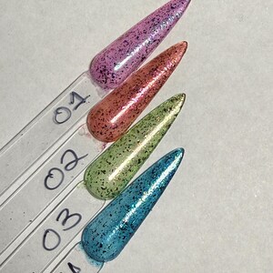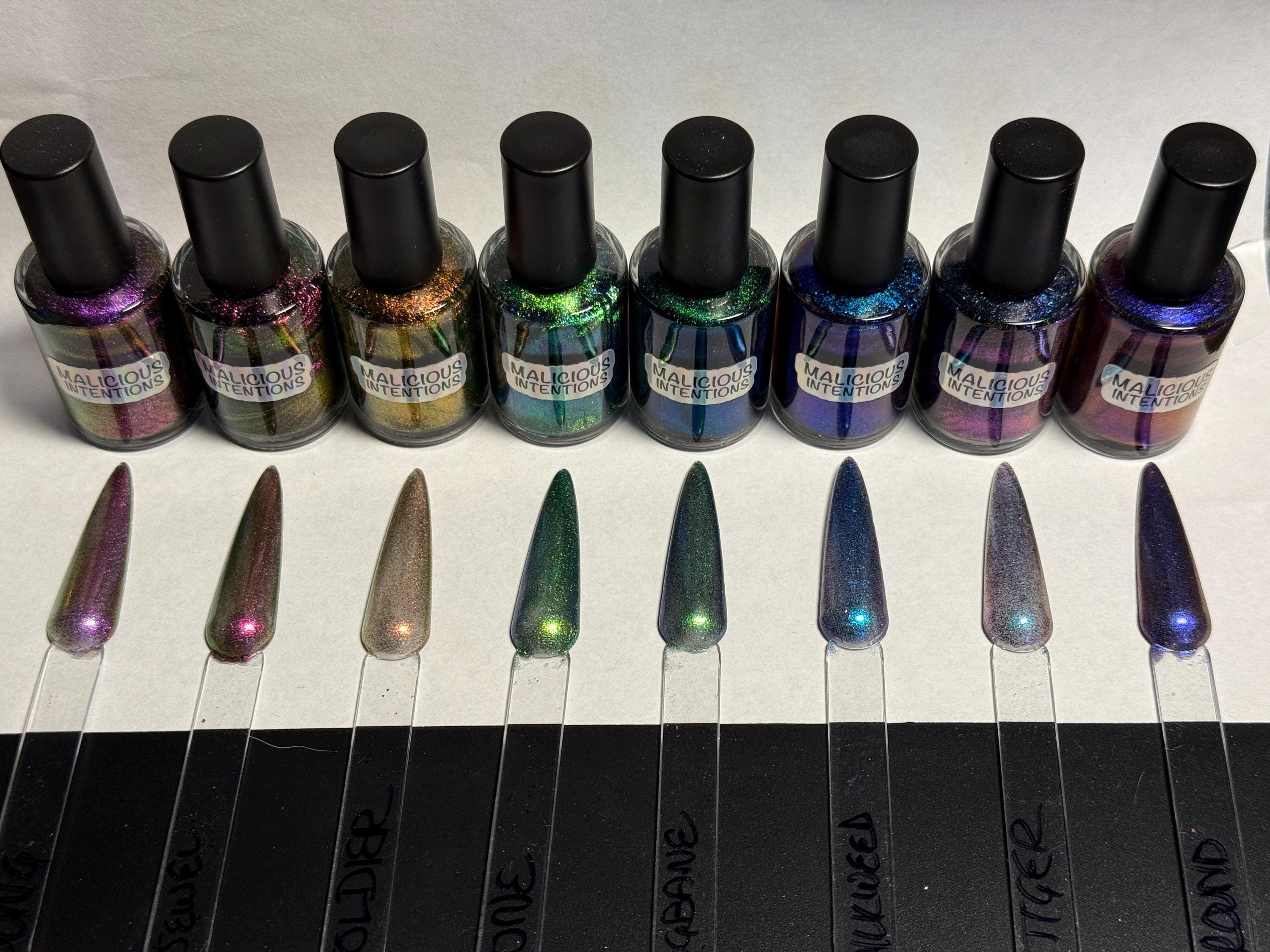 These nail polishes come in either 5 or 15ml bottles and are shimmery chameleon multi chromes with a holographic sheen. Two coats is not quite 100% opaque but it's close.