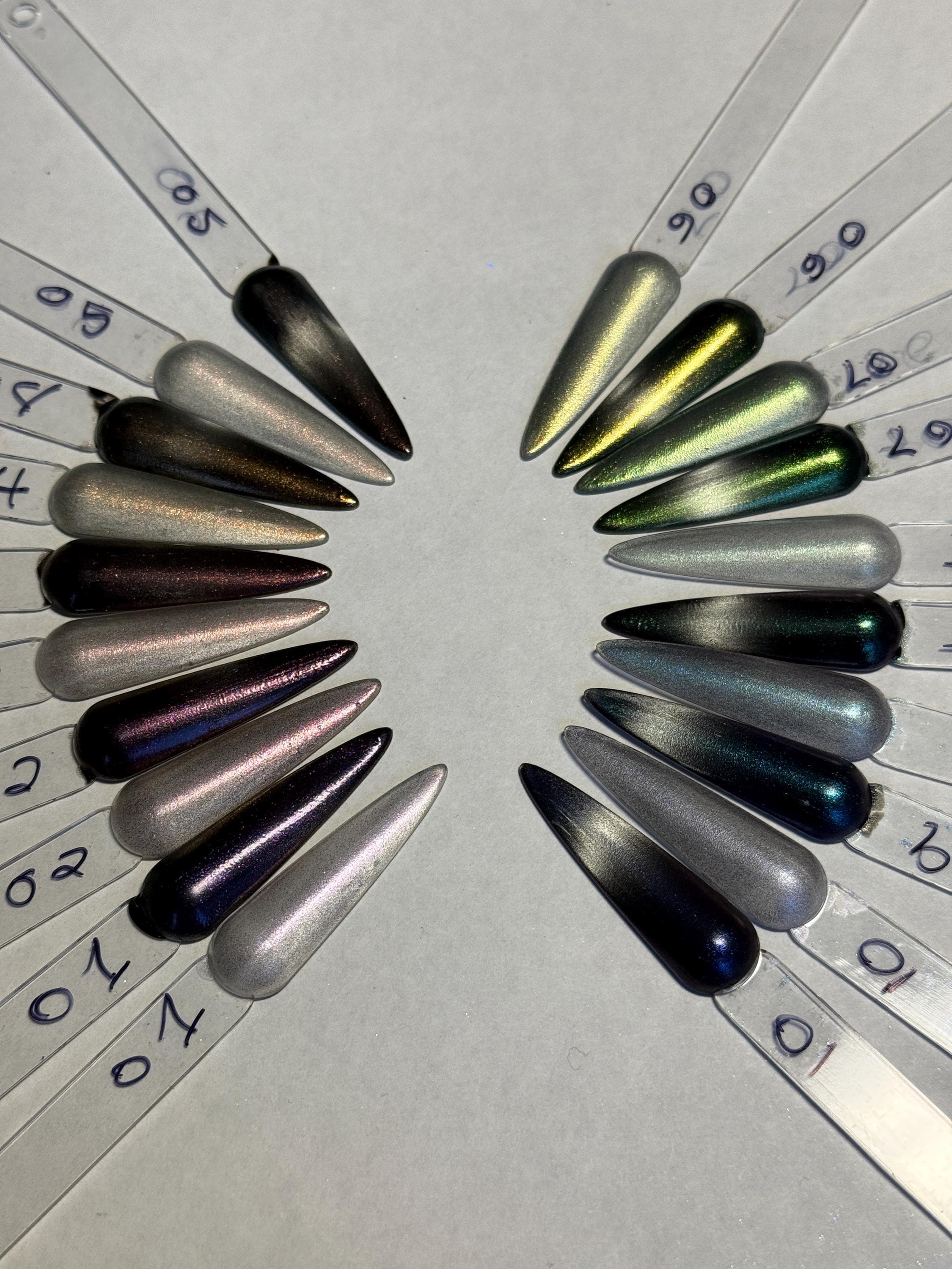 The photos/videos is one coat over a black base and magnetized using the bead method, and the other is two coats on clear, velvetized.