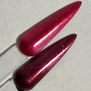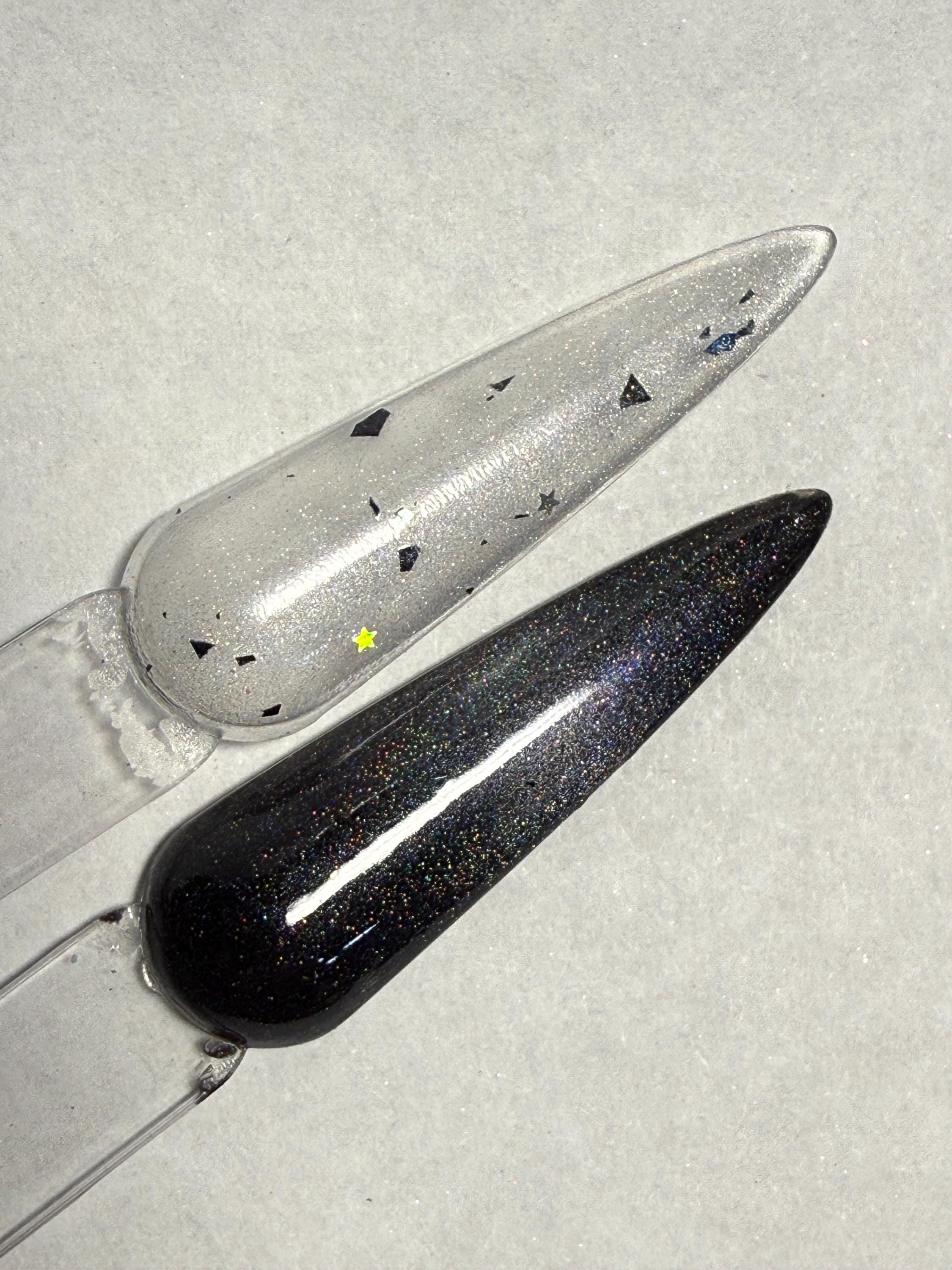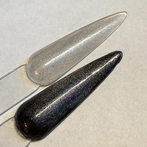 This nail polish comes in either 5 or 15ml bottles and has silver and black holo flakes and a shimmery holo base that is magnetic.