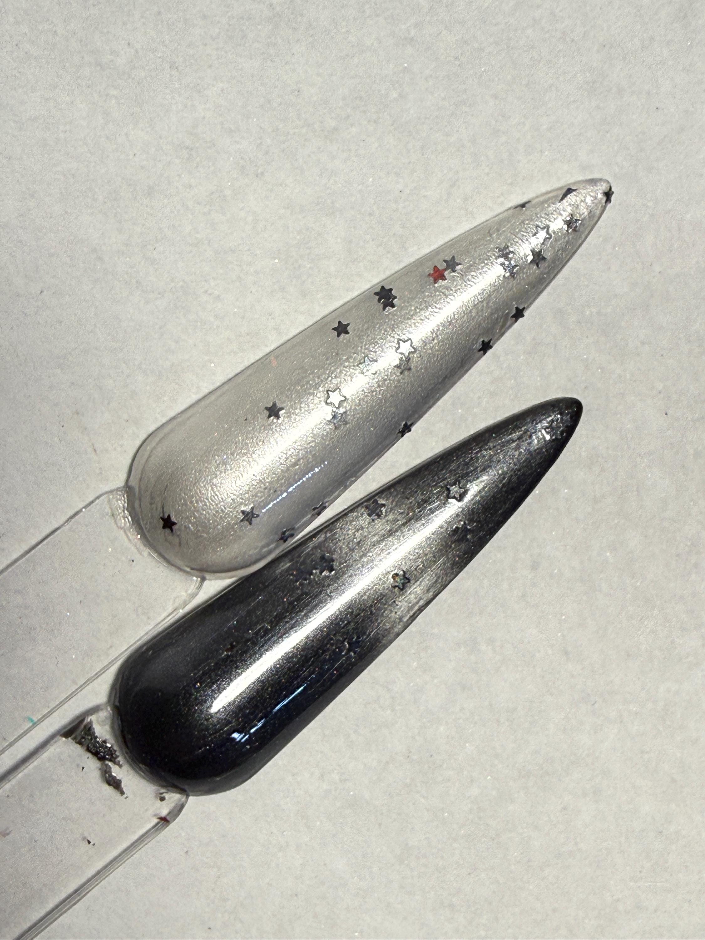 This nail polish comes in either 5 or 15ml bottles and has silver and black holo stars and a shimmery silver base that is magnetic.