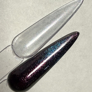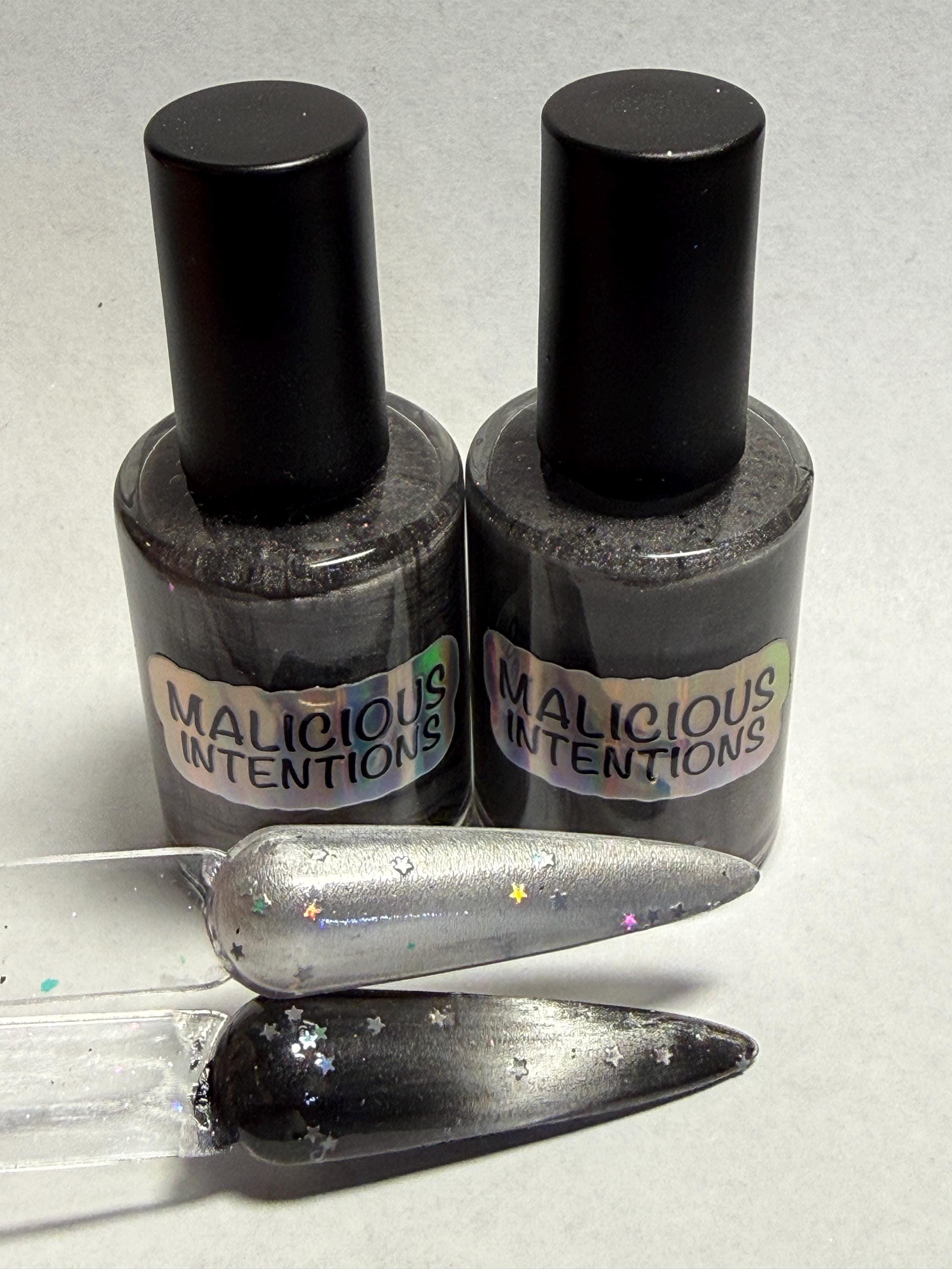 This nail polish comes in either 5 or 15ml bottles and has silver holo stars and a shimmery silver base that is magnetic.