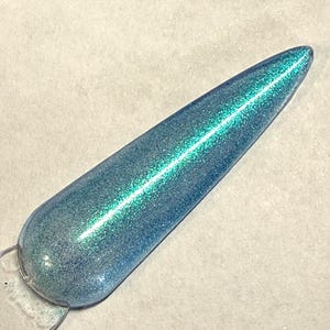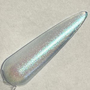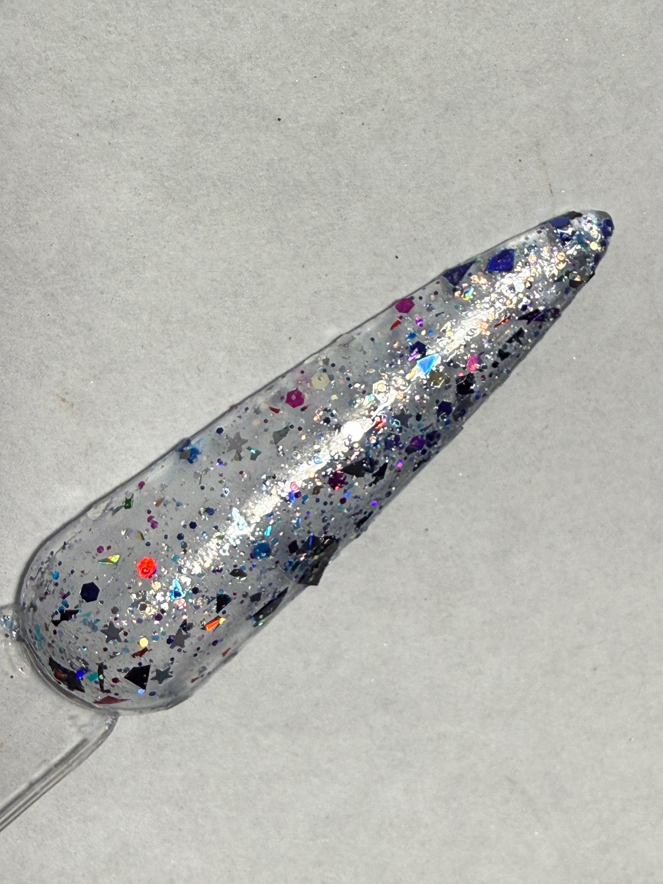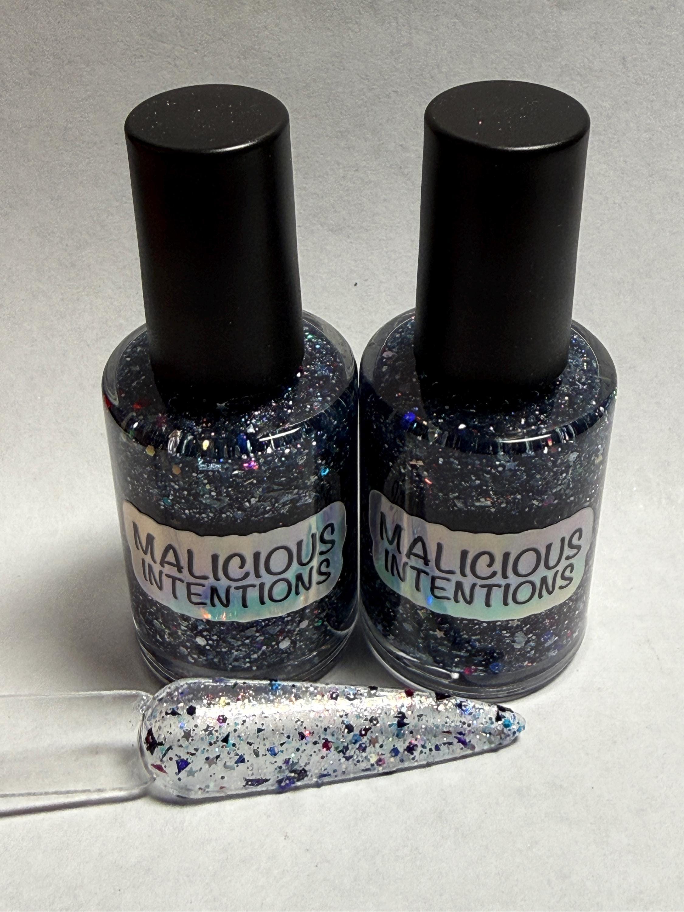 This nail polish comes in either 5 or 15ml bottles and has a purple, blue, red, and silver holo flakes and glitters along with some tiny holo stars on a holo base.