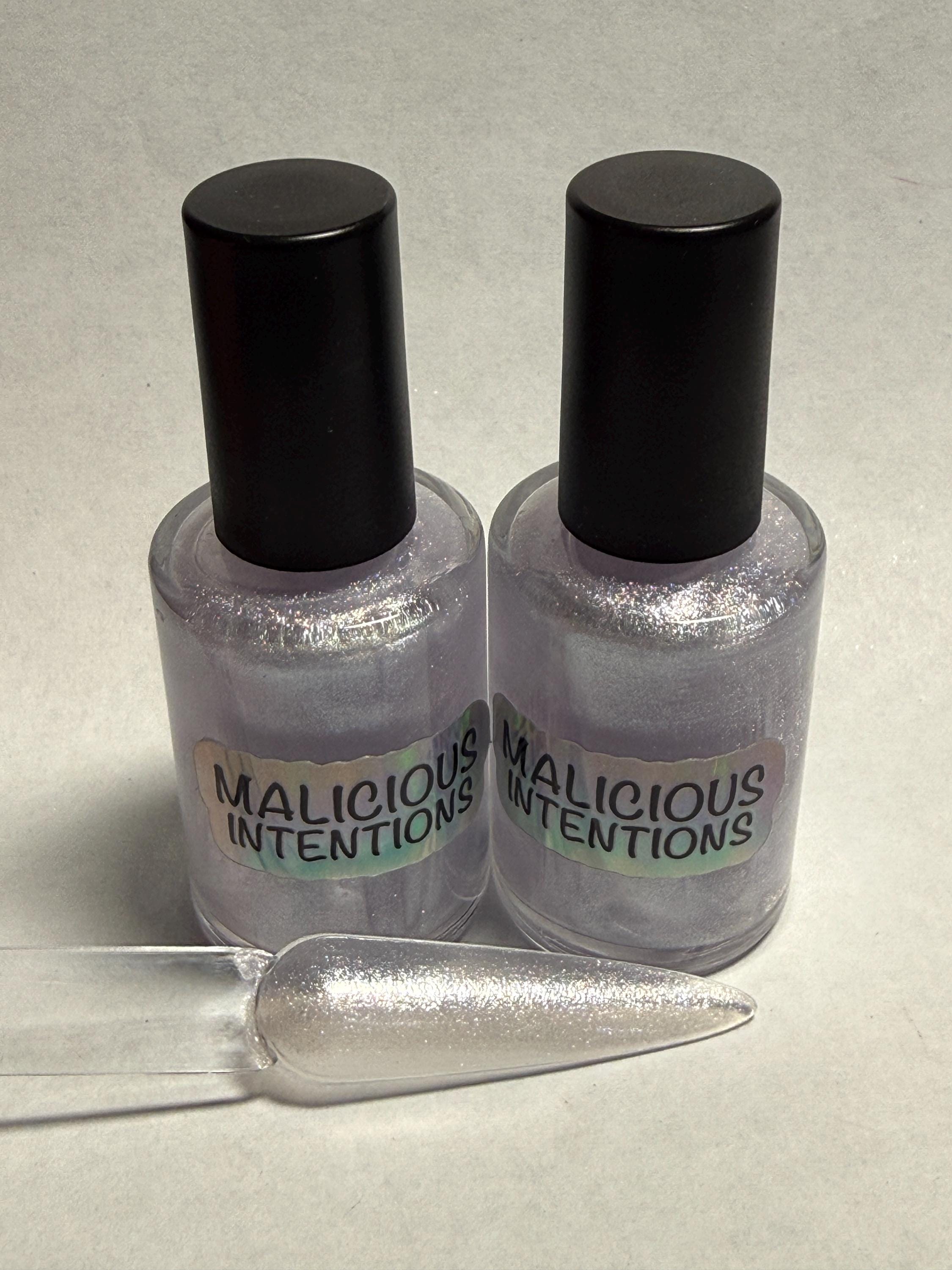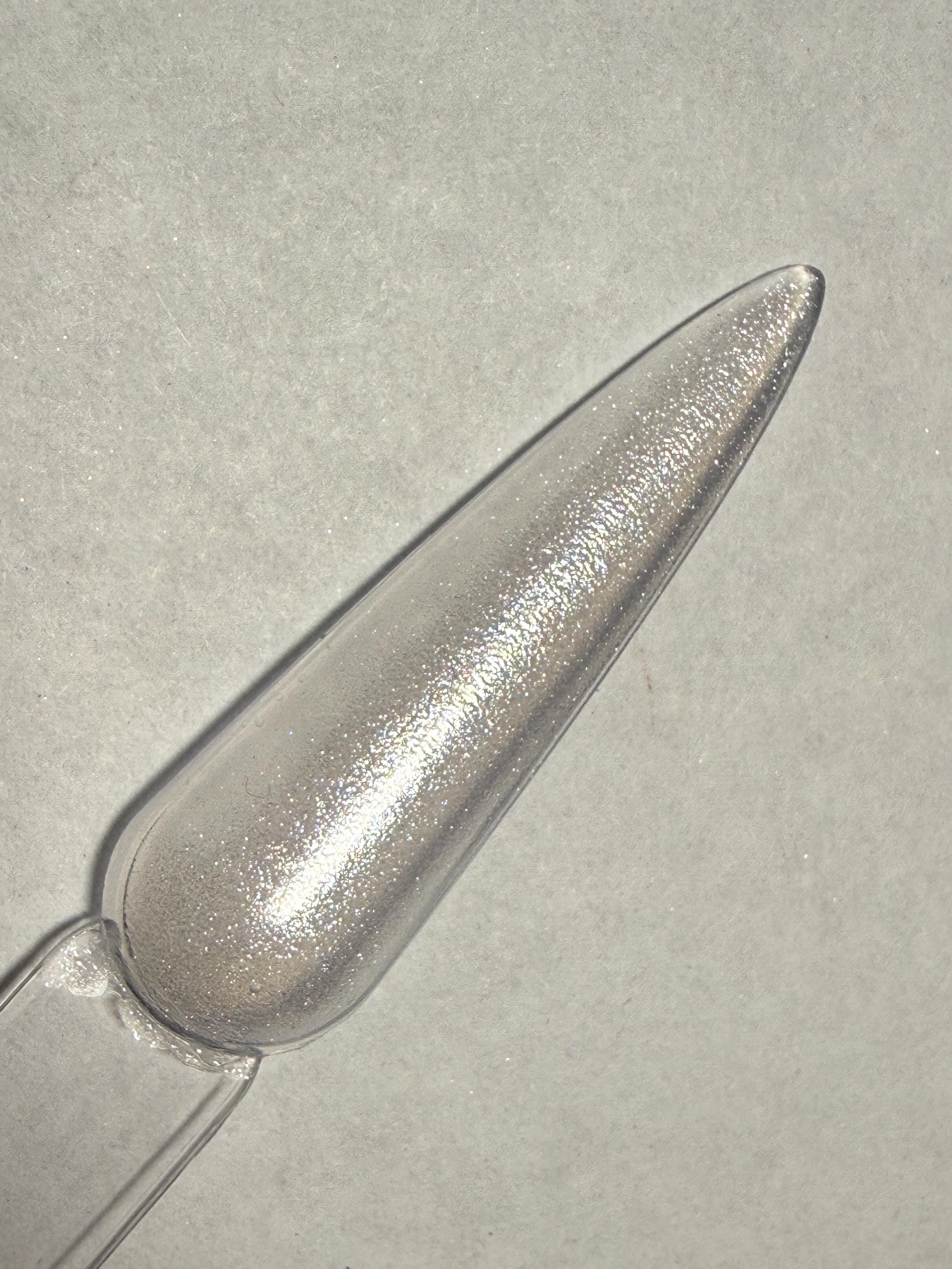 This nail polish comes in either 5 or 15ml bottles and is a very sheer white shimmer chrome. A donut look without fussing with a powder.