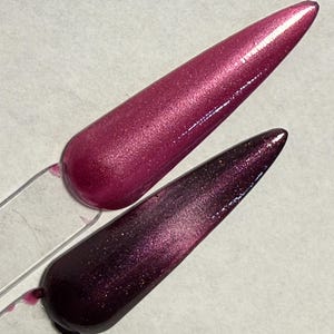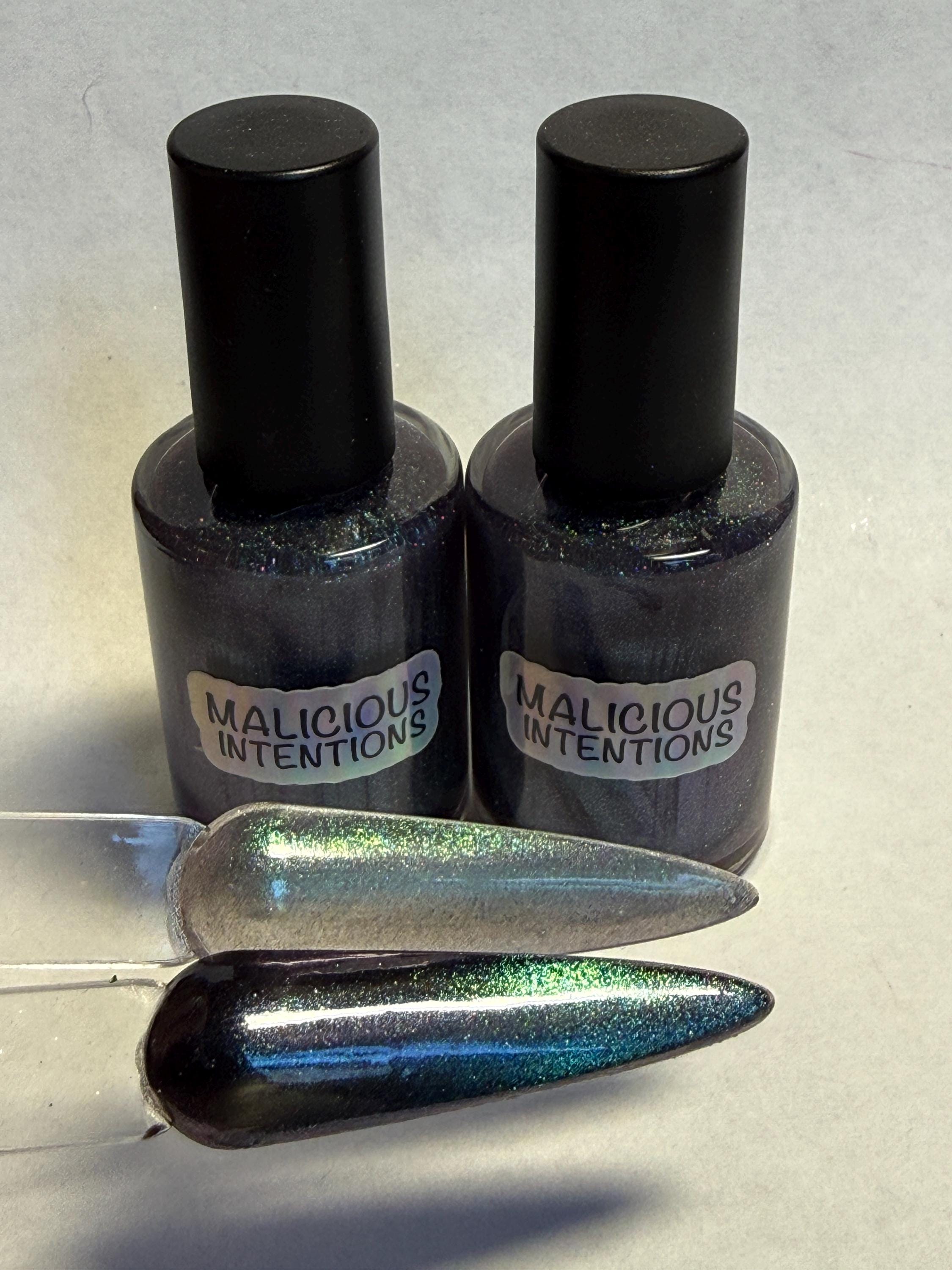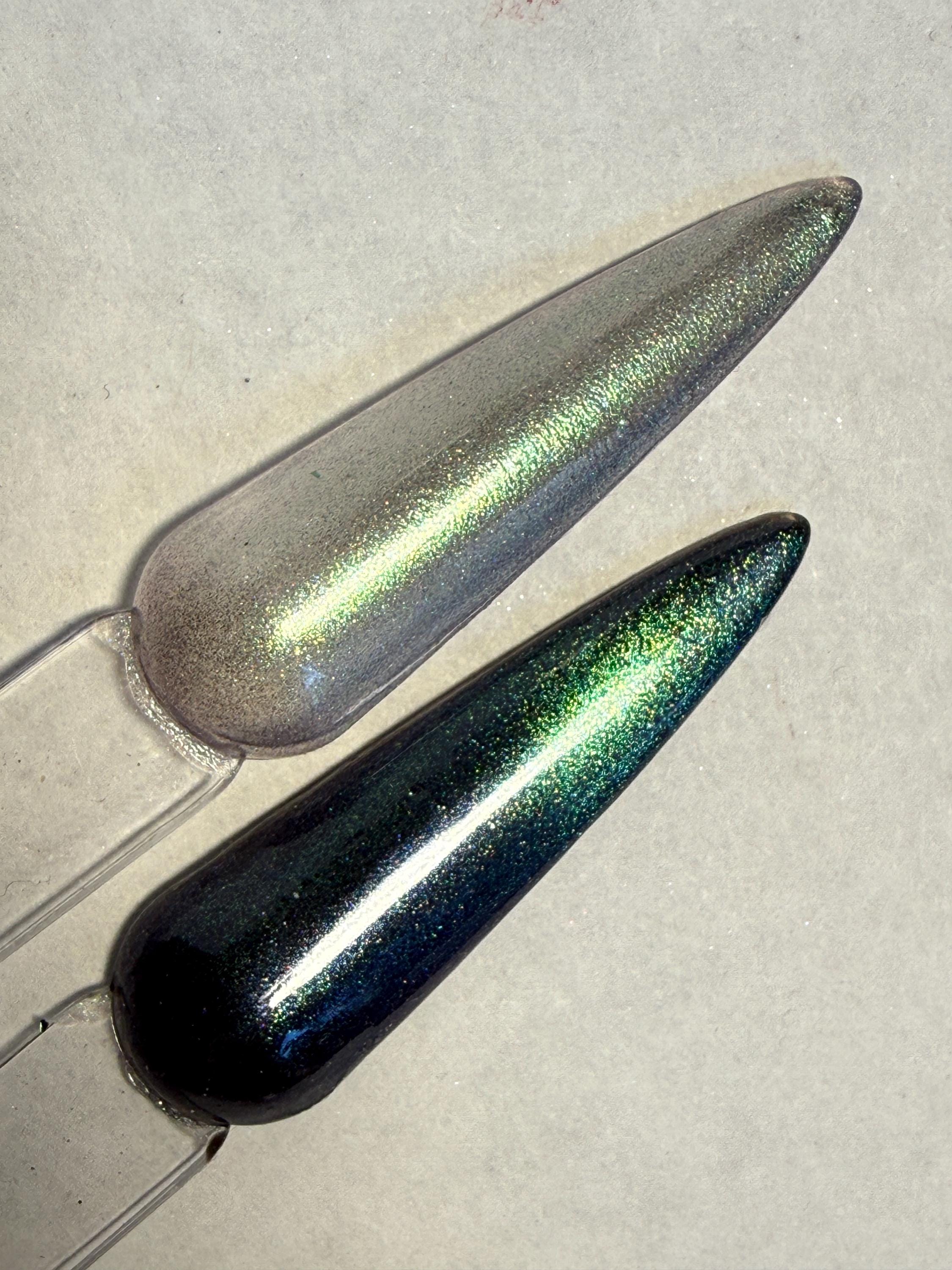 This nail polish comes in either 5 or 15ml bottles and is a green\purple\silver chameleon magnetic. You will need a magnet to take advantage of the magnetic properties within. It does not come with a magnet but if you'd like me to include one for $1, please check my other listings.