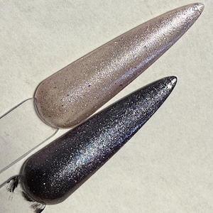 The photos/videos are one coat over a black base and magnetized using the bead method, and the other is two coats on clear, velvetized.